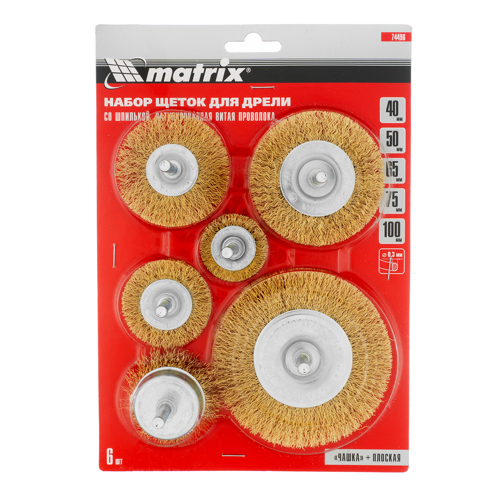 Набор щеток Matrix 74496 со шпильками диаметром 6 мм состоит из 6 насадок для дрели: 5 плоских диаметром 40-50-65-75-100 мм и «чашки» диаметром 50 мм. Они используются на скорости до 4500 об/мин. Плоские щетки удобны для обработки труднодоступных мест, углов и пазов, а чашка оптимальна для ровных поверхностей. Набор пригодится для удаления ржавчины, загрязнений, старых лакокрасочных покрытий.