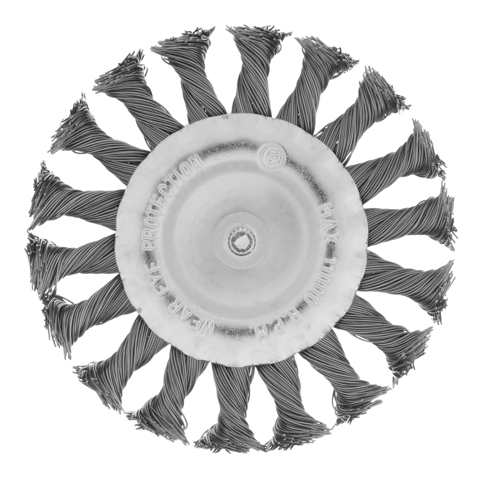 - Эффективность и износостойкость — щетина из крученой стальной проволоки диаметром 0,5 мм успешно справляется с толстым слоем ржавчины или лакокрасочного покрытия.