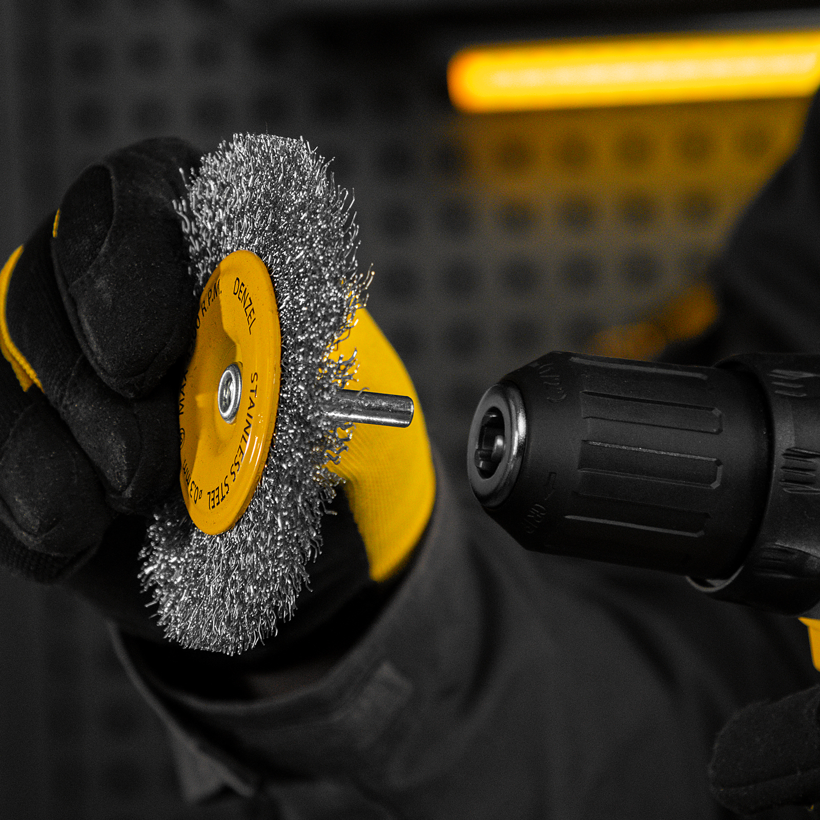 - Быстрая подготовка к работе — щетка имеет хвостовик диаметром 6 мм для установки в патрон дрели.