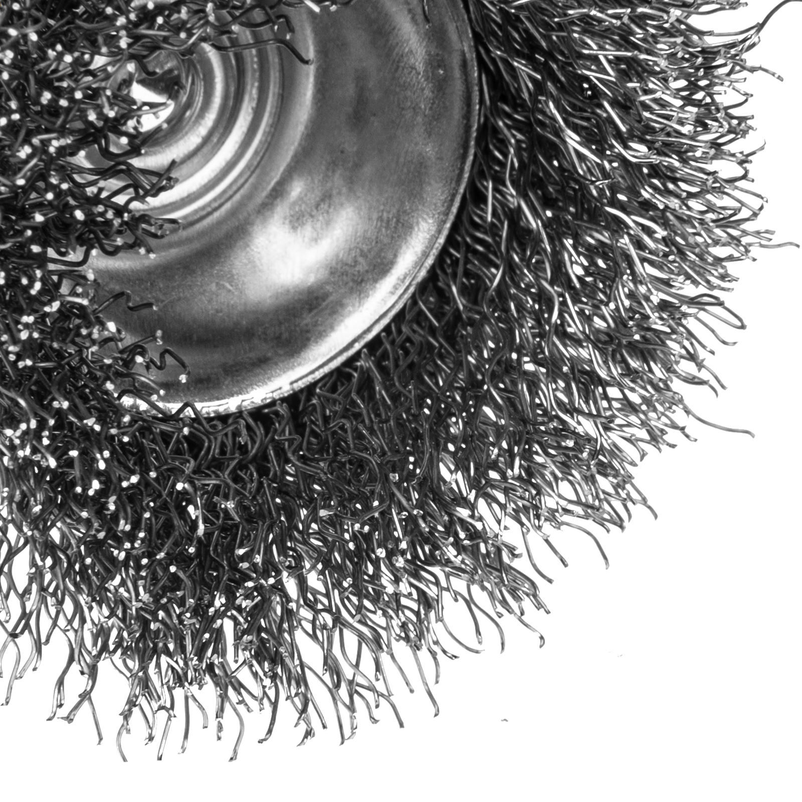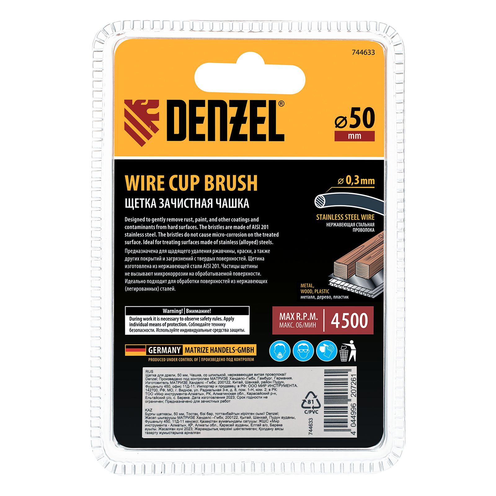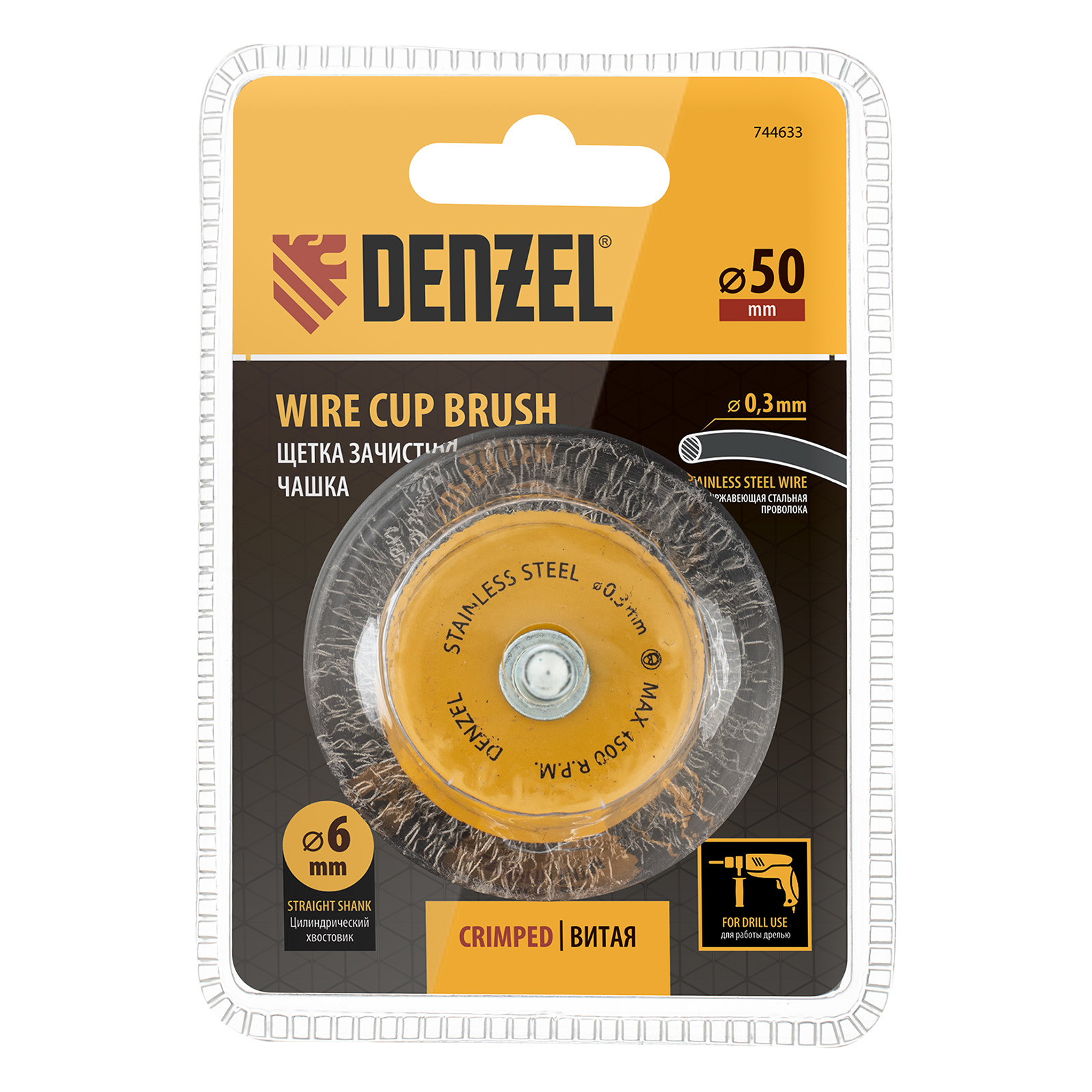 Щетка для дрели «Чашка» Denzel 744633 диаметром 50 мм, со шпилькой и щетиной из нержавеющей витой проволоки, используется для щадящей обработки плоских твердых поверхностей из металла, древесины, пластика, идеально подходит для нержавеющей стали. Оптимальна для снятия тонкого слоя старой краски, ржавчины, удаления загрязнений. Имеет хвостовик диаметром 6 мм и устанавливается в патрон дрели или прямошлифовальной машины (ПШМ).