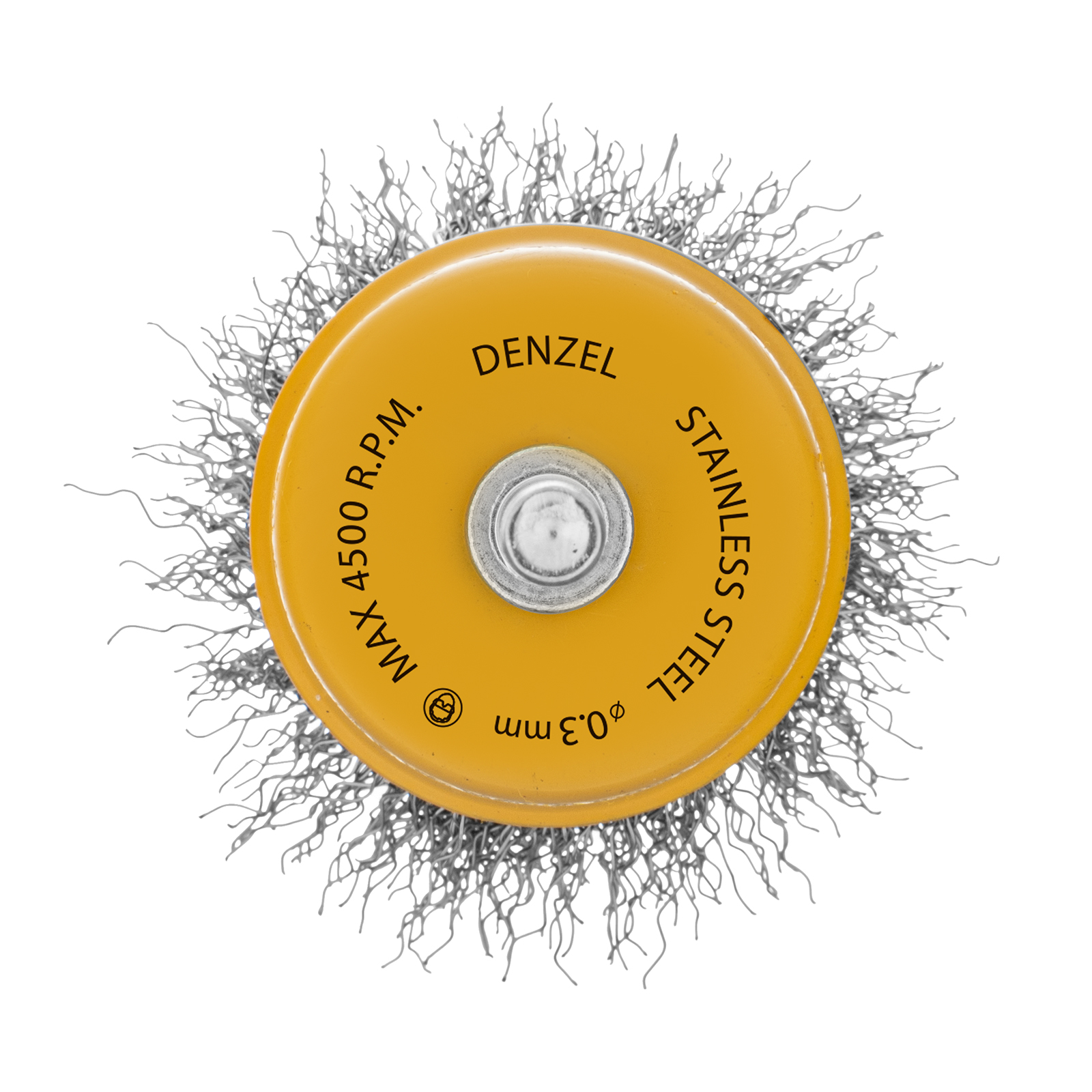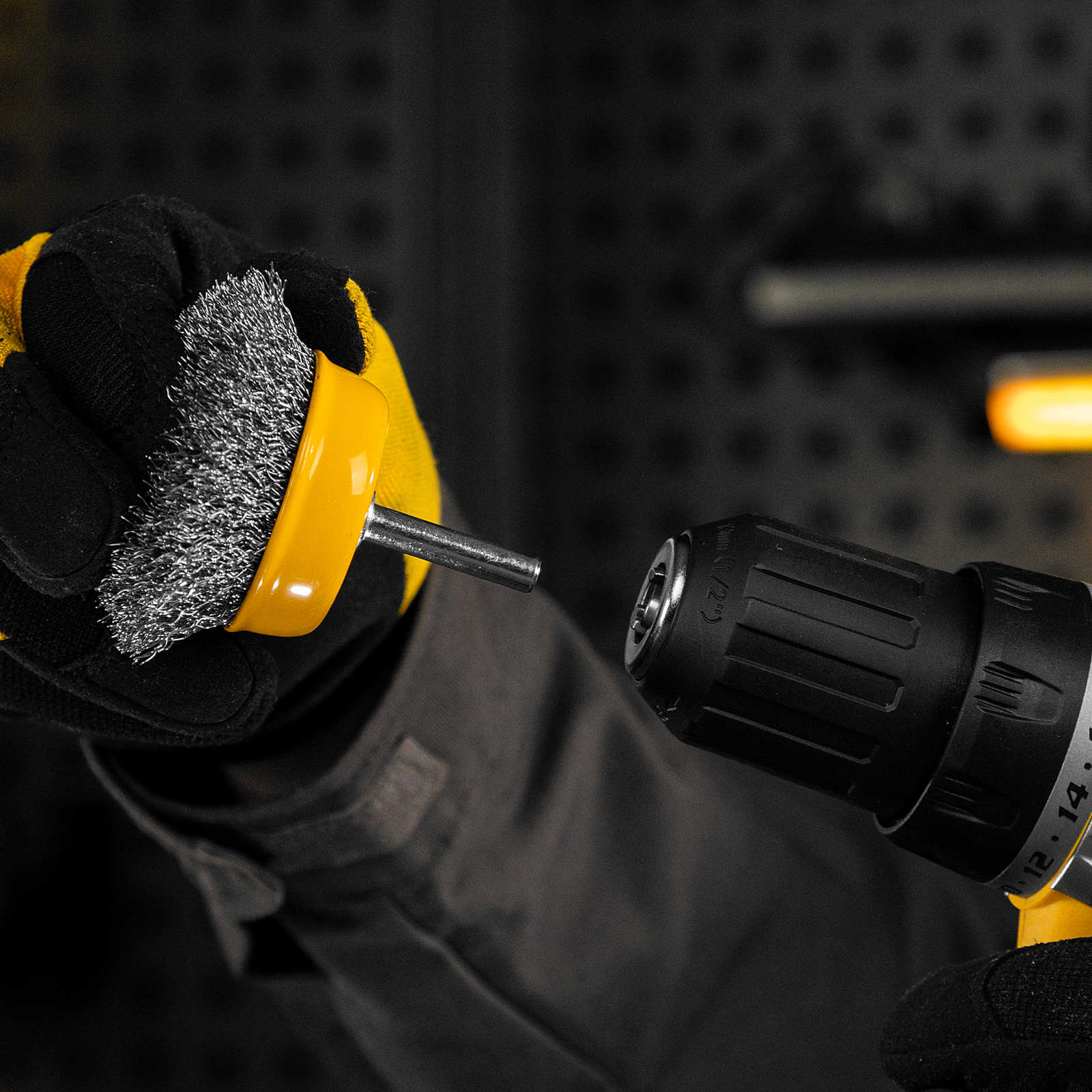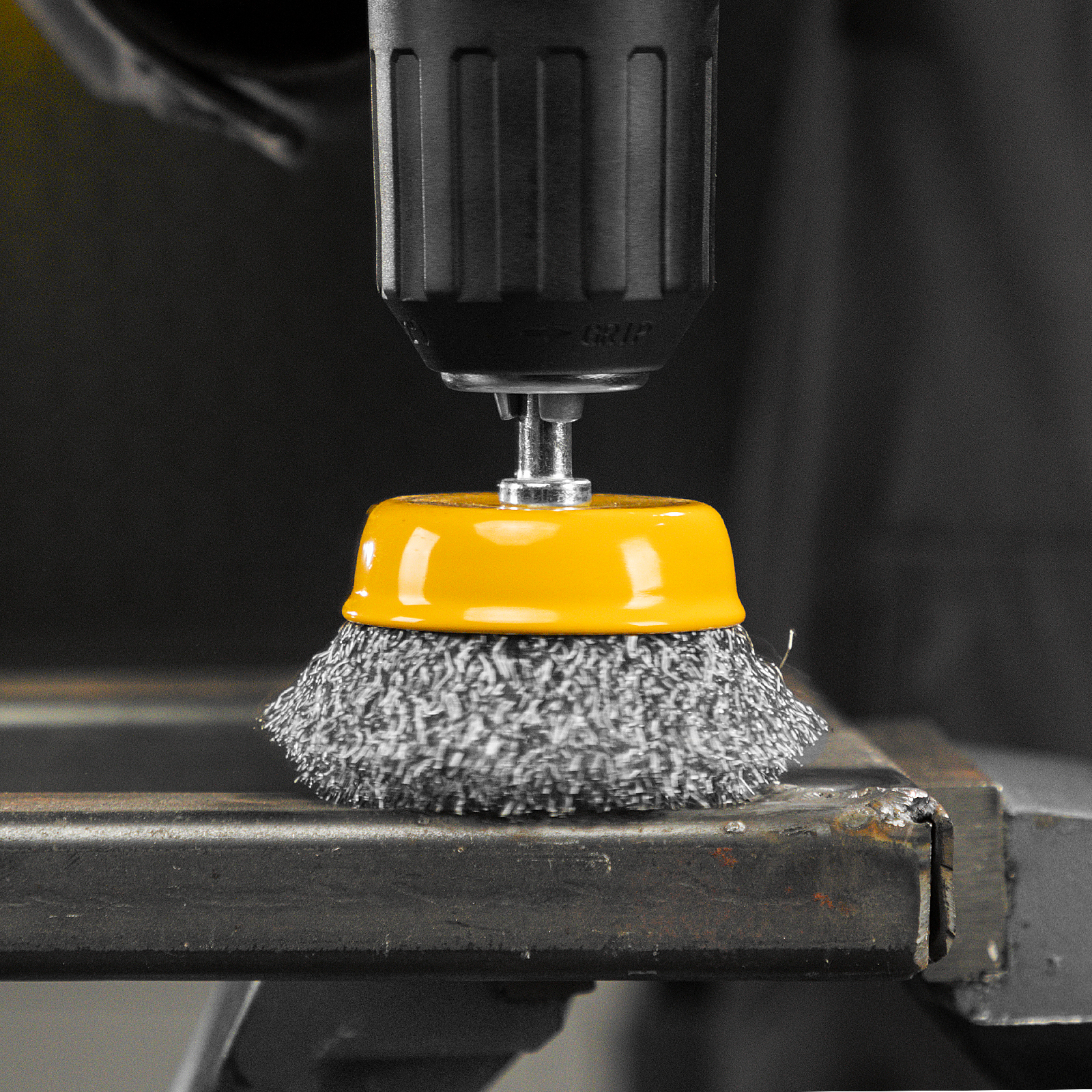 Щетка для дрели «Чашка» Denzel 744633 диаметром 50 мм, со шпилькой и щетиной из нержавеющей витой проволоки, используется для щадящей обработки плоских твердых поверхностей из металла, древесины, пластика, идеально подходит для нержавеющей стали. Оптимальна для снятия тонкого слоя старой краски, ржавчины, удаления загрязнений. Имеет хвостовик диаметром 6 мм и устанавливается в патрон дрели или прямошлифовальной машины (ПШМ).