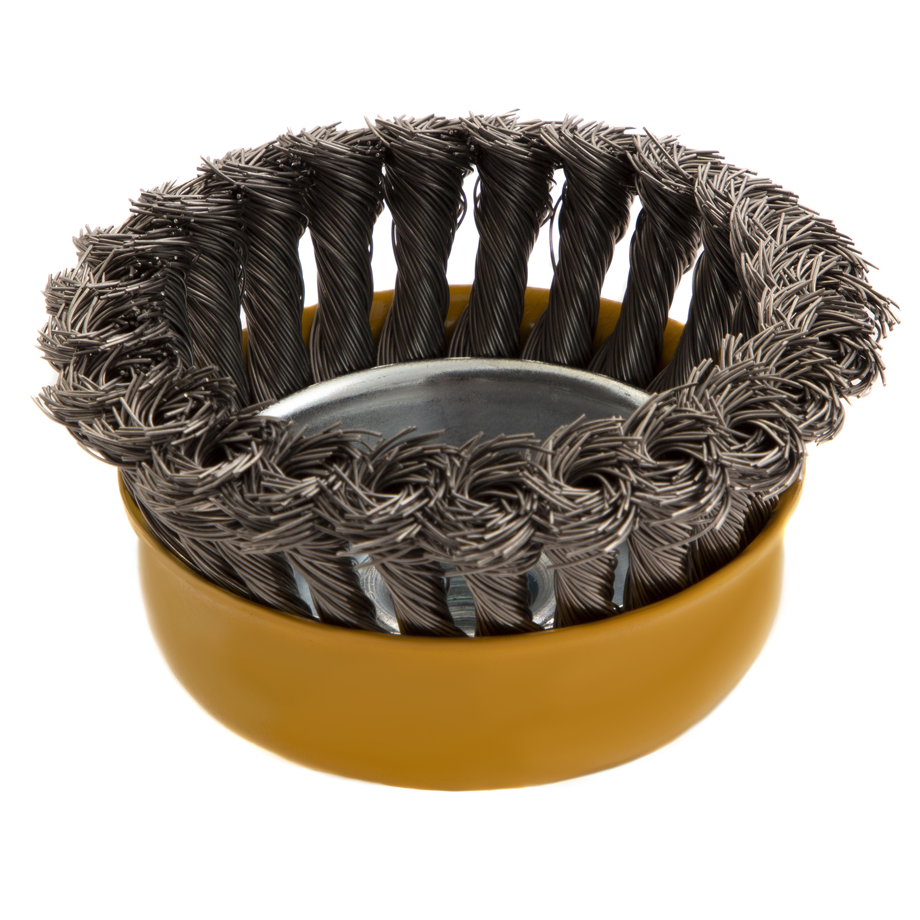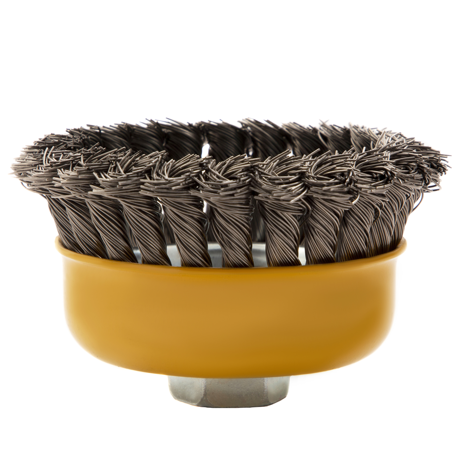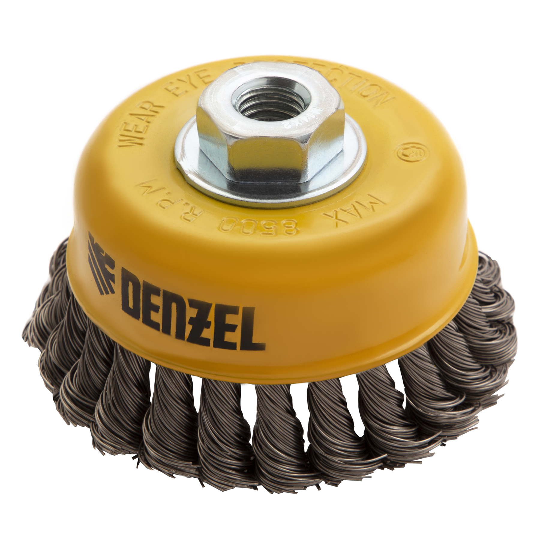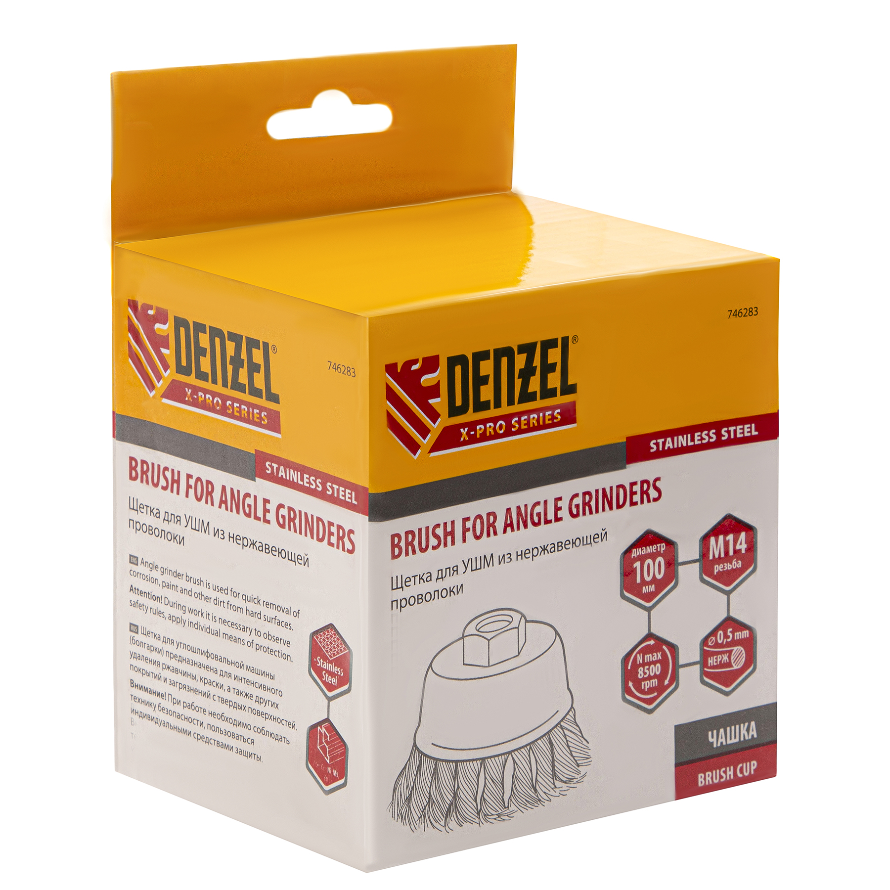 Щетка для УШМ «Чашка» Denzel 746283, М14, диаметром 100 мм, с щетиной из крученой нержавеющей проволоки диаметром 0,5 мм, предназначена для грубой очистки твердых поверхностей от ржавчины, лакокрасочных покрытий, загрязнений, удаления заусенцев, а также для зачистки сварных швов. Снимает толстый слой материала, идеально подходит для обработки изделий из нержавеющей стали. Щетка имеет форму чашки и позволяет очищать участки большой площади. Оснастку устанавливают на вал углошлифовальной машины. Рекомендуемая максимальная скорость вращения составляет 8500 об/мин. Во время работы следует использовать средства индивидуальной защиты — очки, респиратор, наушники, перчатки, а также специальную одежду и обувь. Щетка применяется в строительстве, на производстве, а также в быту.