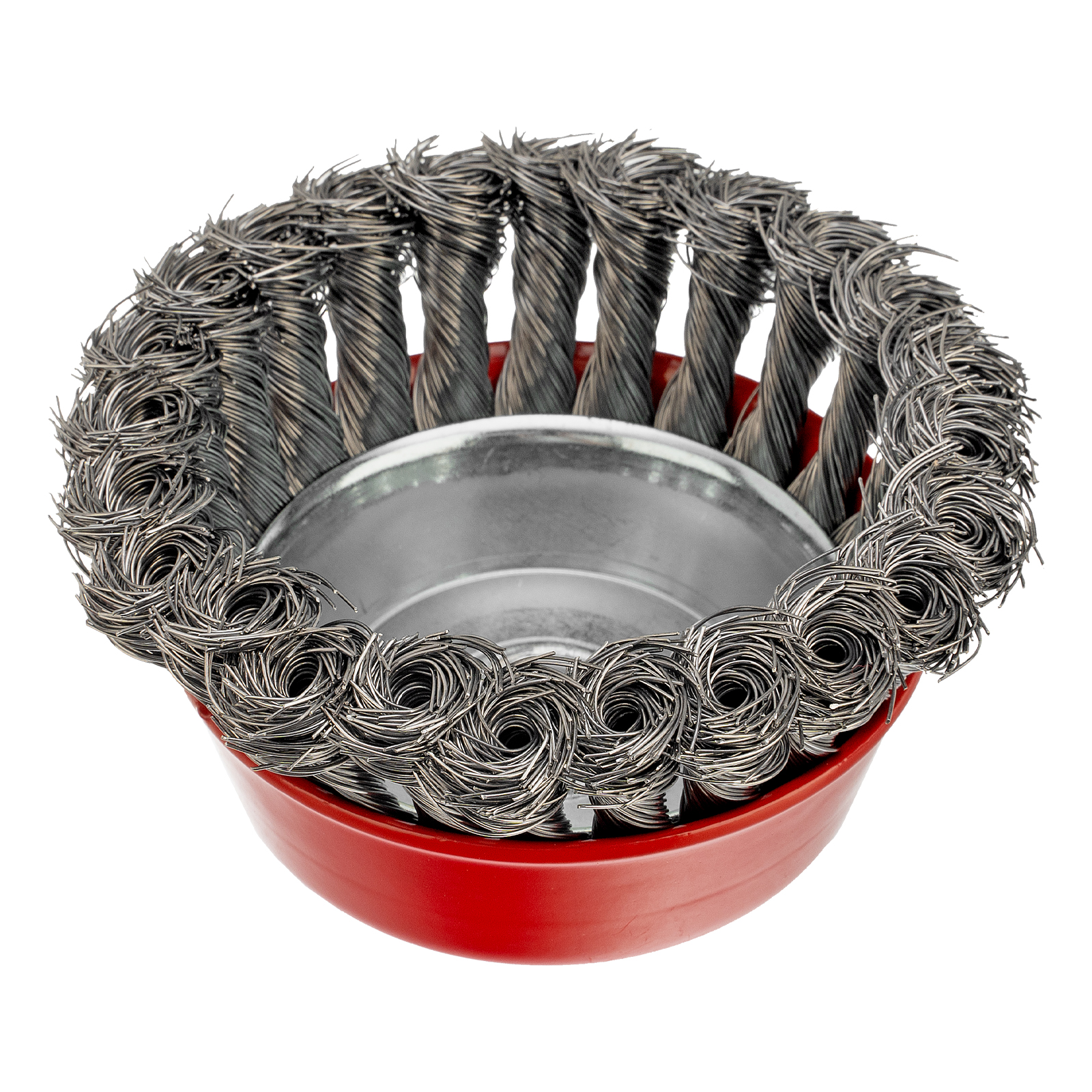 Щетка Matrix «Чашка» 74615 диаметром 100 мм, с присоединительной резьбой М14, с щетиной из крученой проволоки диаметром 0,35 мм, устанавливается на УШМ, поддерживающую работу со скоростью 8500 об/мин. Щетина предназначена для грубой (черновой) обработки поверхностей, менее агрессивной по сравнению с щетиной 0,5 мм. Изделие подходит для удаления загрязнений, снятия толстого слоя ржавчины, ЛКМ, зачистки сварных швов.