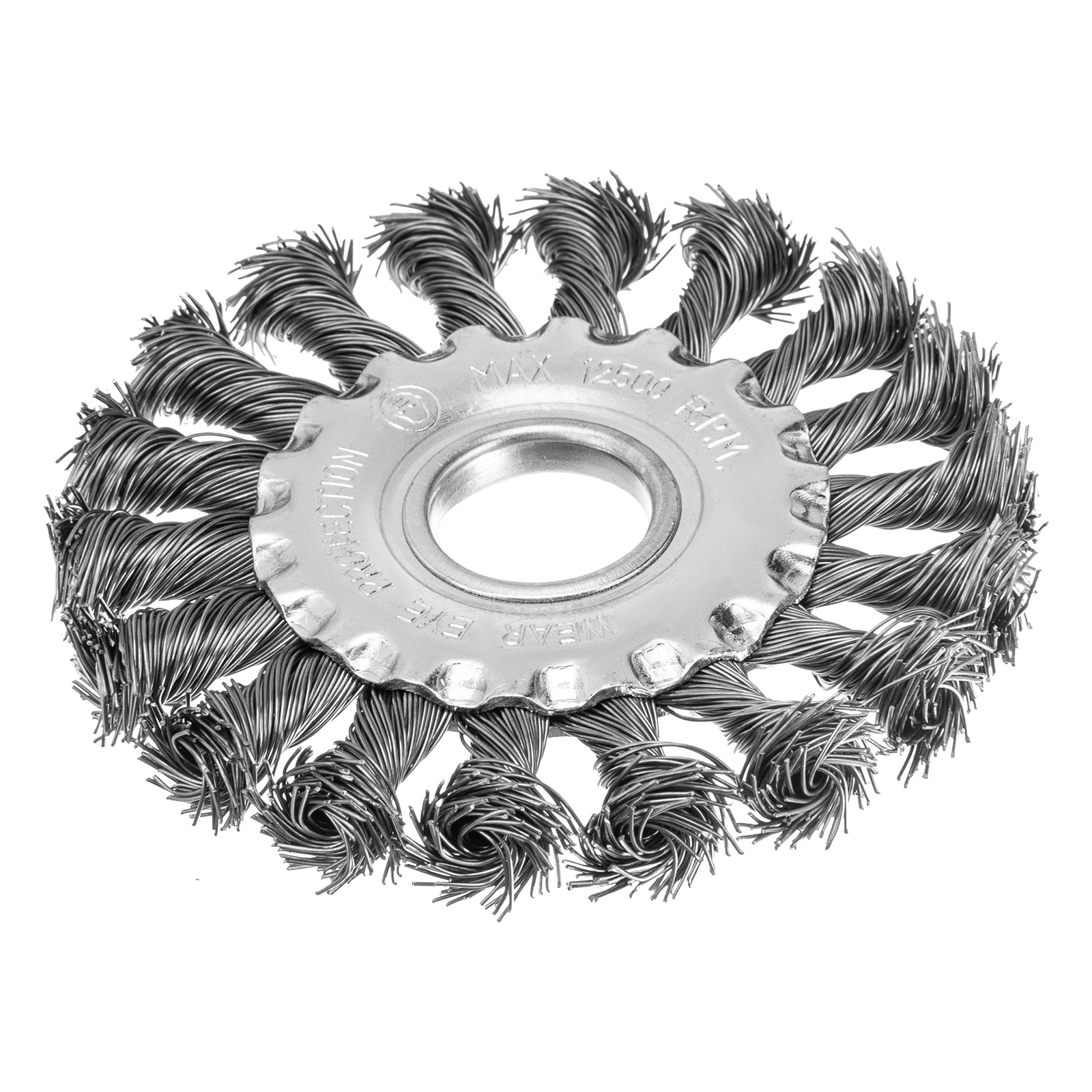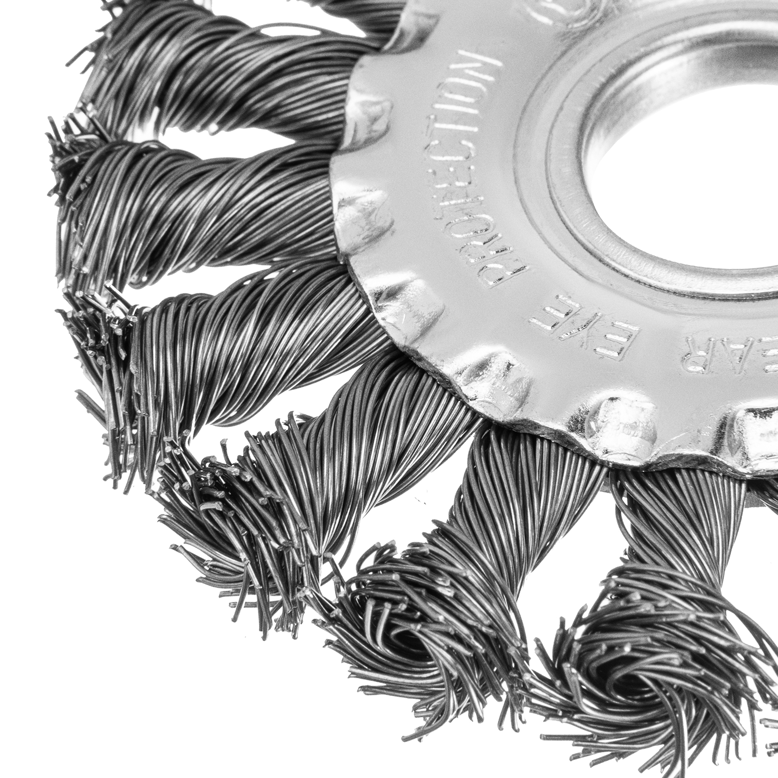 Плоская щетка Matrix 74630 диаметром 100 мм и посадкой 22,2 мм, с щетиной из крученой проволоки толщиной 0,5 мм, устанавливается на вал УШМ, поддерживающей скорость вращения не более 12500 об/мин. Эффективно удаляет загрязнения, толстый слой ржавчины и лакокрасочных материалов с поверхностей, поэтому используется для проведения грубой (черновой) обработки. Плоской щеткой удобно очищать труднодоступные места, в том числе углы и изгибы.
