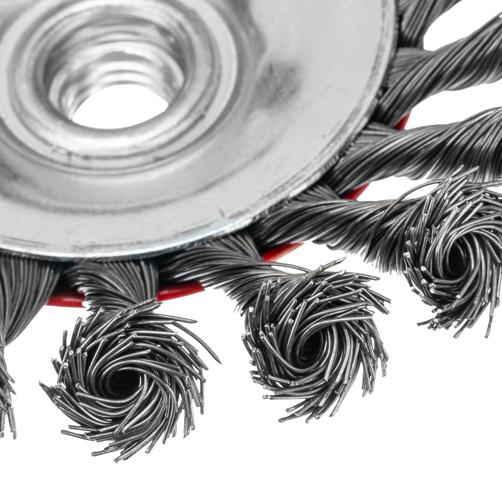 Щетка Matrix «тарелка» 74611 диаметром 125 мм, с щетиной из крученой проволоки толщиной 0,5 мм, устанавливается на УШМ при помощи гайки М14. Выполнена в форме тарелки, за счет чего подходит для грубой (черновой) обработки плоских и угловых поверхностей. Удаляет ржавчину, загрязнения, лакокрасочные покрытия, подходит для зачистки сварных швов. Использование на скорости до 12500 об/мин позволяет продлить срок службы насадки.