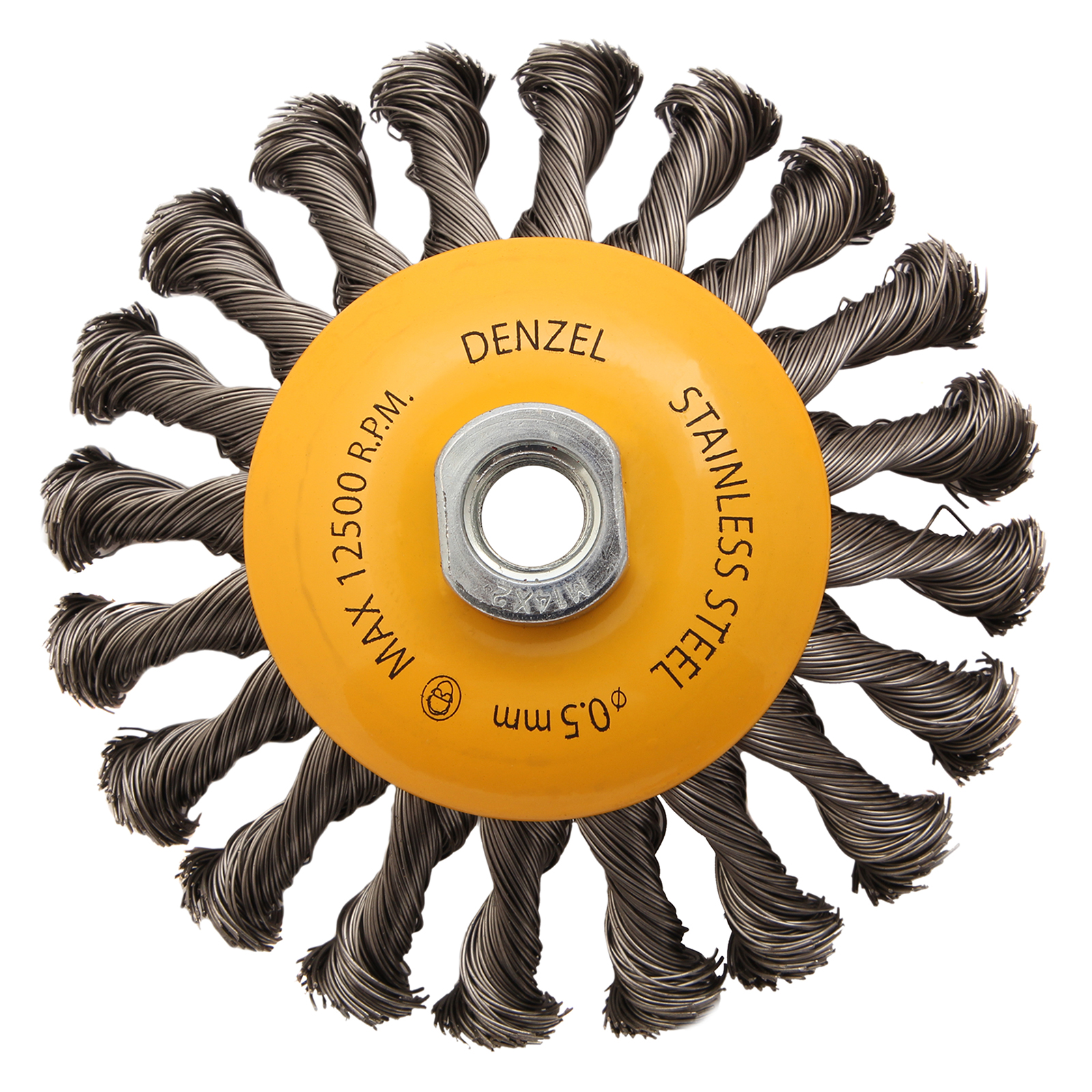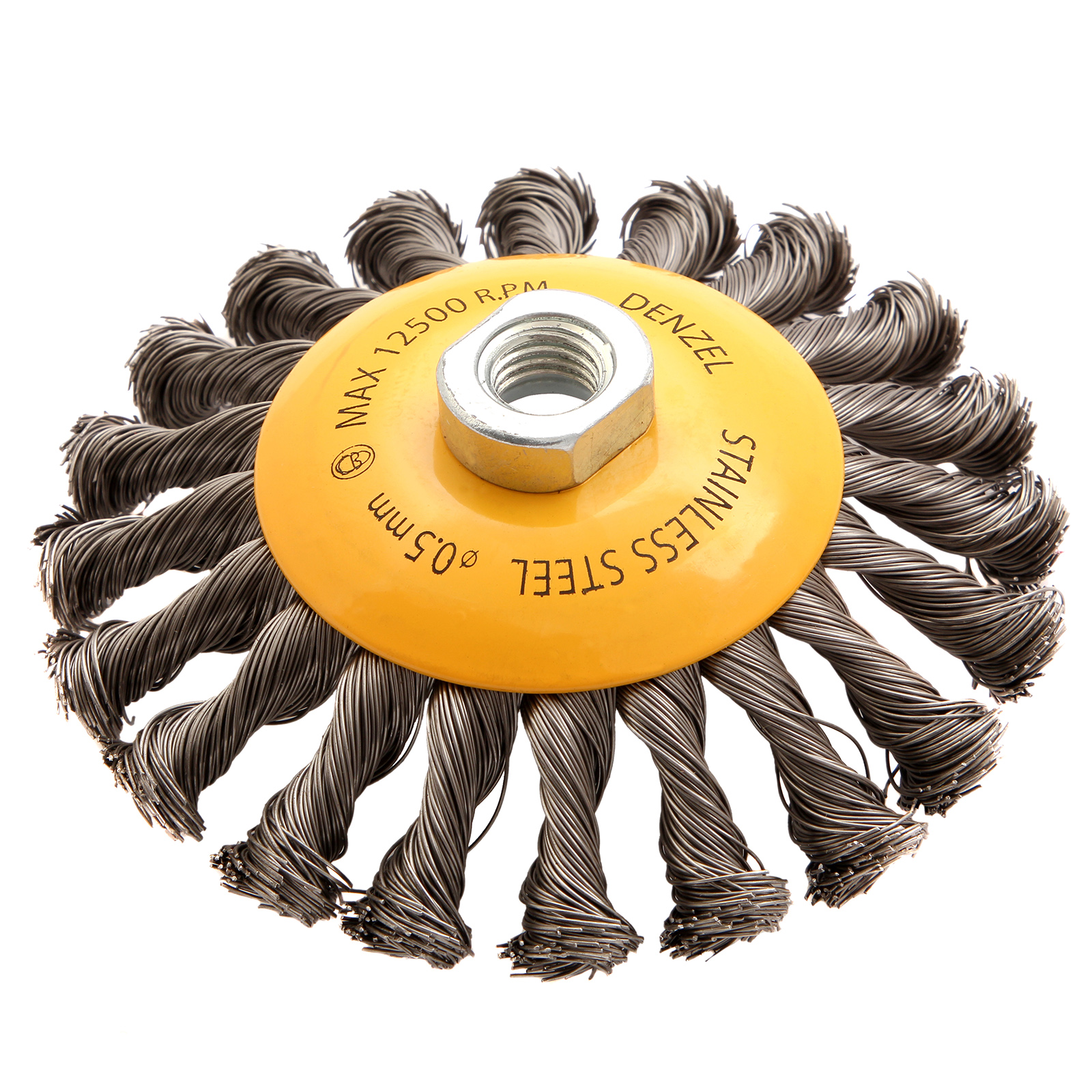 Щетка для УШМ Denzel «Тарелка» 746113, 125 мм, М14, с щетиной из крученой нержавеющей проволоки 0,5 мм, предназначена для снятия толстого слоя краски, лака, ржавчины, для удаления заусенцев и окалины, зачистки сварных швов. Щеткой обрабатывают твердые, преимущественно металлические поверхности, в том числе из нержавеющей стали. Она удобна для очистки как плоских изделий, так и внутренних углов, пазов, изгибов. Щетка совместима с углошлифовальными машинами, поддерживающими работу на скорости до 12500 об/мин. Во время работы необходимо использовать средства индивидуальной защиты. Щетка пригодится во время строительства, на производстве, а также будет полезна в быту.