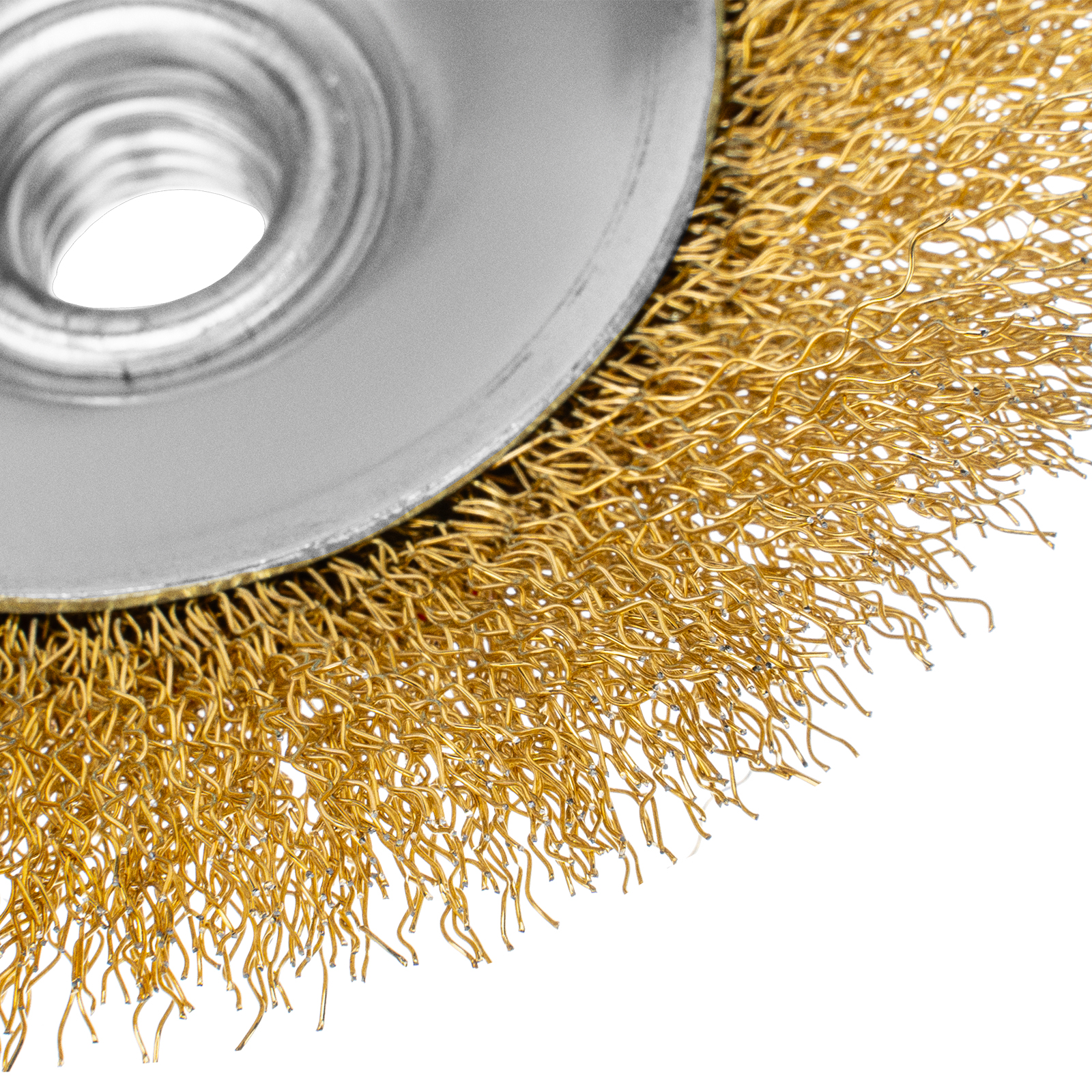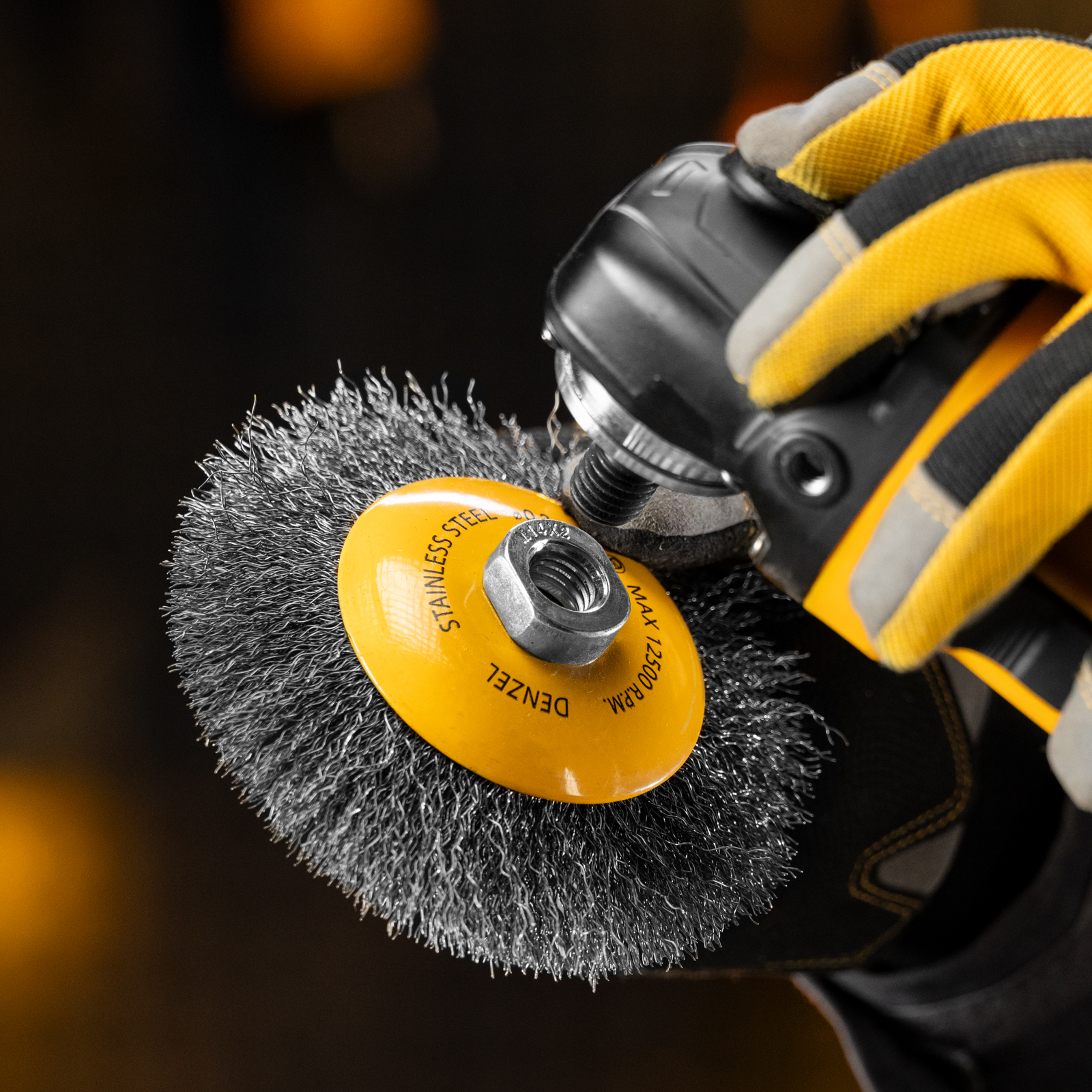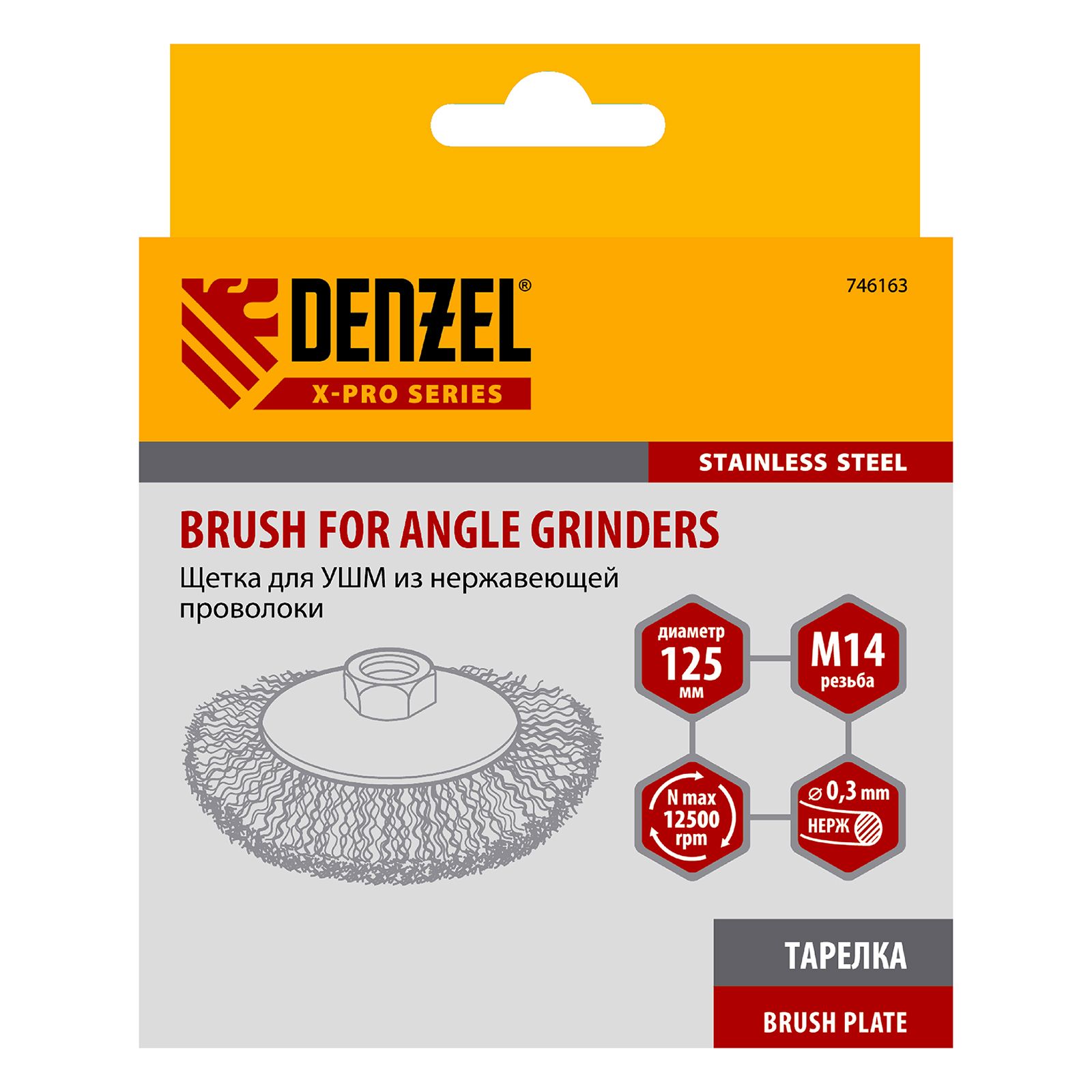 Щетка для УШМ «Тарелка» Denzel 746163, М14, диаметром 125 мм, с щетиной из витой нержавеющей проволоки 0,3 мм, используется для щадящей обработки металлических, в том числе нержавеющих, а также деревянных и пластиковых поверхностей. Постепенно снимает тонкий слой ржавчины, старого лака или краски, удаляет загрязнения. Подходит для придания поверхности заданной шероховатости или подчеркивания структуры дерева. Тарельчатая форма щетки оптимальна для обработки как плоскостей, так и труднодоступных мест. Щетку устанавливают на вал углошлифовальной машины (УШМ), поддерживающей работу со скоростью до 12500 об/мин. Обязательно использование защитных очков, респиратора, перчаток, наушников, спецодежды и обуви. Щетка предназначена для выполнения профессиональных и бытовых работ.
