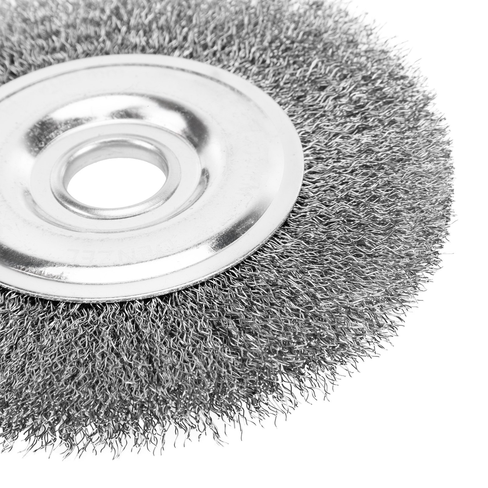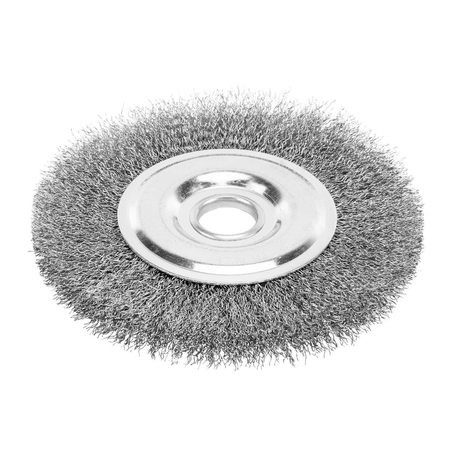 Плоская щетка для УШМ Denzel 746643 диаметром 150 мм, с щетиной из витой нержавеющей проволоки 0,3 мм, с посадкой 22,2 мм, постепенно снимает тонкий слой материала, поэтому ее используют для щадящей обработки металлических, деревянных, пластиковых поверхностей, а также изделий из нержавеющей стали. Щетка удаляет ржавчину, загрязнения, остатки лакокрасочных покрытий из труднодоступных мест, пазов и углов. Оснастка с посадкой 22,2 мм устанавливается на фланец углошлифовальной машины, что удобно для длительной работы без смены насадок. Рекомендуемая максимальная скорость вращения составляет 4500 об/мин. Во время работы следует использовать средства индивидуальной защиты. Щетку применяют в строительстве, машиностроении, а также в быту.