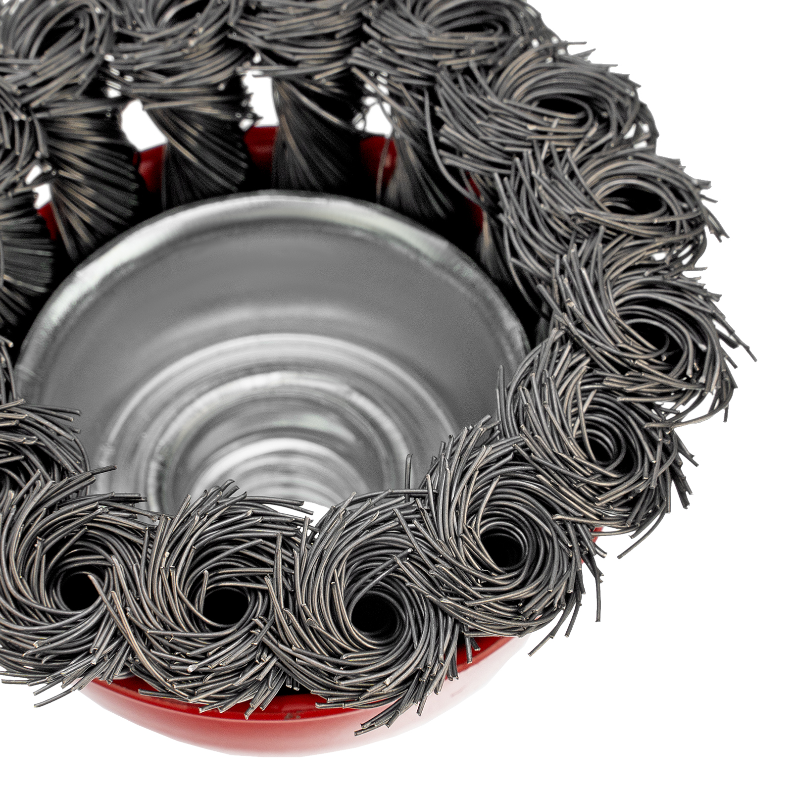 Щетка Matrix «Чашка» 74613 диаметром 65 мм, с присоединительной резьбой М14, с щетиной из крученой проволоки диаметром 0,35 мм, устанавливается на УШМ, поддерживающую работу со скоростью 12500 об/мин. Щетина предназначена для грубой (черновой) обработки поверхностей, менее агрессивной по сравнению с щетиной 0,5 мм. Изделие подходит для удаления загрязнений, снятия толстого слоя ржавчины, ЛКМ, зачистки сварных швов.