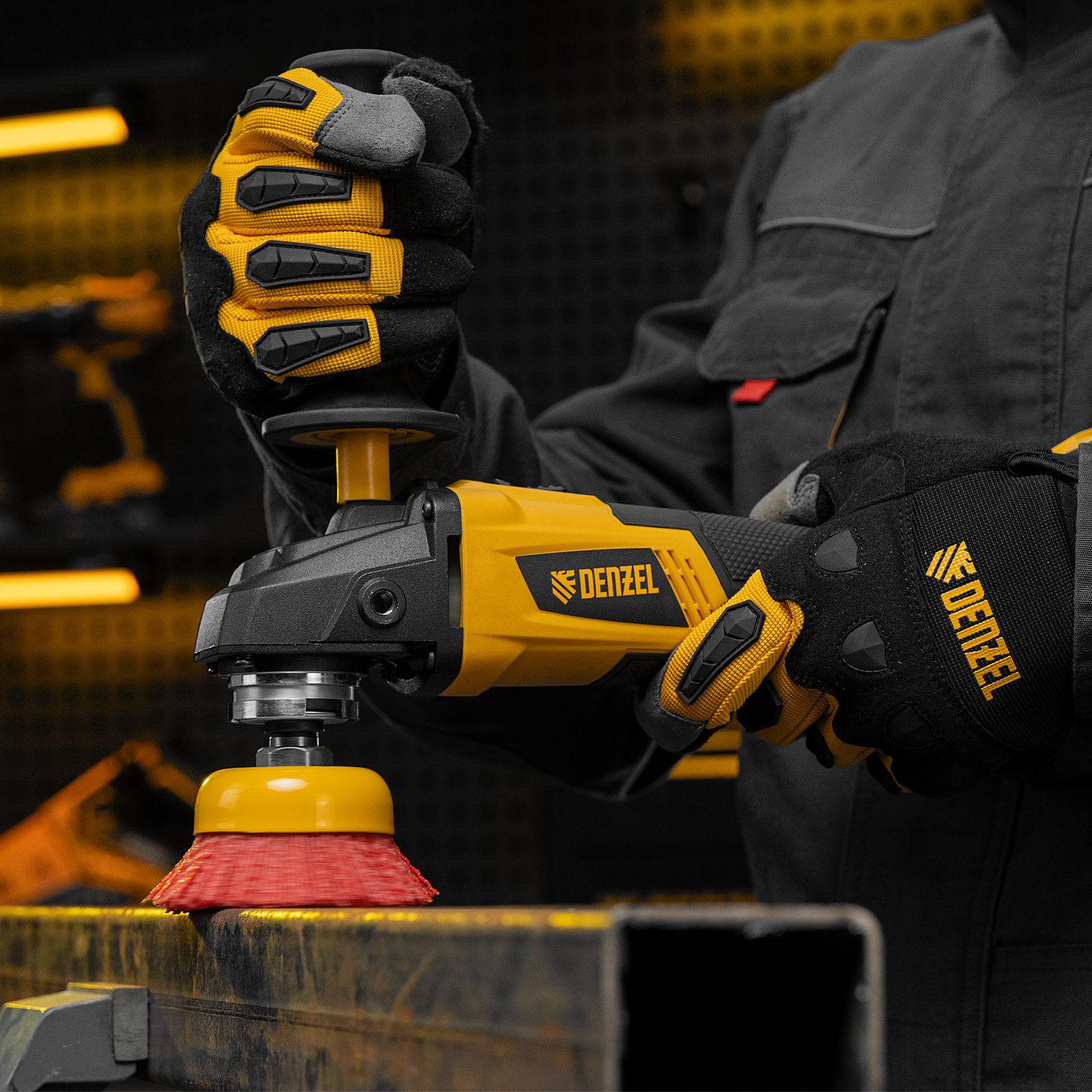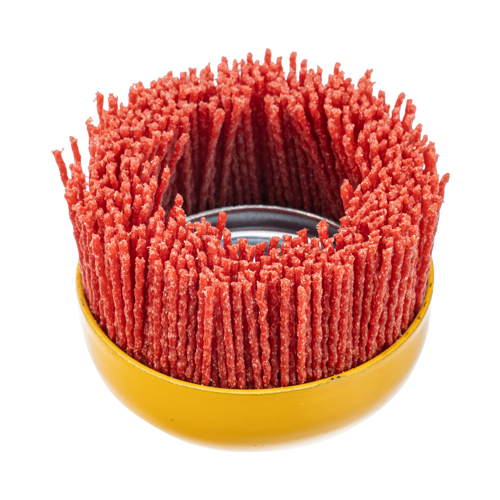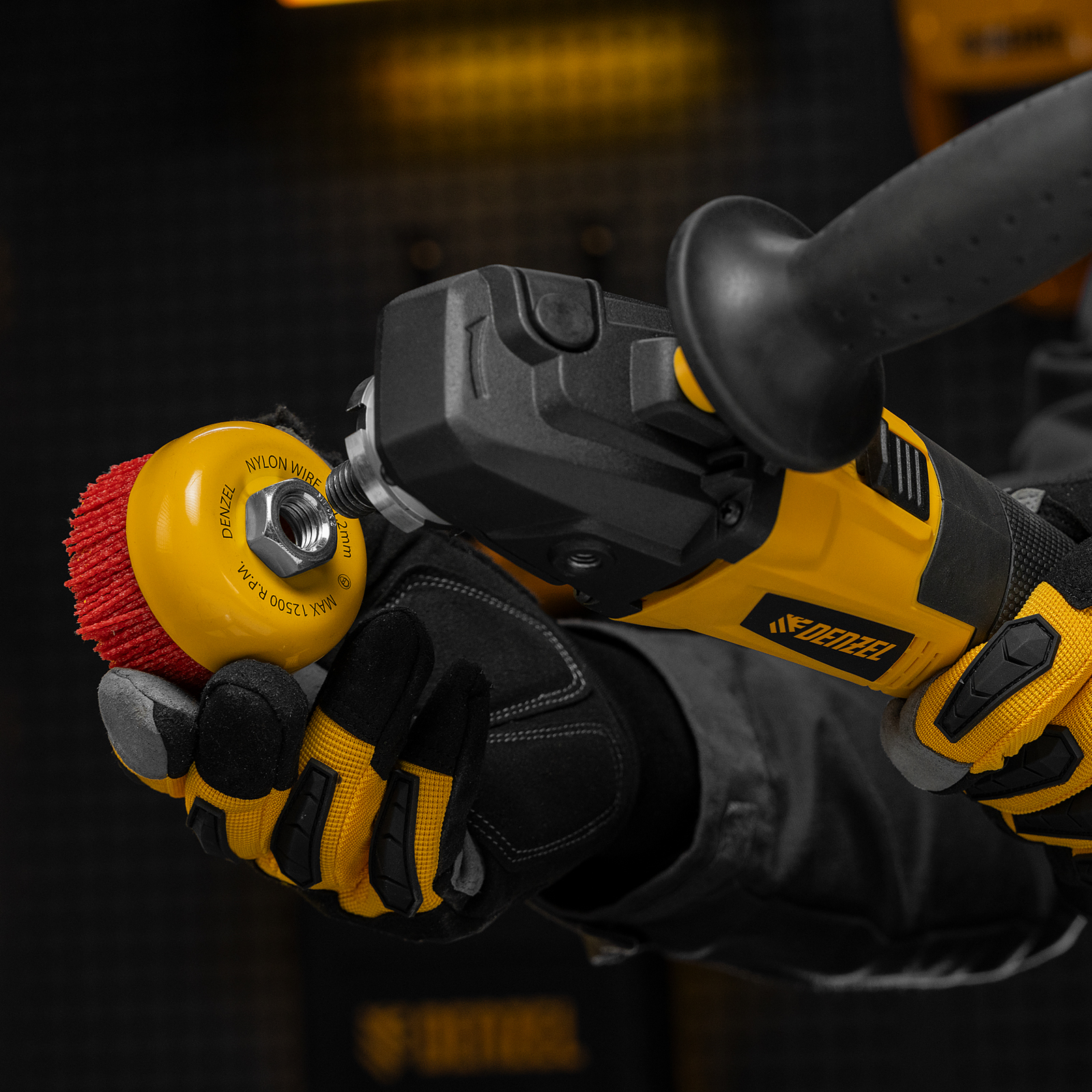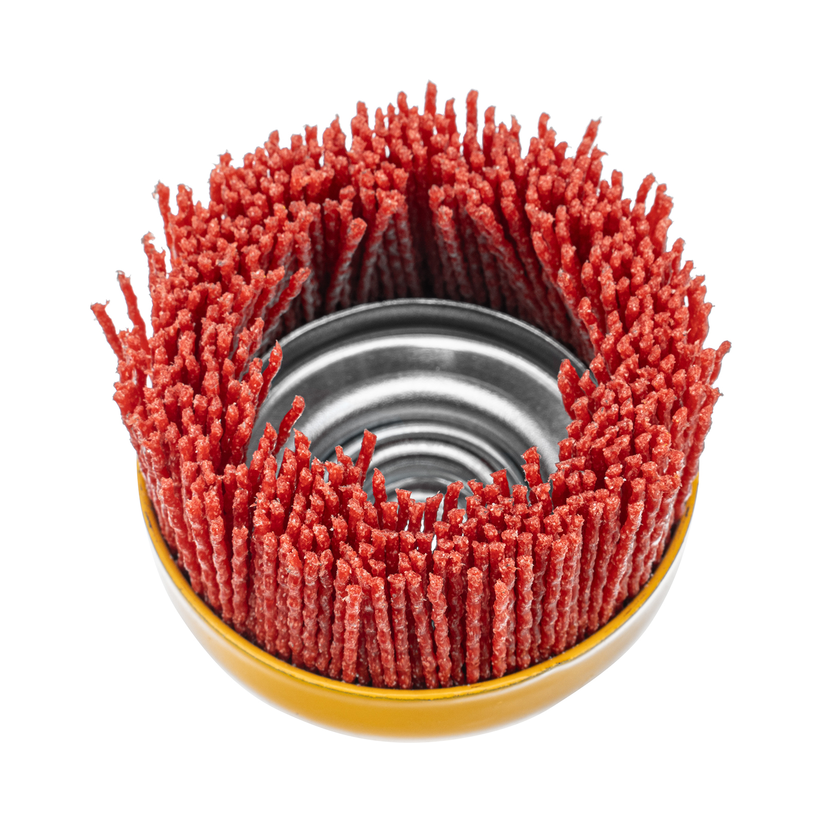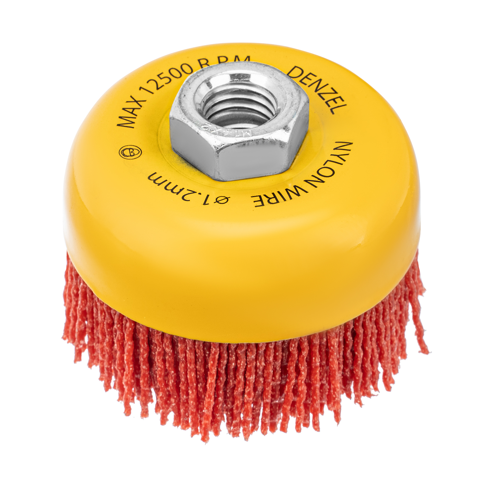 Щетка Denzel 74465 в форме чашки диаметром 65 мм, с нейлоновой щетиной, устанавливается на вал УШМ при помощи гайки М14. Предназначена для выполнения шлифовальных работ. Щетина изготовлена из высококачественного нейлона с нанесенным абразивом из оксида алюминия. удаления загрязнений, краски, пятен ржавчины с твердых поверхностей. Позволяет придать шероховатость поверхности, подходит для браширования древесины. Насадка удобна для обработки плоских деталей большой площади.