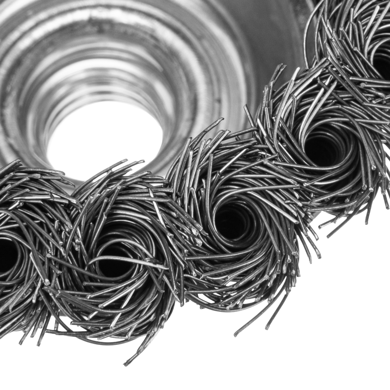Щетка Matrix «Чашка» 74614 диаметром 75 мм, с присоединительной резьбой М14, с щетиной из крученой проволоки диаметром 0,35 мм, устанавливается на УШМ, поддерживающую работу со скоростью 12500 об/мин. Щетина предназначена для грубой (черновой) обработки поверхностей, менее агрессивной по сравнению с щетиной 0,5 мм. Изделие подходит для удаления загрязнений, снятия толстого слоя ржавчины, ЛКМ, зачистки сварных швов.