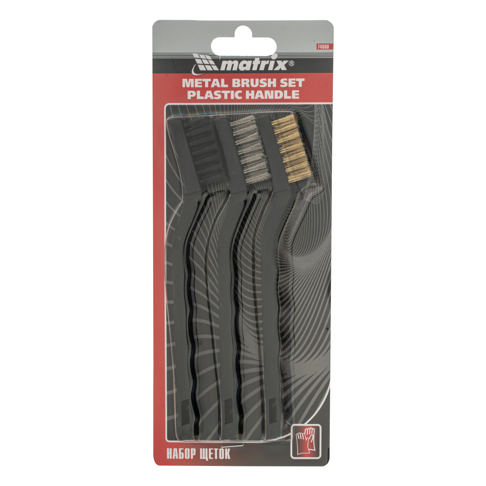 Набор малых щеток Matrix 74860 с пластмассовыми ручками предназначен для различных видов обработки — стальные удаляют ржавчину, загрязнения и старую краску с металлических и других поверхностей, а нейлоновая браширует и мягко очищает деревянные изделия. Щетки имеют удлиненные ручки, а длина рабочих частей составляет 34 мм, поэтому они оптимальны для работы на небольших участках и в труднодоступных местах. Набор пригодится во время проведения ремонта, кузовных работ, а также будет полезен в быту.