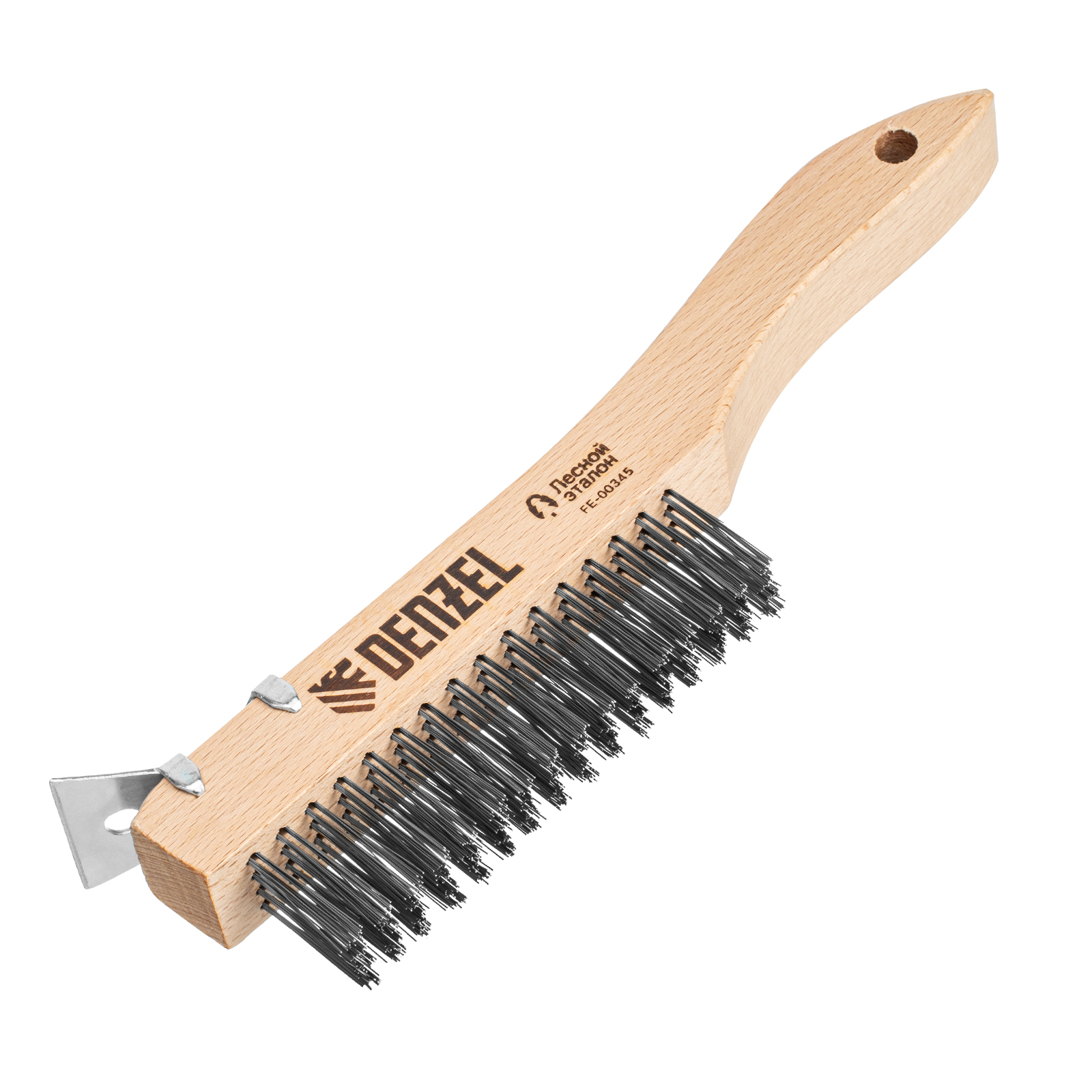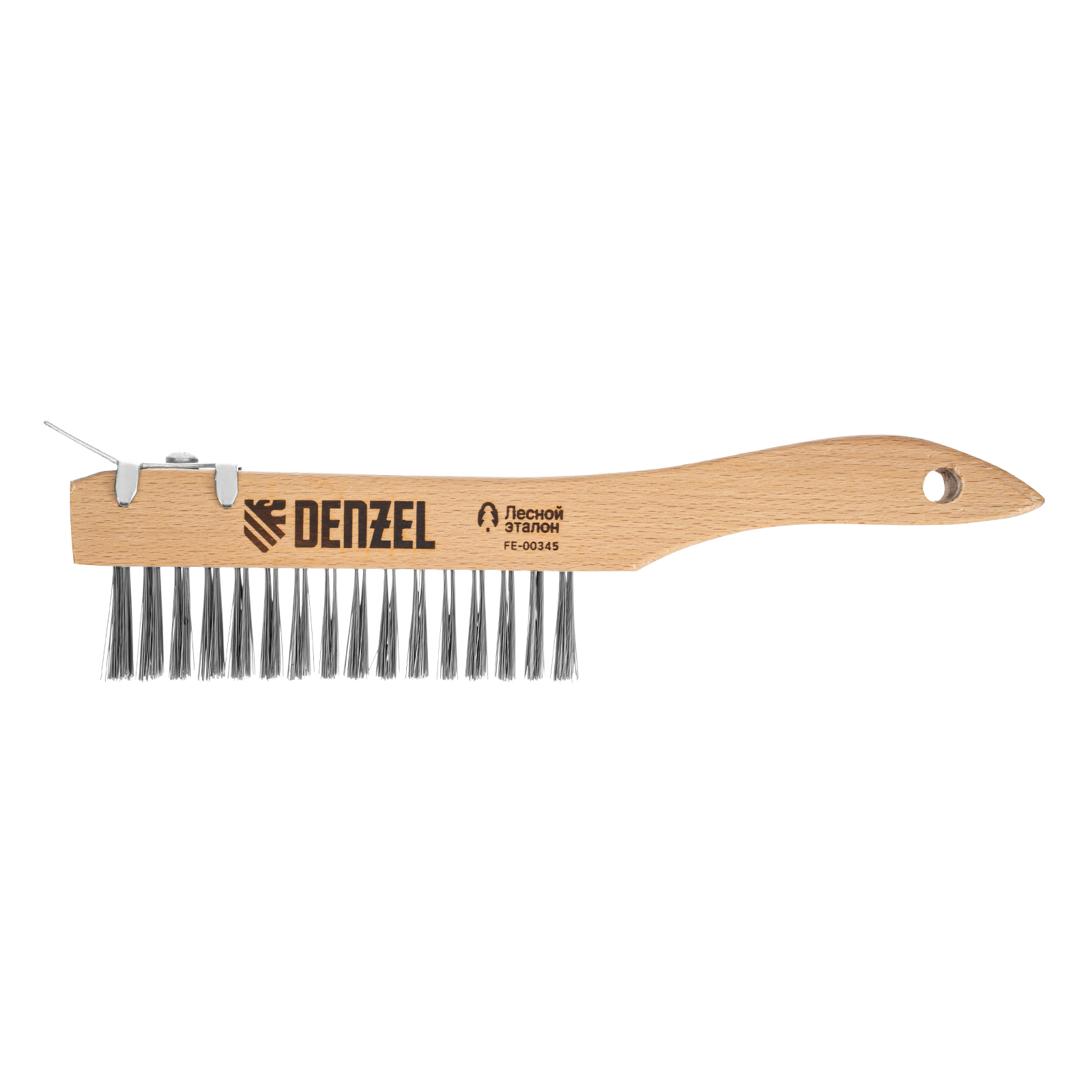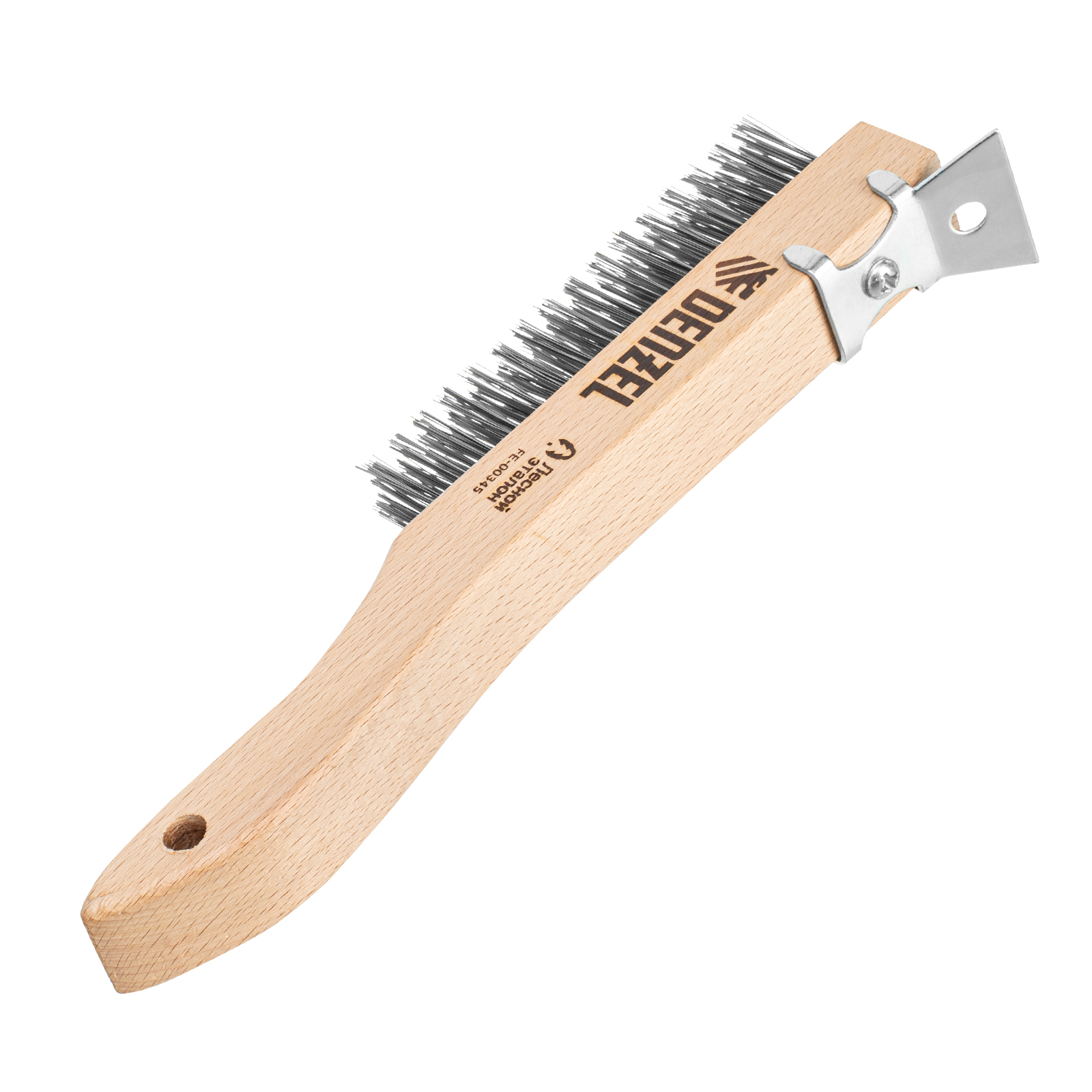 Зачистная 4-рядная щетка Denzel 74847 с проволокой из нержавеющей стали и деревянной рукояткой — ручной инструмент для обработки деревянных, металлических и других поверхностей. Позволяет удалять загрязнения, ржавчину, остатки отделочных покрытий и т.д. Стальная щетина толщиной 0,3 мм, расположенная в 4 ряда, отличается высокой абразивной способностью. Скребок облегчает удаление загрязнений, ускоряет и упрощает работу.