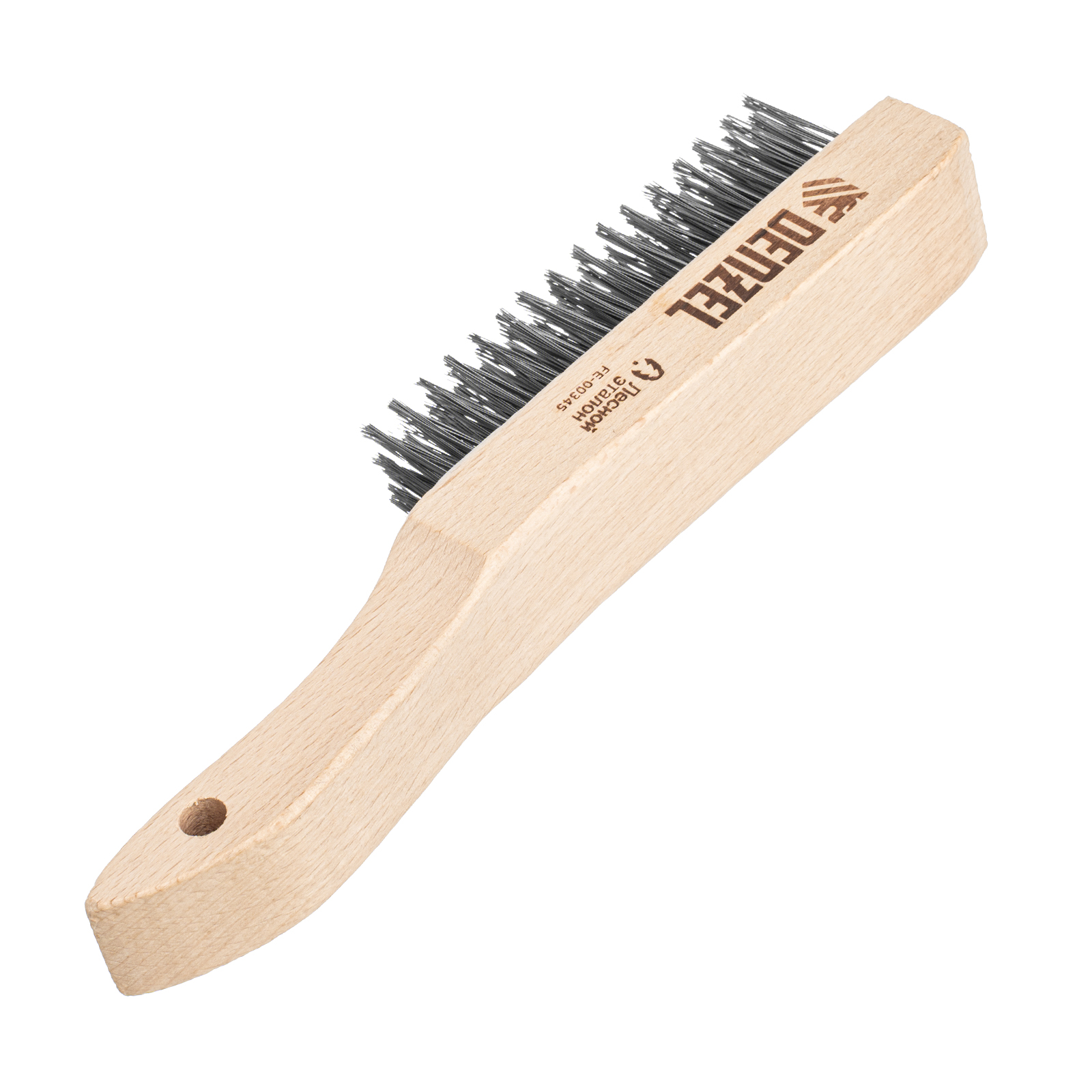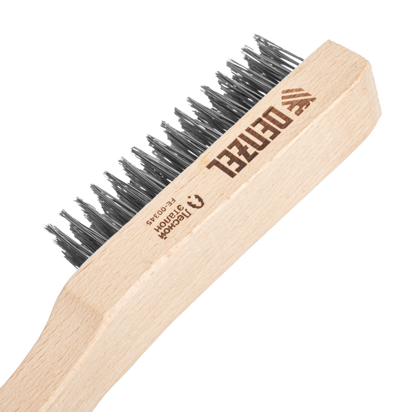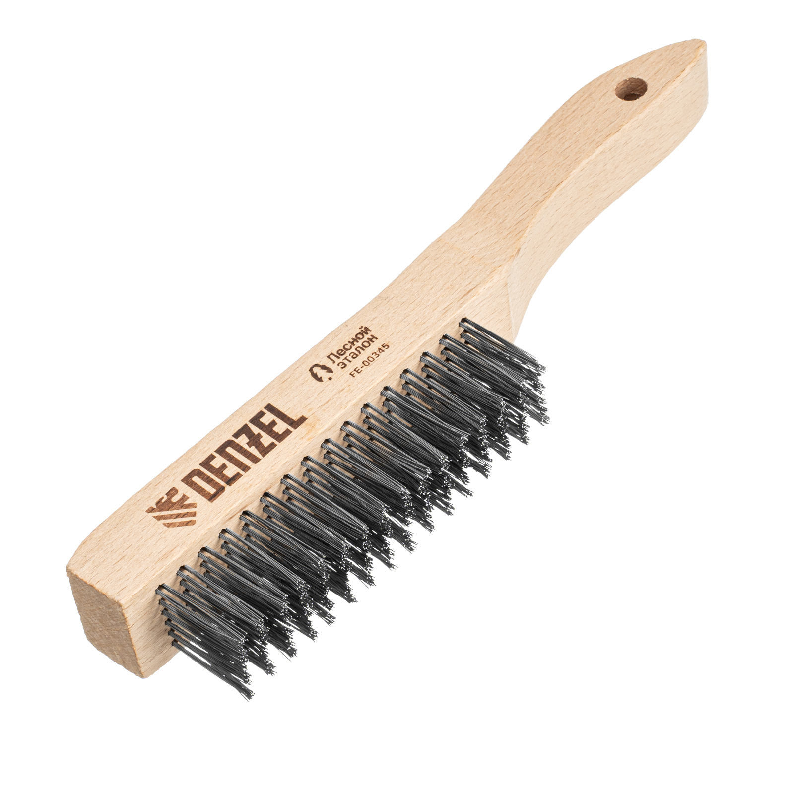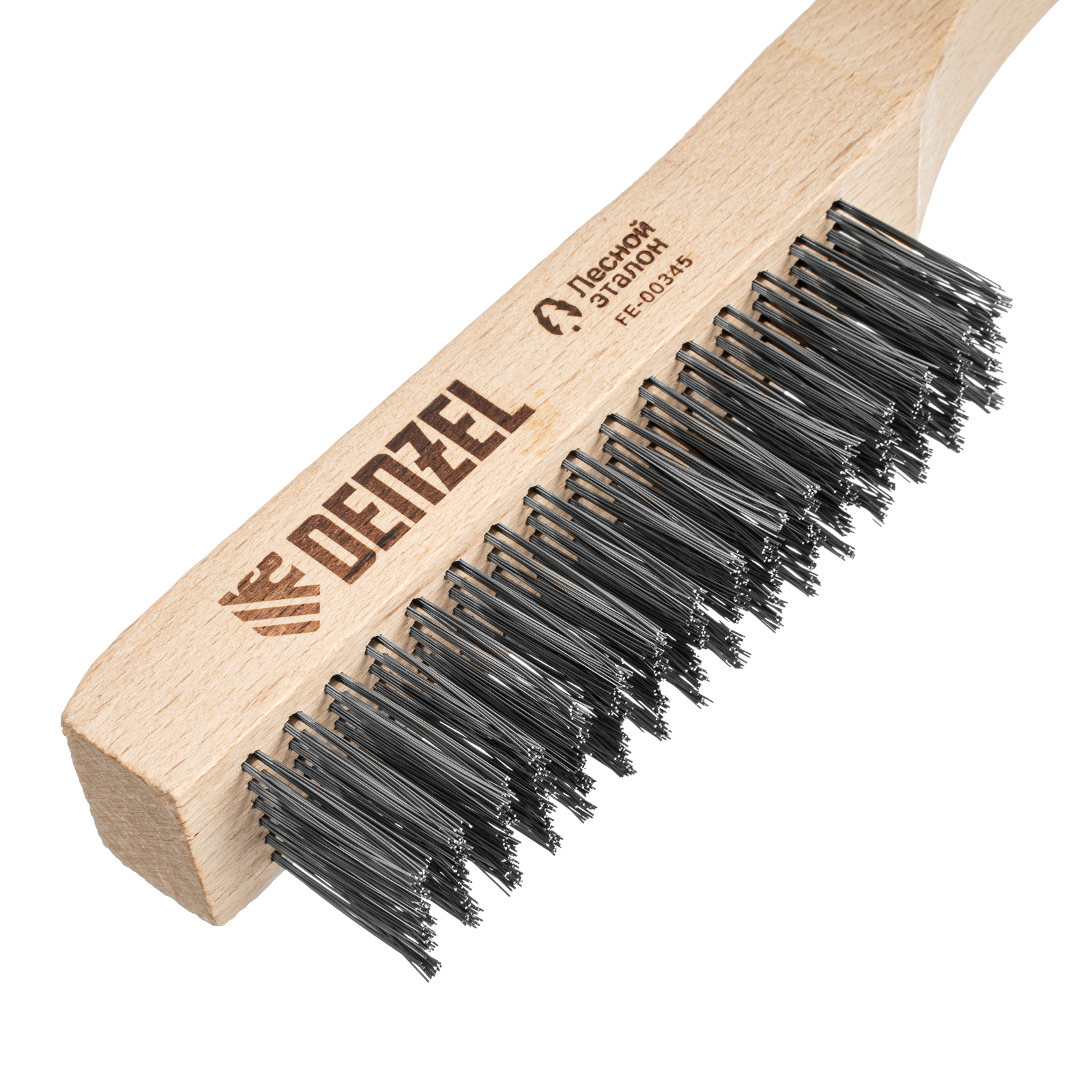 Зачистная 6-рядная щетка Denzel 74846 с прямой проволокой из нержавеющей стали и деревянной рукояткой — ручной инструмент для обработки деревянных, металлических и других поверхностей. Позволяет удалять загрязнения, ржавчину, остатки отделочных покрытий и т.д. Стальная щетина толщиной 0,3 мм с высокой абразивной способностью, расположенная в 6 рядов, обеспечивает эффективное выполнение работ.