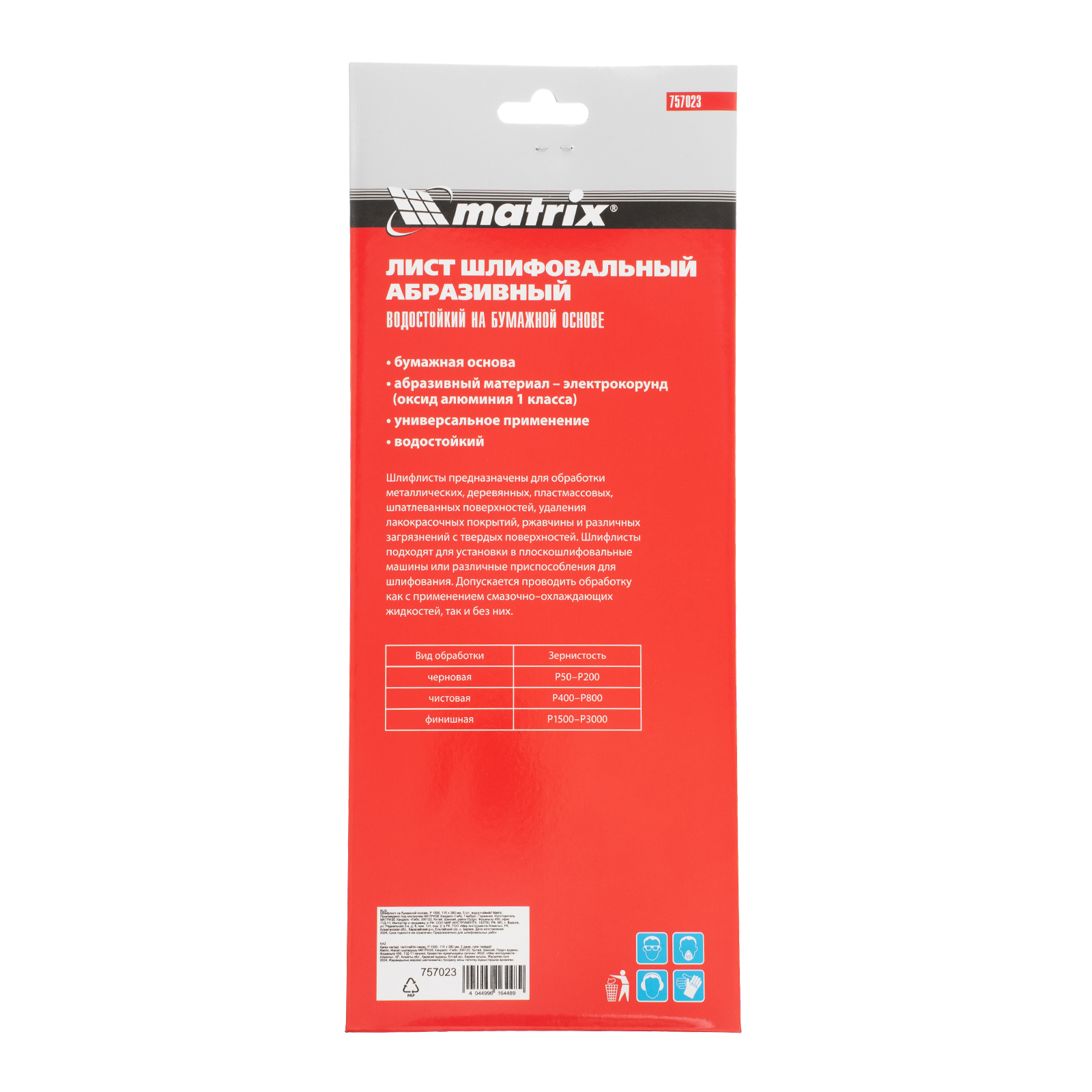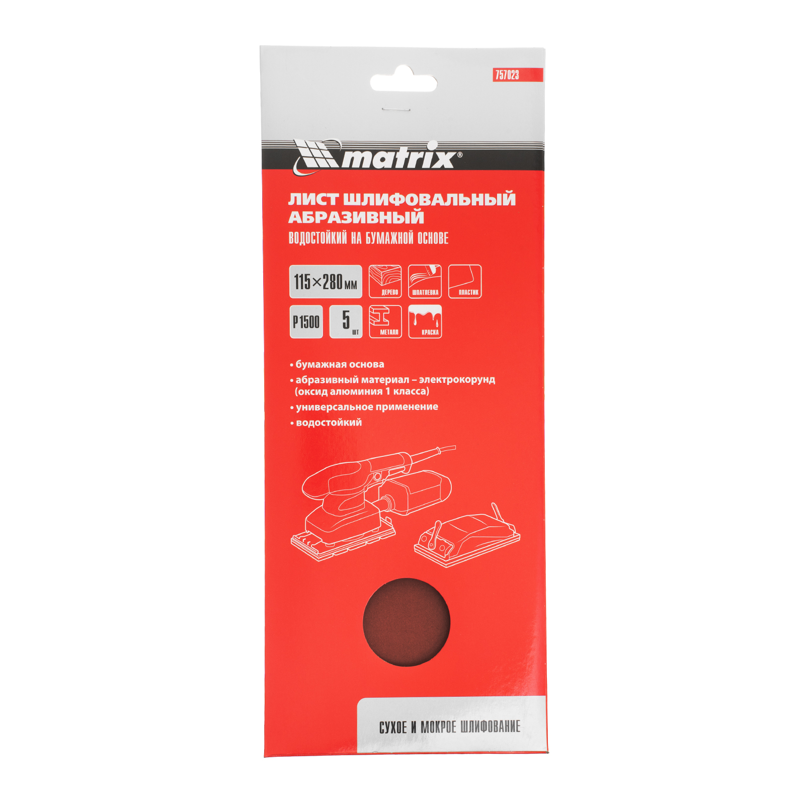 Водостойкий шлифлист на бумажной основе Matrix 757023 размером 115 х 280 мм, с зернистостью P 1500, 5 шт. в упаковке, оптимален для финишной обработки. Устанавливается в плоскошлифовальную машину, также может применяться для ручной обработки. Абразивом является мелкозернистый электрокорунд P 1500, оптимальный для получения гладкой (зеркальной) поверхности.