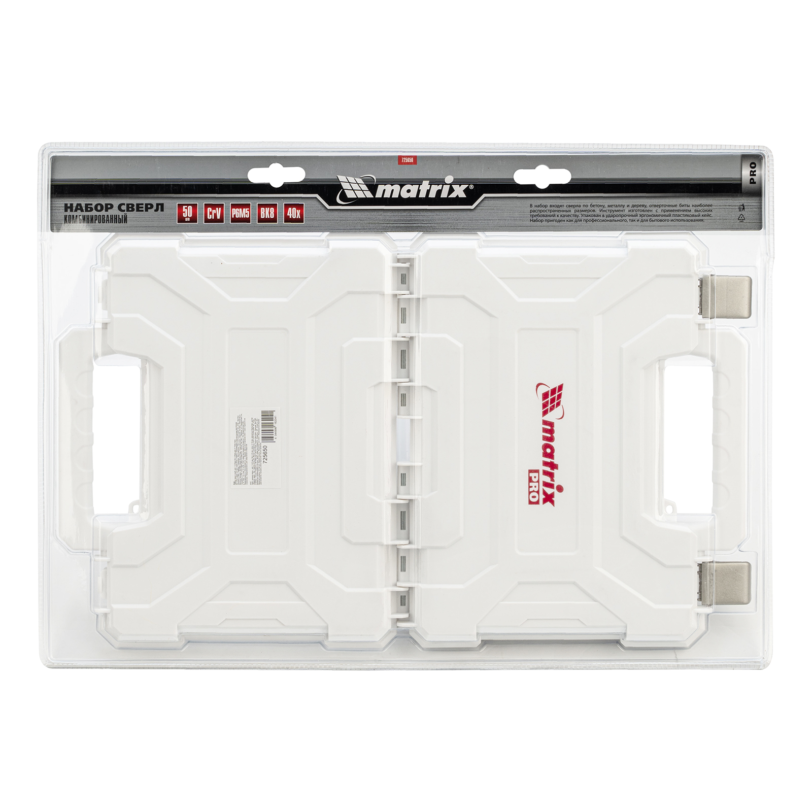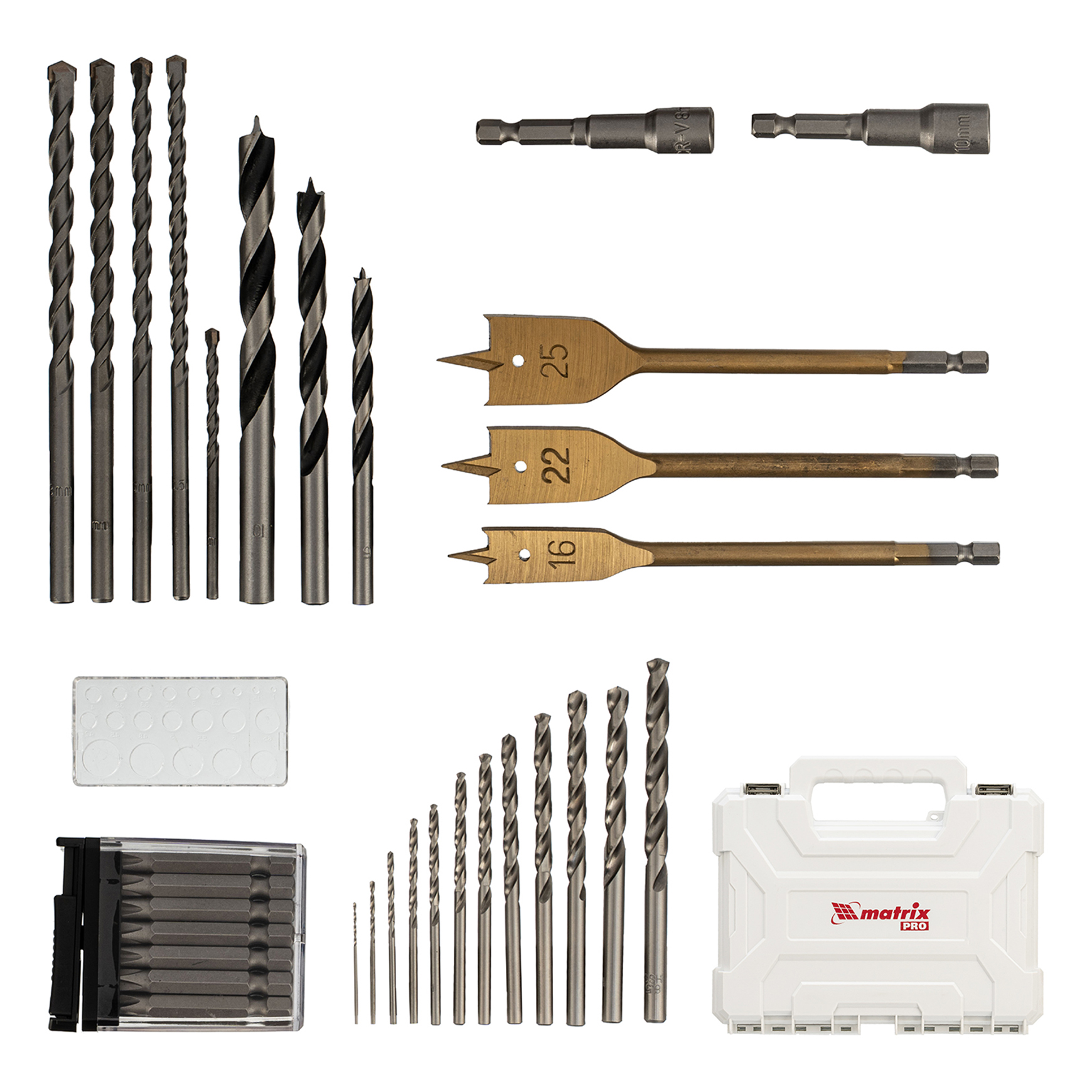 Комбинированный набор Matrix 725650 — универсальное решение для мастеров, т. к. он содержит 50 предметов: отверточные биты (20 шт.) и адаптер к ним, зенковку, 2 торцевые головки, калибровочную шкалу, сверла по дереву 4-10 мм, сверла перовые 16-25 мм, сверла по бетону 4-8 мм и сверла по металлу 1-6,5 мм. Оснастка подходит как для бытового использования, так и решения профессиональных задач.