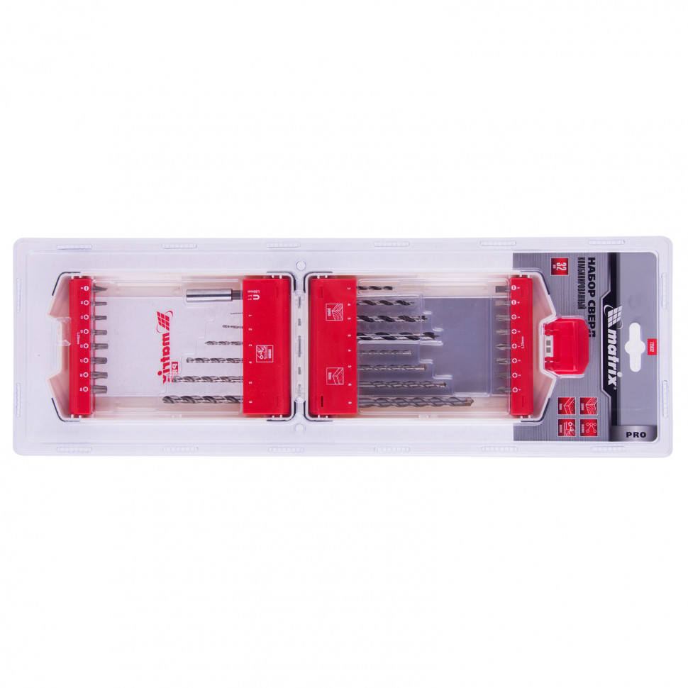 Комбинированный набор Matrix 725632 — универсальное решение для мастеров, т. к. он содержит 32 предмета: отверточные биты (16 шт.) и адаптер к ним, калибровочную шкалу и сверла по дереву 3-6 мм, сверла по бетону 4-8 мм и сверла по металлу 1-6 мм. Оснастка подходит как для бытового использования, так и решения профессиональных задач.