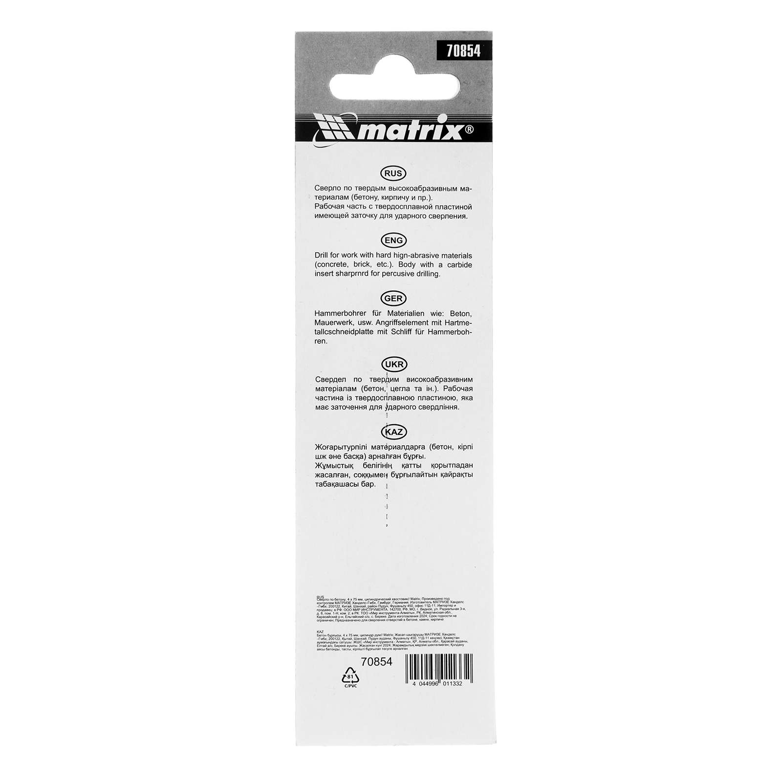 Сверло Matrix 70854 размером 4 х 75 мм, с цилиндрическим хвостовиком, устанавливается на дрель и используется для получения отверстий в бетоне, кирпиче, мраморе и других твердых материалах. Оно рассчитано на полупрофессиональное использование, подходит также для осуществления ремонтных и монтажных работ в быту.