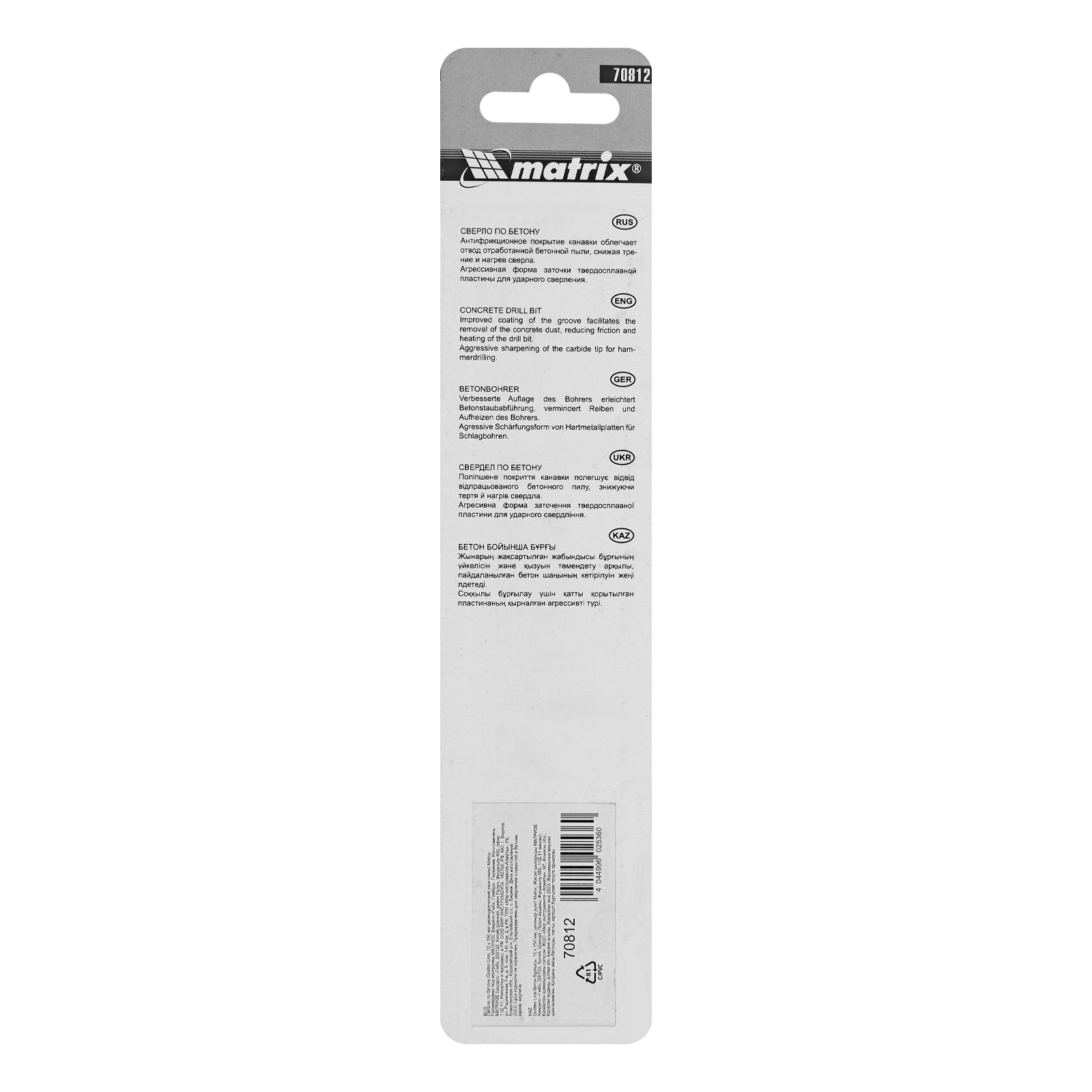 Сверло по бетону Matrix Golden Line 70812 размером 12 х 150 мм с цилиндрическим хвостовиком, — сменная оснастка для дрели. Благодаря агрессивной форме заточки его можно использовать в режиме ударного сверления. Оснастка предназначена для работы с бетоном, кирпичом и другими твердыми материалами.