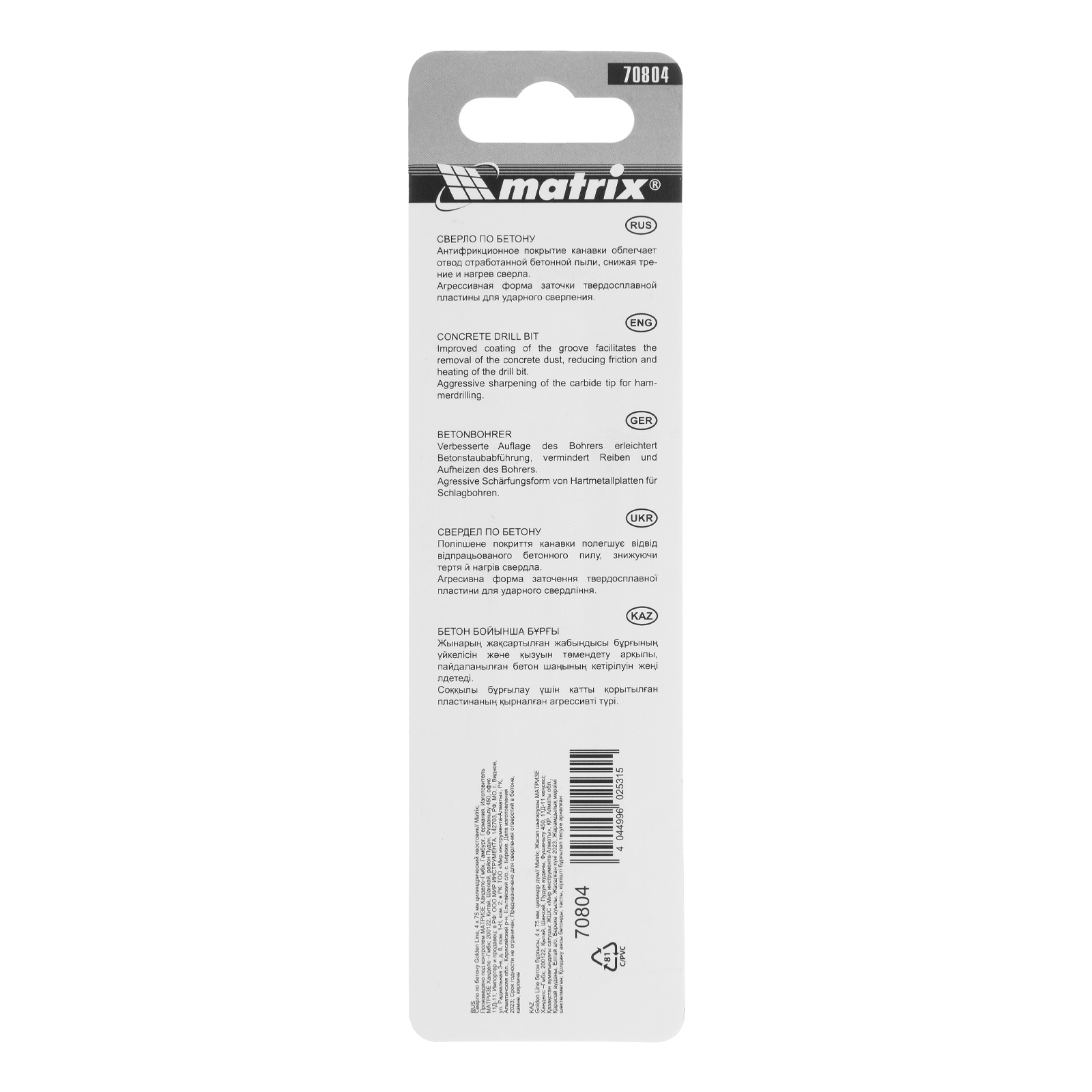 Сверло по бетону Matrix Golden Line 70804 размером 4 х 75 мм, с цилиндрическим хвостовиком, — сменная оснастка для дрели. Благодаря агрессивной форме заточки его можно использовать в режиме ударного сверления. Оснастка предназначена для работы с бетоном, кирпичом и другими твердыми материалами.