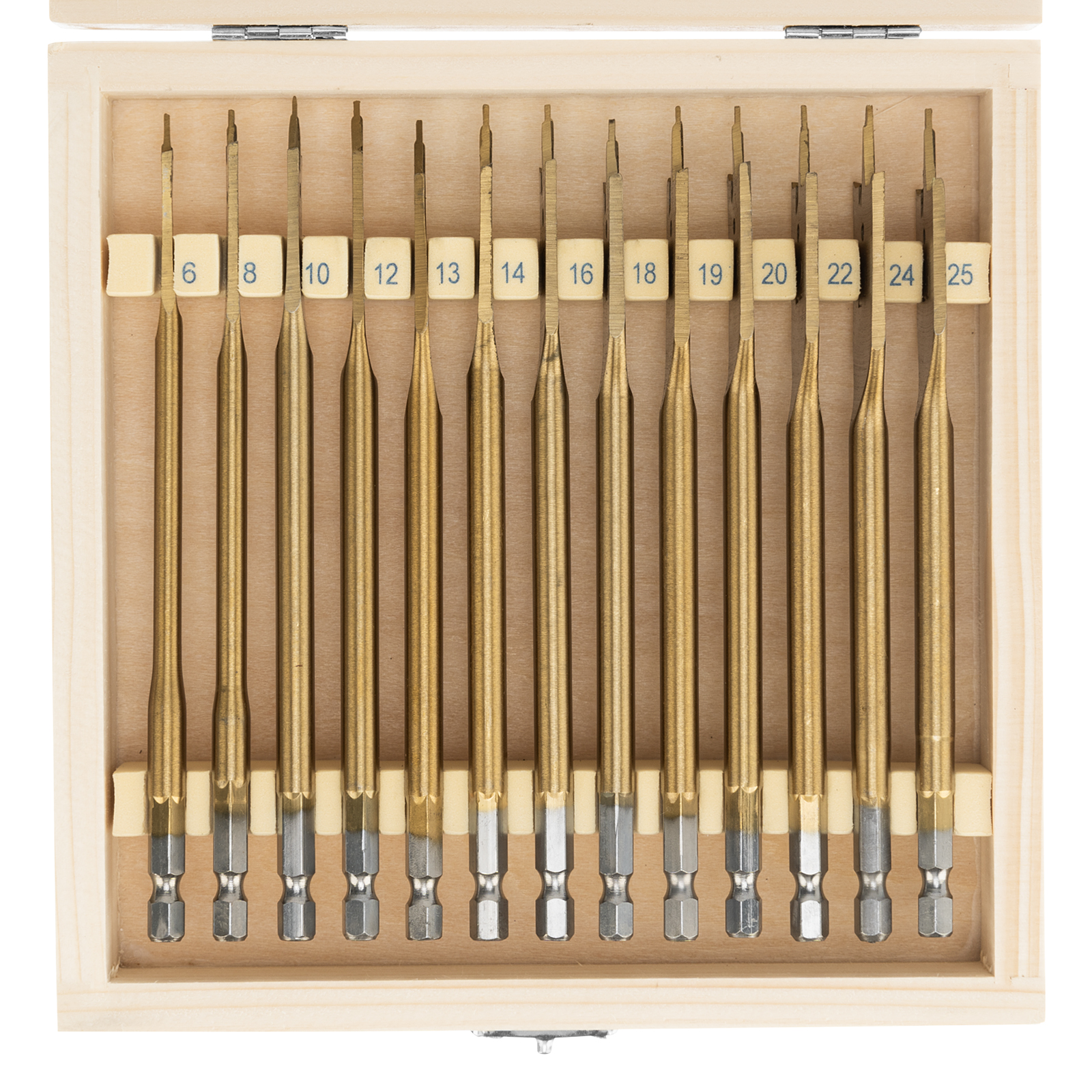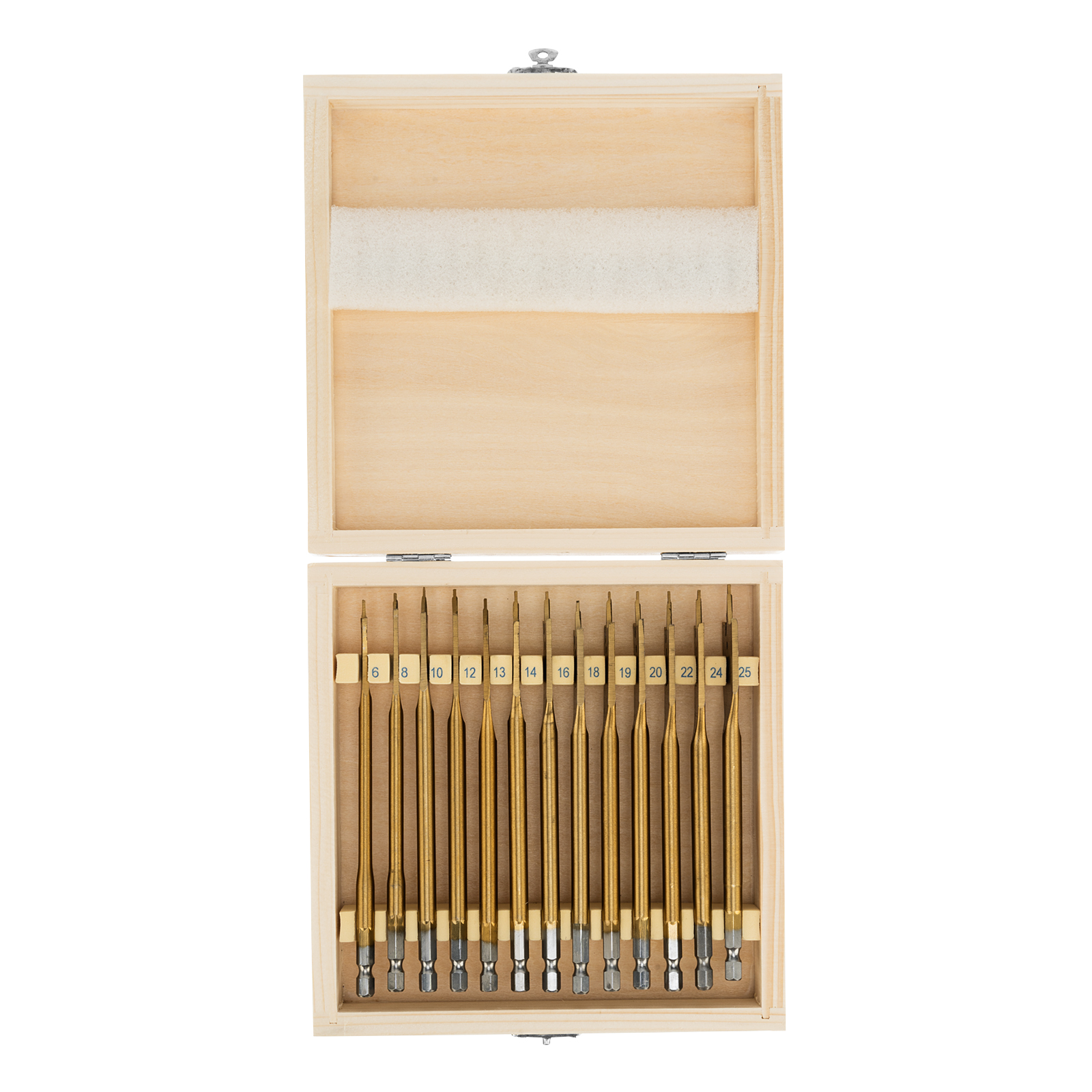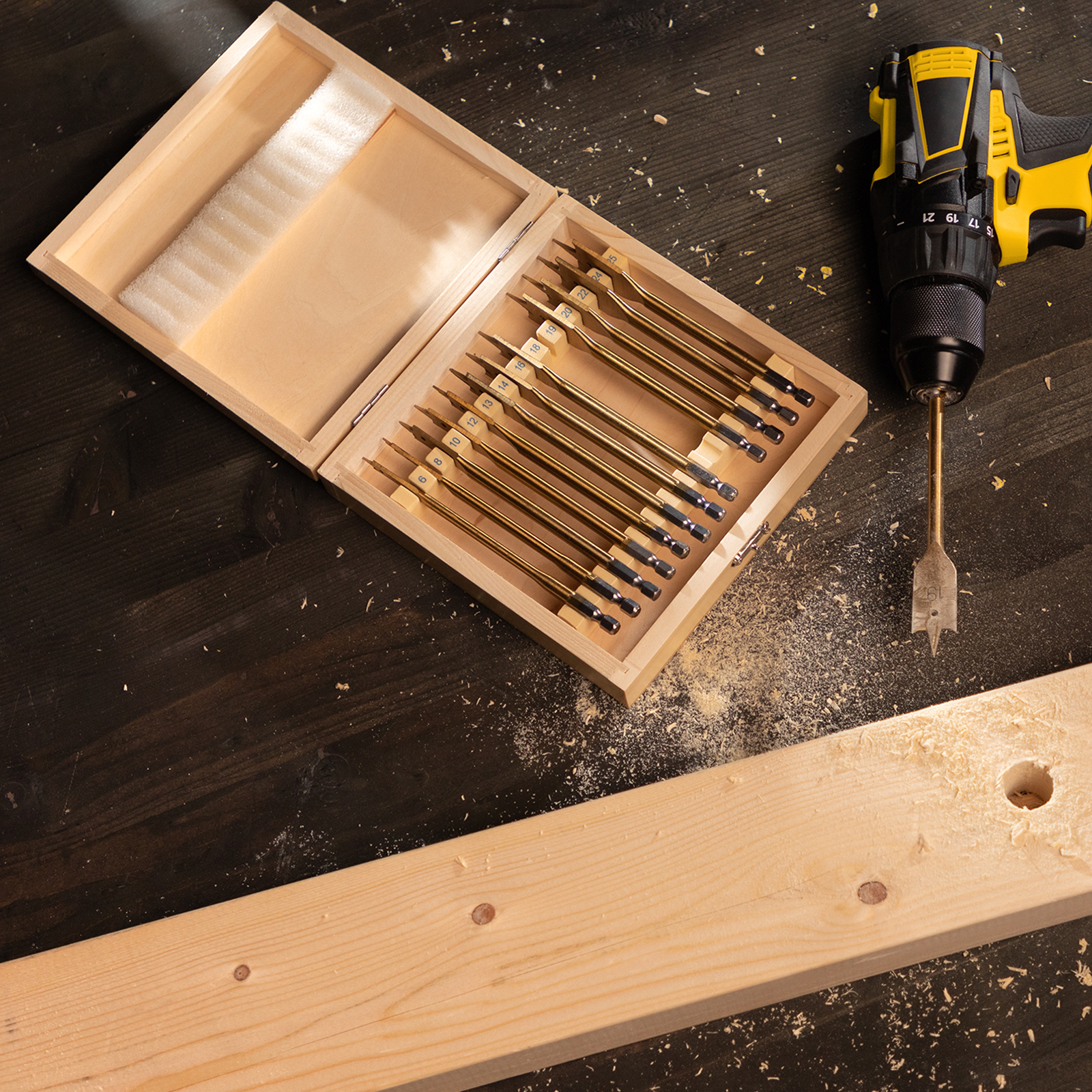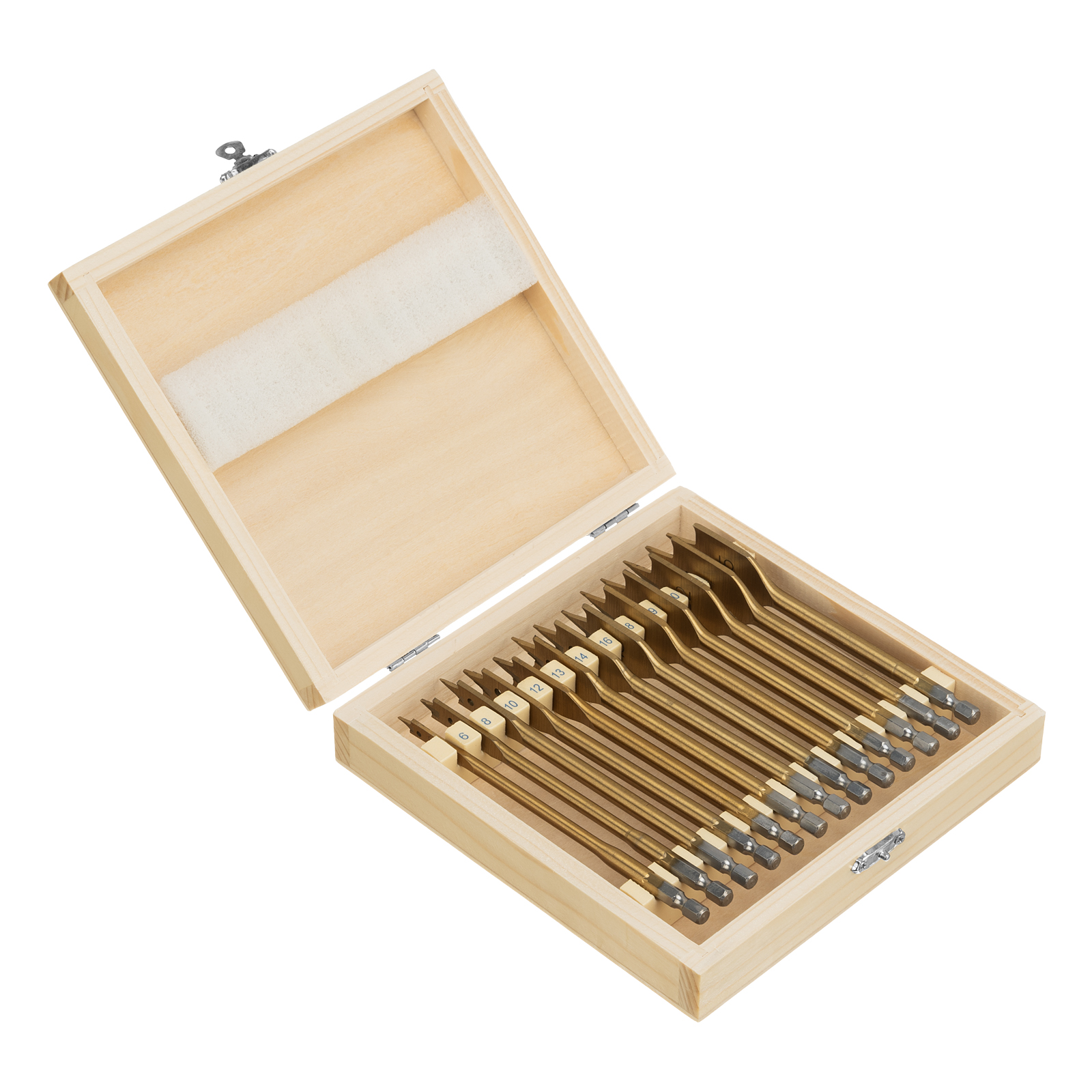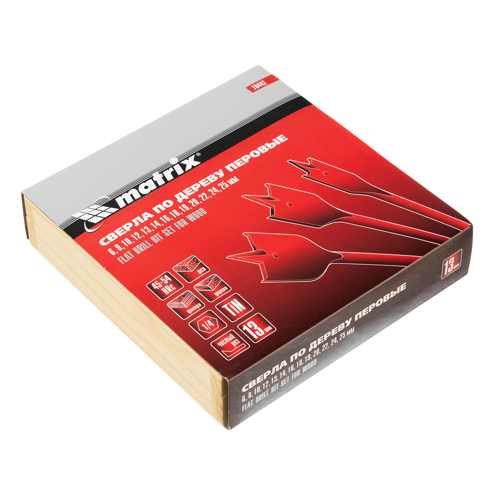 Набор Matrix 70442 состоит из 13 перовых сверл по дереву диаметром 6-8-10-12-13-14-16-18-19-20-22-24-25 мм и поставляется в деревянном кейсе. Позволяет получать сквозные и глухие отверстия в древесине. Сверла устанавливаются на электрические и механические дрели или шуруповерты.