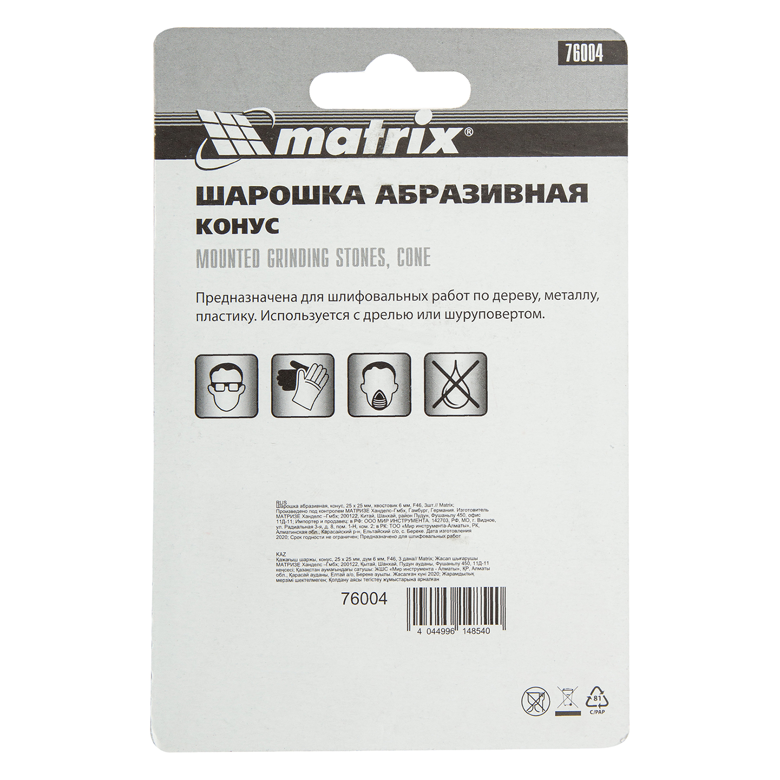 Шарошка абразивная Matrix 76004 размером 25 х 25 мм, с цилиндрическим хвостовиком 6 мм, 3 шт., выполнена в виде конуса с абразивом зернистостью F46. Она устанавливается в качестве оснастки на дрель, шуруповерт, а также ПШМ. Позволяет зачищать отверстия, снимать фаски и удалять заусенцы. Шарошка рассчитана на бытовое и профессиональное применение.
