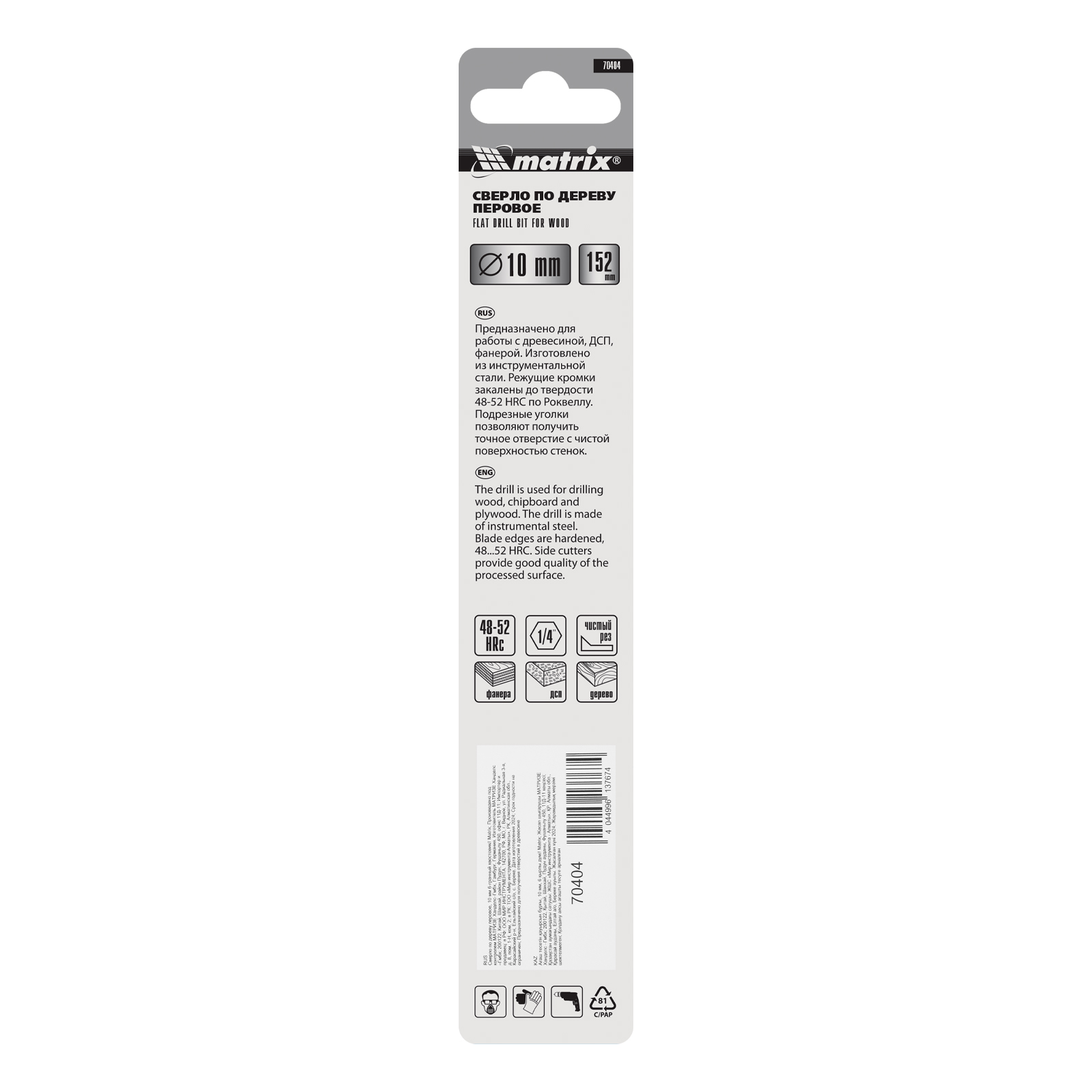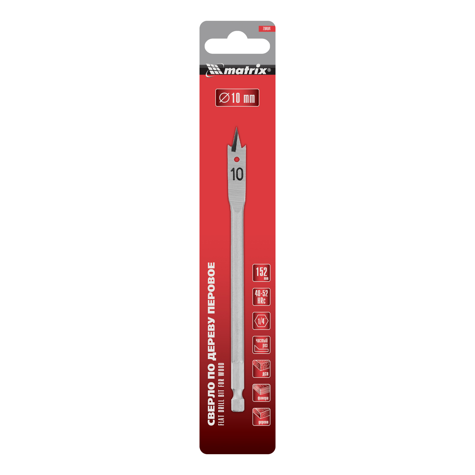 Перовое сверло по дереву Matrix 70404 диаметром 10 мм, с 6-гранным хвостовиком, имеет рабочую часть в виде «лопатки» с режущими кромками по бокам, поэтому эффективно для сверления глубоких сквозных и глухих отверстий. Устанавливается на ручную механическую, электрическую дрель или шуруповерт, эффективно для сверления древесины любых пород.