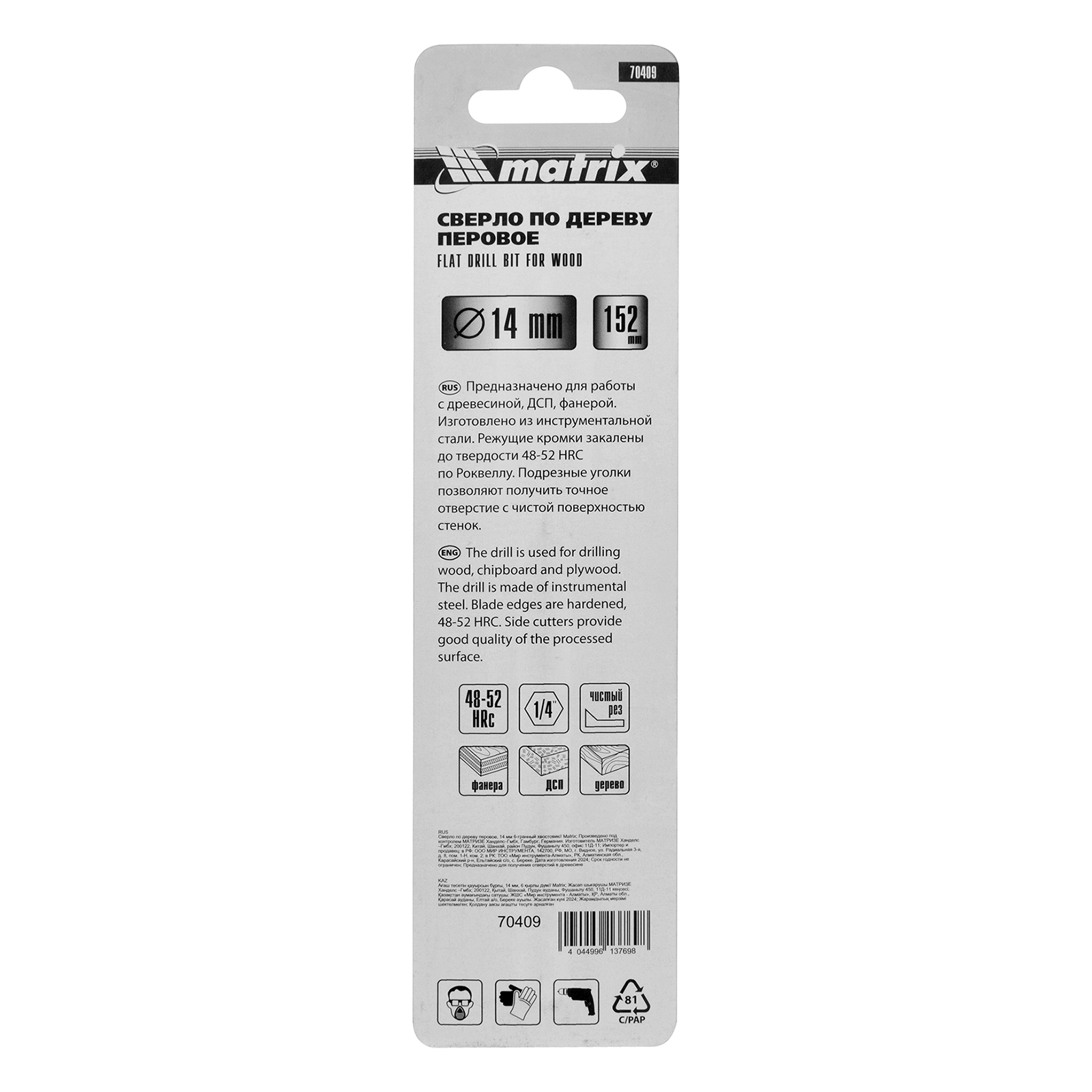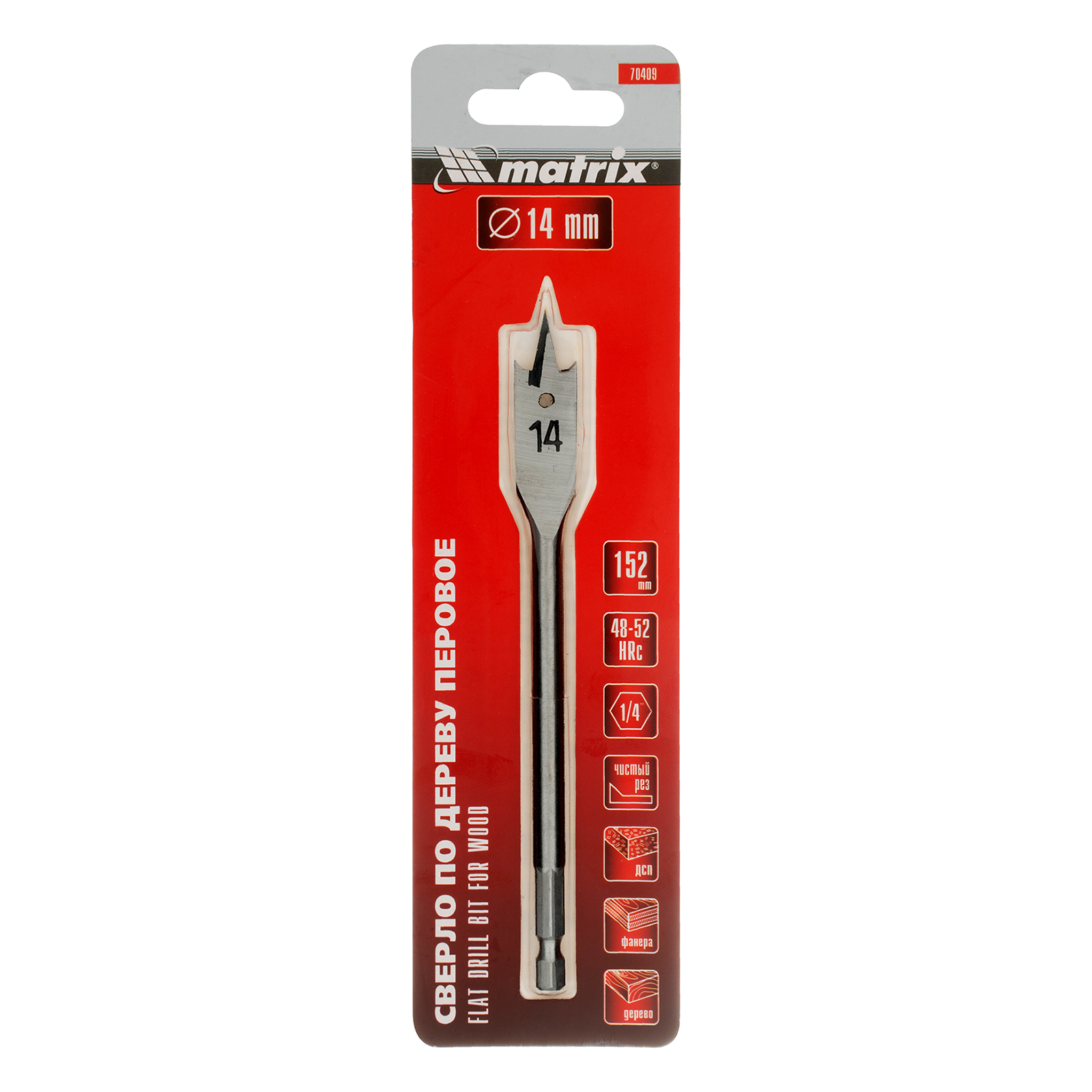 Перовое сверло по дереву Matrix 70409 диаметром 14 мм, с 6-гранным хвостовиком, имеет рабочую часть в виде «лопатки» с режущими кромками по бокам, поэтому эффективно для сверления глубоких сквозных и глухих отверстий. Оснастка устанавливается на ручную механическую или электрическую дрель, сверлильный станок, с ее помощью можно сверлить древесину любых пород.
