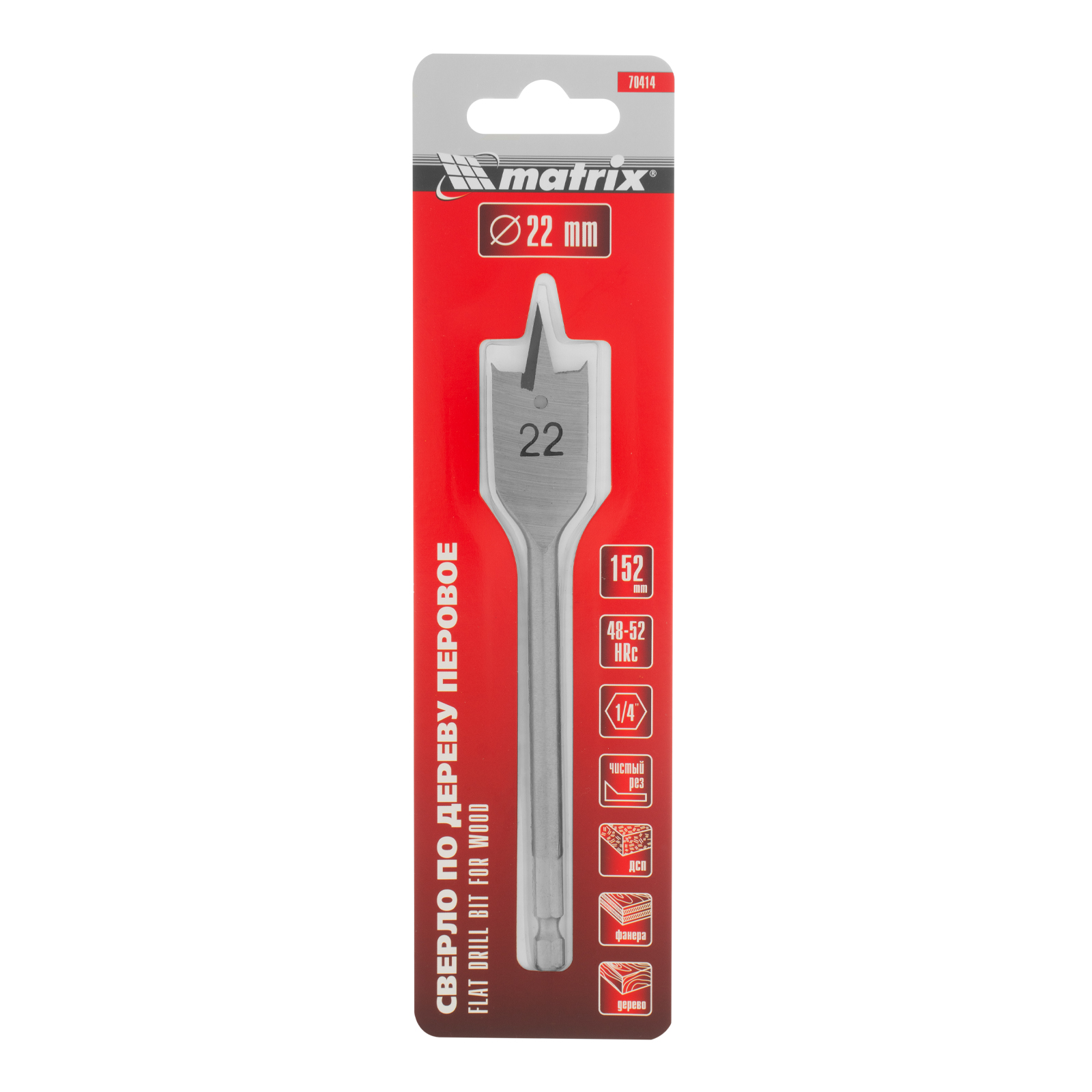 Перовое сверло по дереву Matrix 70414 диаметром 22 мм, с 6-гранным хвостовиком, имеет рабочую часть в виде «лопатки» с режущими кромками по бокам, поэтому эффективно для сверления глубоких сквозных и глухих отверстий. Оснастка устанавливается на ручную механическую или электрическую дрель, сверлильный станок, с ее помощью можно сверлить древесину любых пород.