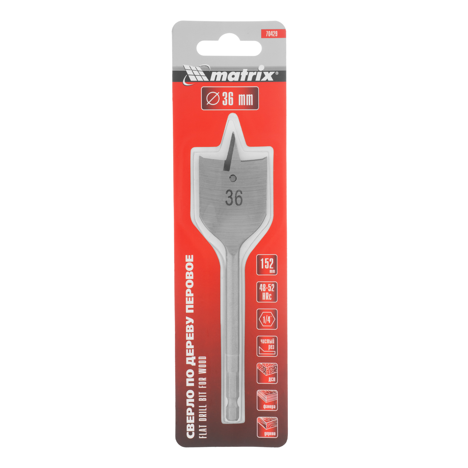 Перовое сверло по дереву Matrix 70429 диаметром 36 мм, с 6-гранным хвостовиком, имеет рабочую часть в виде «лопатки» с режущими кромками по бокам, поэтому эффективно для сверления глубоких сквозных и глухих отверстий. Оснастка устанавливается на ручную механическую или электрическую дрель, сверлильный станок, с ее помощью можно сверлить древесину любых пород.