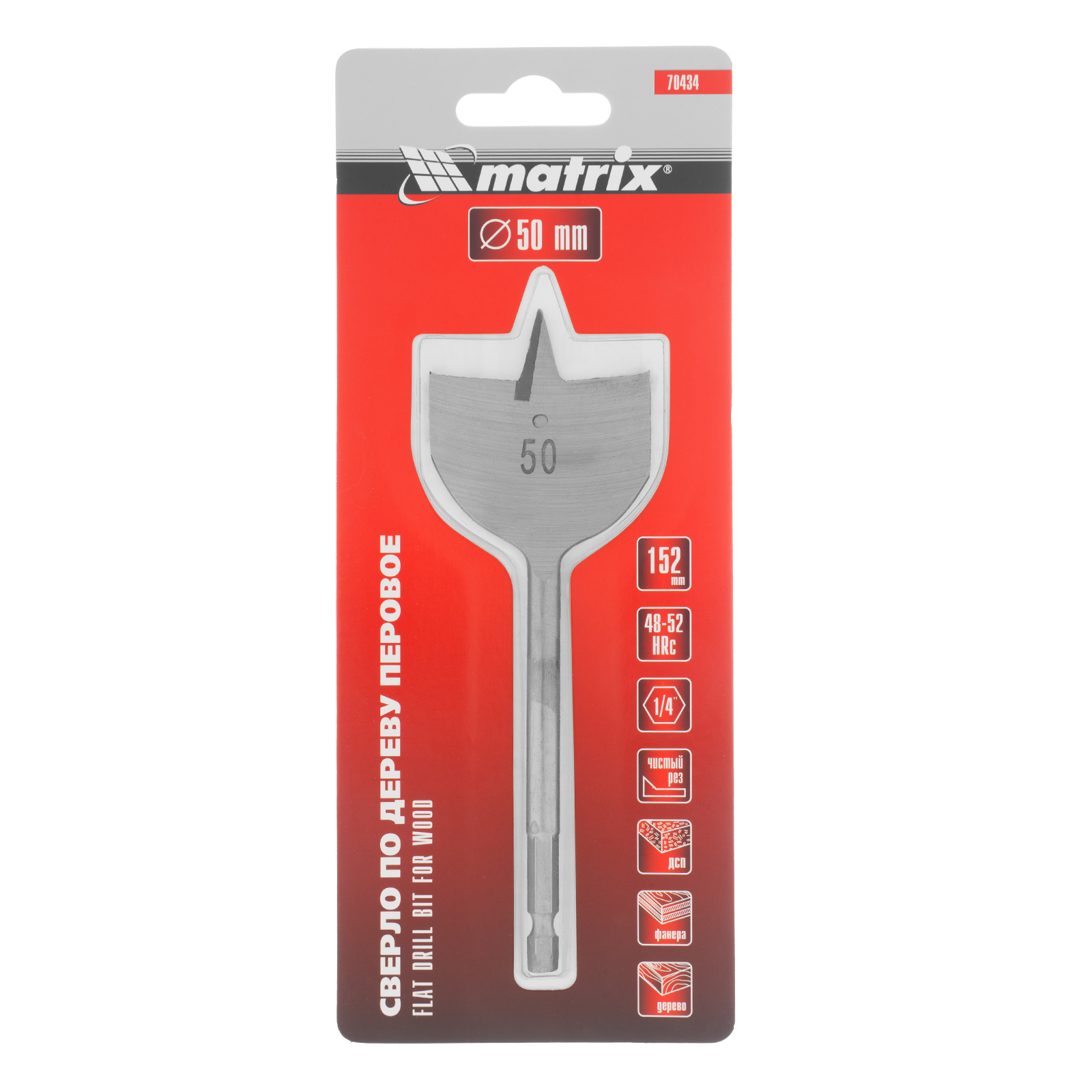 Перовое сверло по дереву Matrix 70434 диаметром 50 мм, с 6-гранным хвостовиком, имеет рабочую часть в виде «лопатки» с режущими кромками по бокам, поэтому эффективно для сверления глубоких сквозных и глухих отверстий. Оснастка устанавливается на ручную механическую или электрическую дрель, сверлильный станок, с ее помощью можно сверлить древесину любых пород.