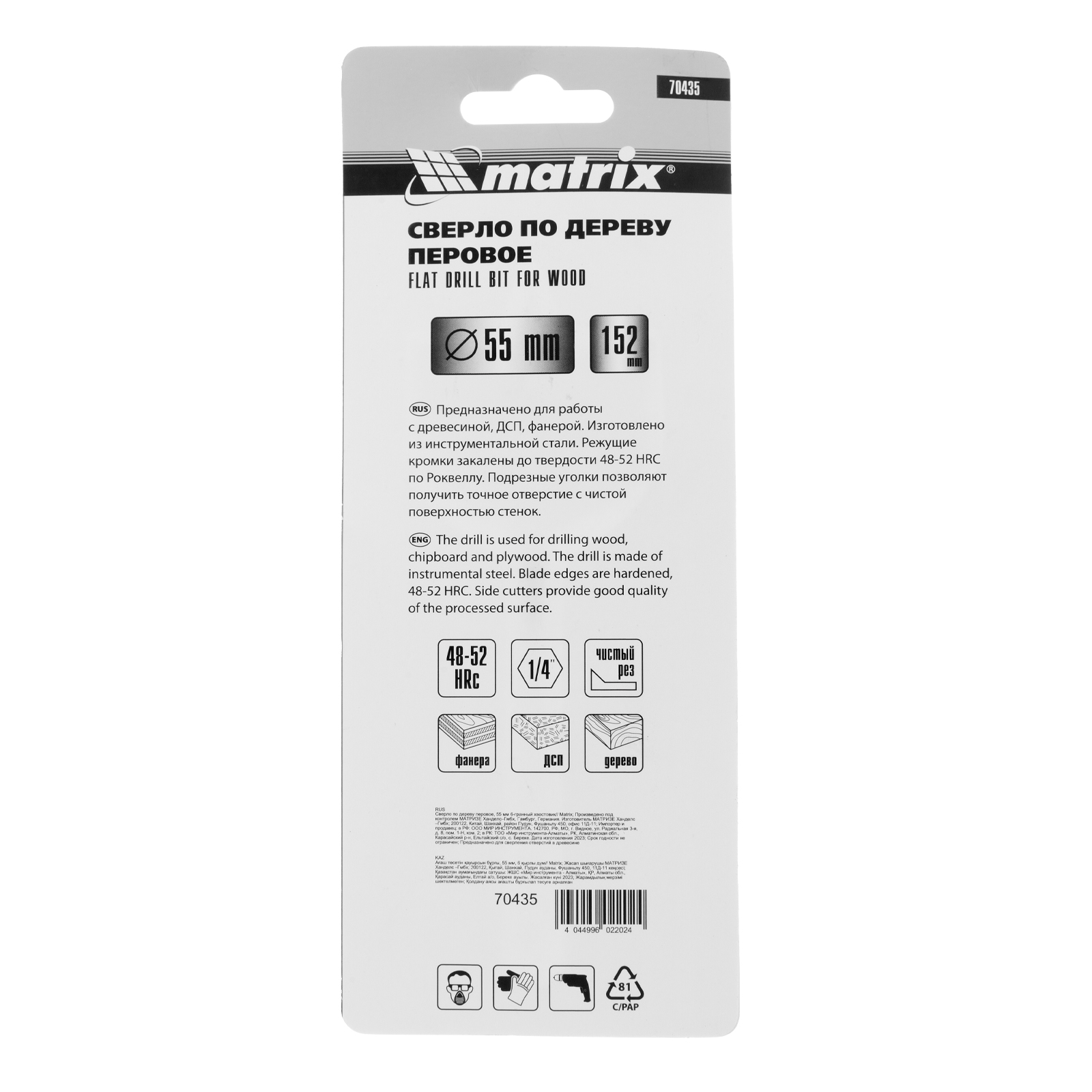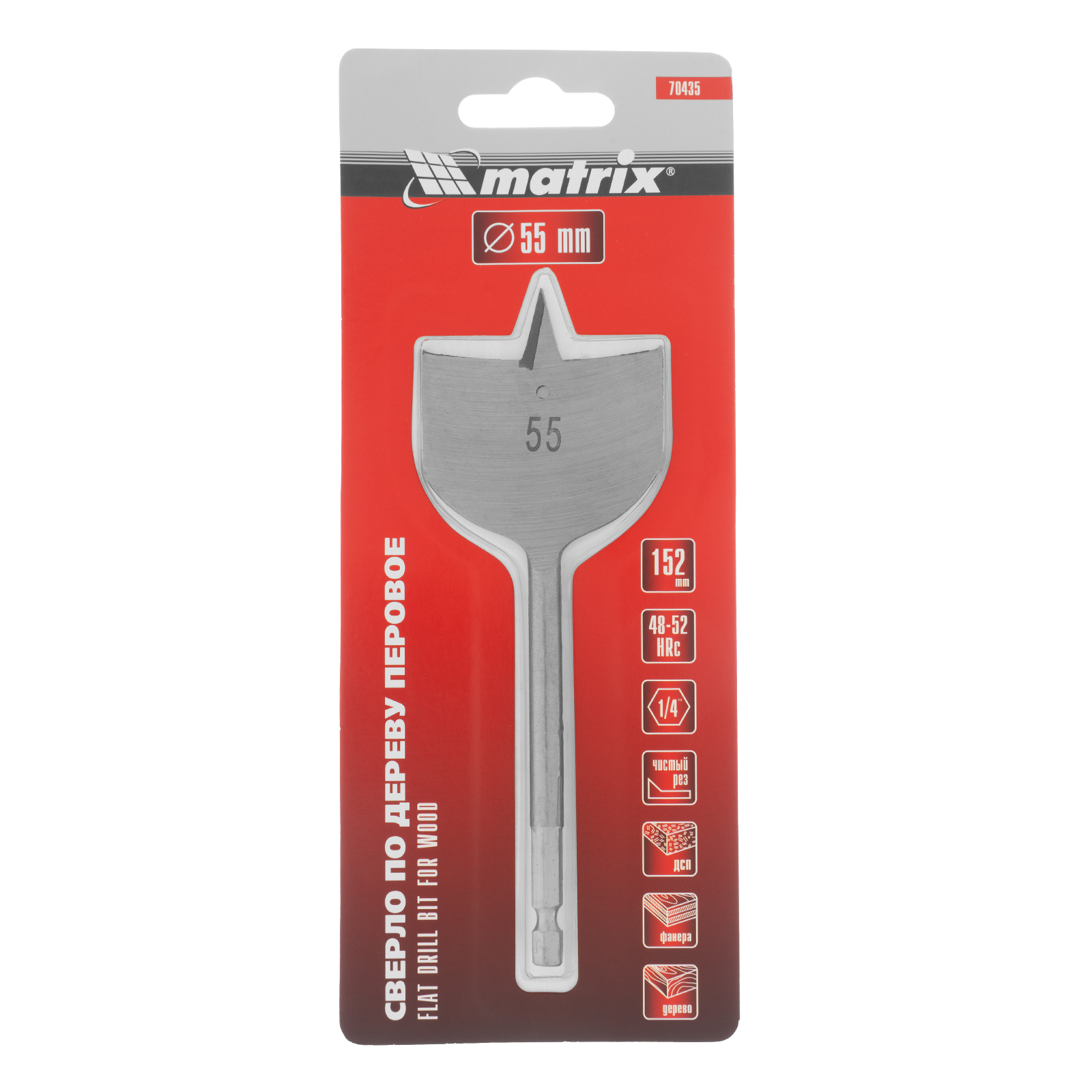 Перовое сверло по дереву Matrix 70435 диаметром 55 мм, с 6-гранным хвостовиком, имеет рабочую часть в виде «лопатки» с режущими кромками по бокам, поэтому эффективно для сверления глубоких сквозных и глухих отверстий. Оснастка устанавливается на ручную механическую или электрическую дрель, сверлильный станок, с ее помощью можно сверлить древесину любых пород.