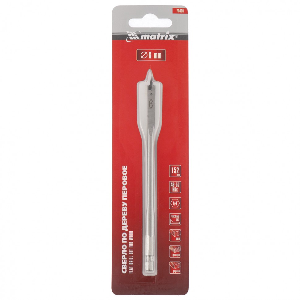 Перовое сверло по дереву Matrix 70400 диаметром 6 мм, с 6-гранным хвостовиком, имеет рабочую часть в виде «лопатки» с режущими кромками по бокам, поэтому эффективно для сверления глубоких сквозных и глухих отверстий. Устанавливается на ручную механическую, электрическую дрель или шуруповерт, эффективно для сверления древесины любых пород.