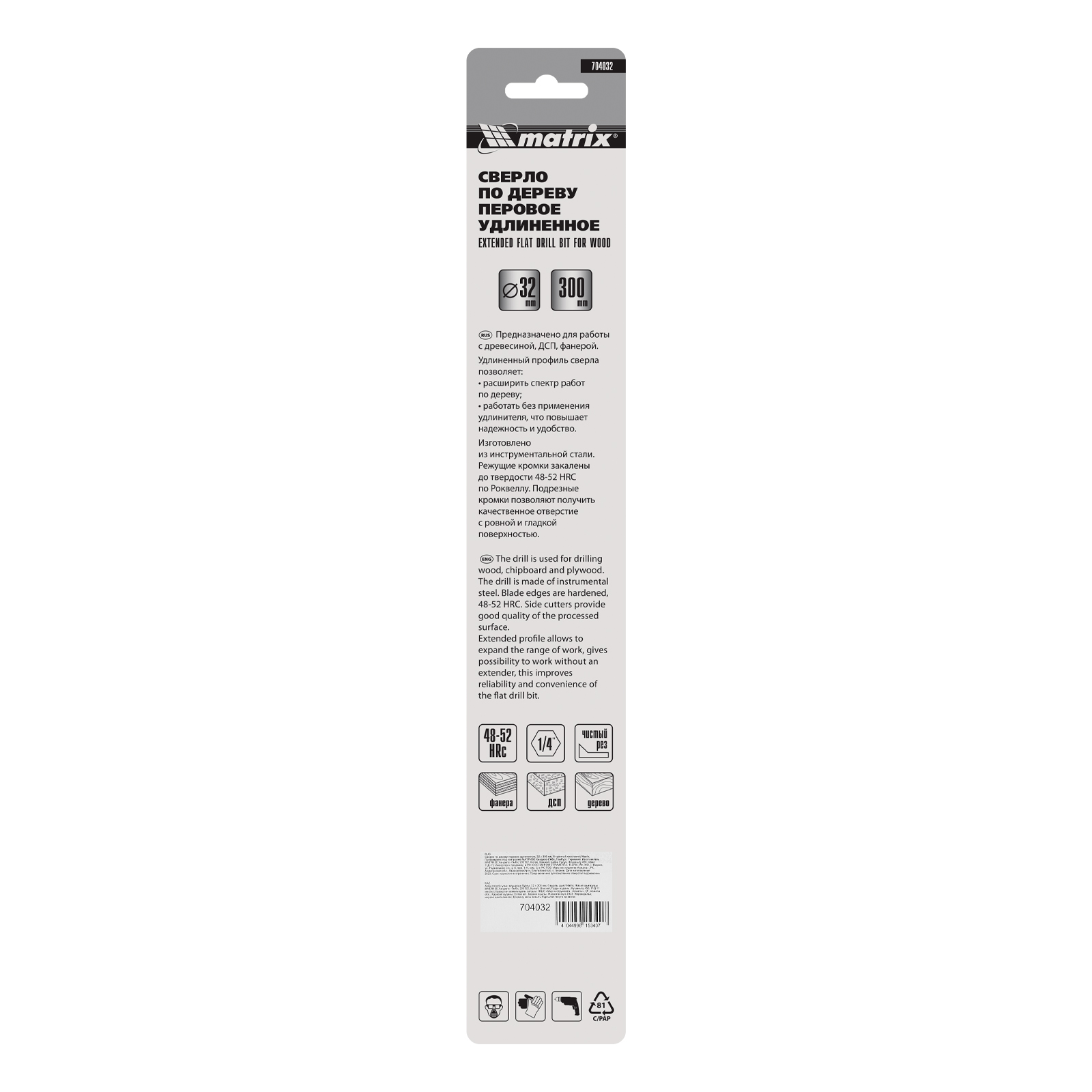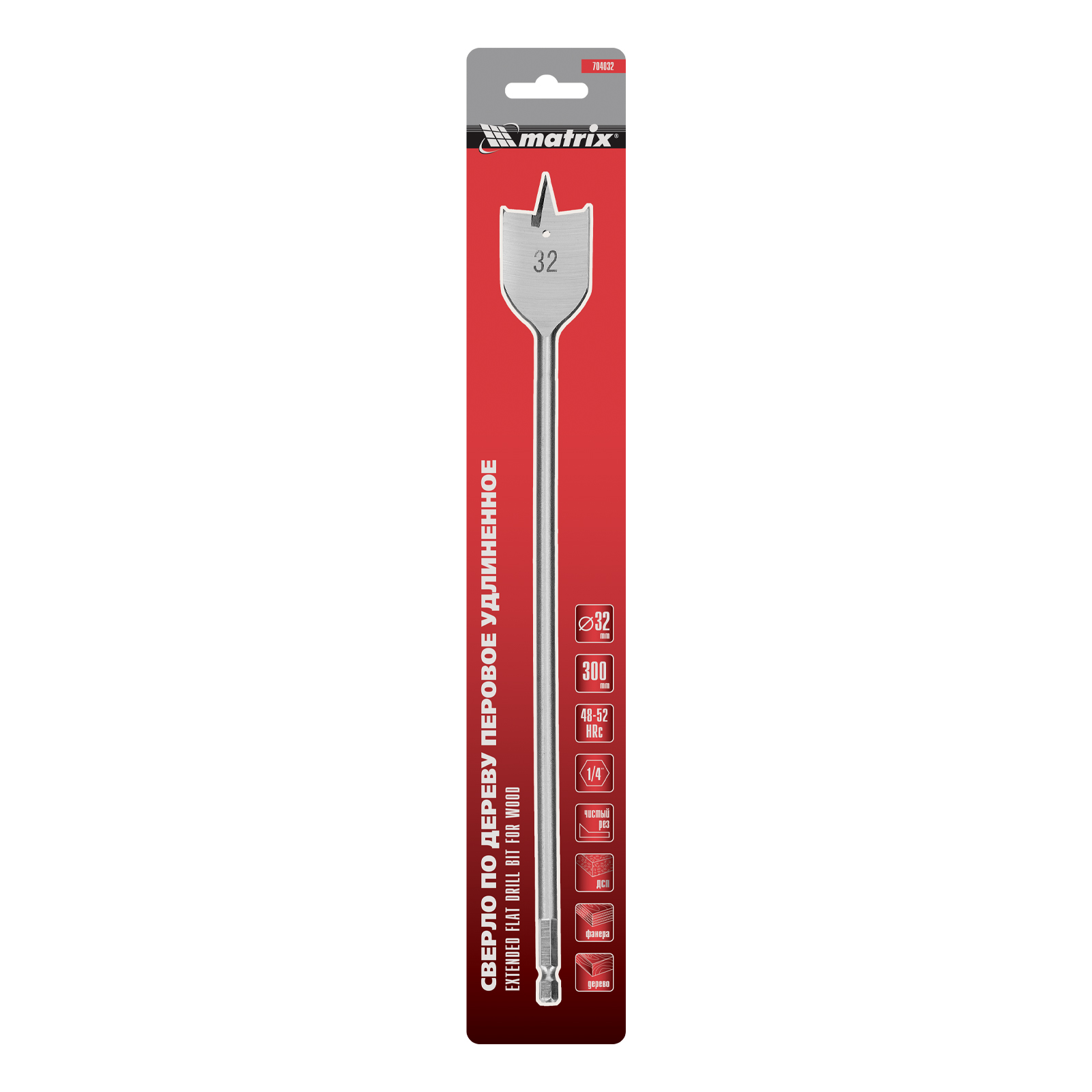Удлиненное перовое сверло по дереву Matrix 704032 диаметром 32 мм, с 6-гранным хвостовиком, за счет длины 300 мм позволяет получать глубокие отверстия без необходимости использования удлинителя. Эффективно сверлит древесину любой твердости.