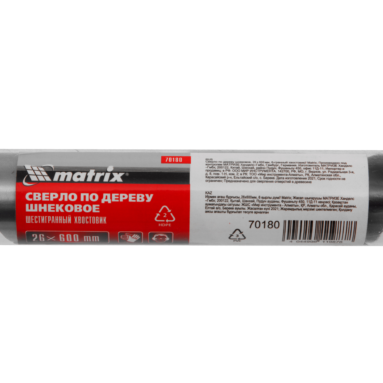 Шнековое сверло по дереву Matrix 70180 размером 26 х 600 мм, с 6-гранным хвостовиком, предназначено для получения глубоких отверстий. Подходит для работы как с мягкими, так и с твердыми породами древесины. Конструкция сверла рассчитана на интенсивное использование с высокими нагрузками в ходе строительных, ремонтных и отделочных работ.