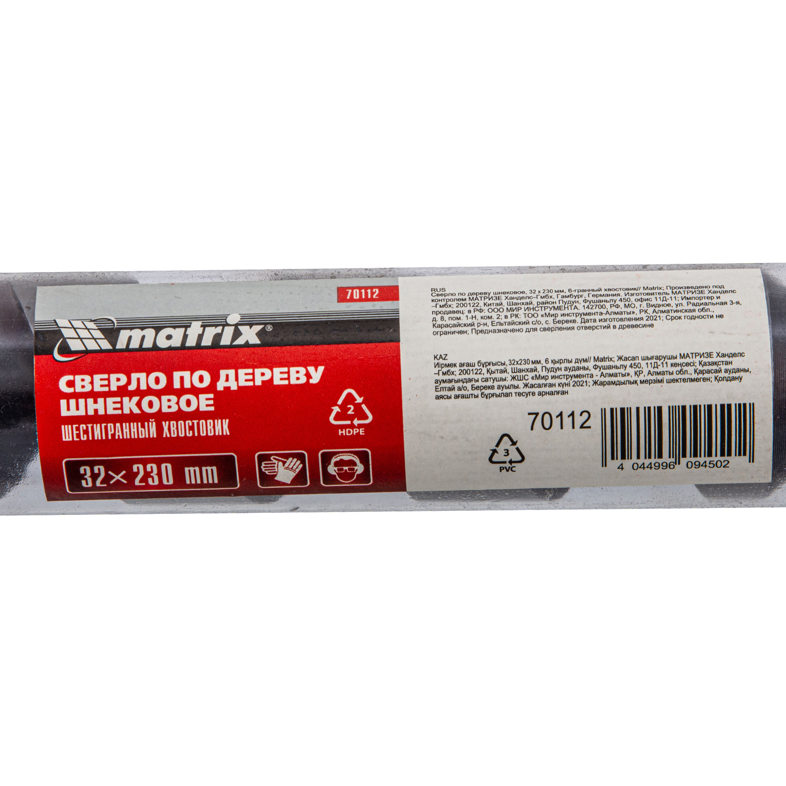 Шнековое сверло по дереву Matrix 70112 размером 32 х 230 мм, с 6-гранным хвостовиком, предназначено для получения глубоких отверстий. Подходит для работы как с мягкими, так и с твердыми породами древесины. Конструкция сверла рассчитана на интенсивное использование с высокими нагрузками в ходе строительных, ремонтных и отделочных работ.