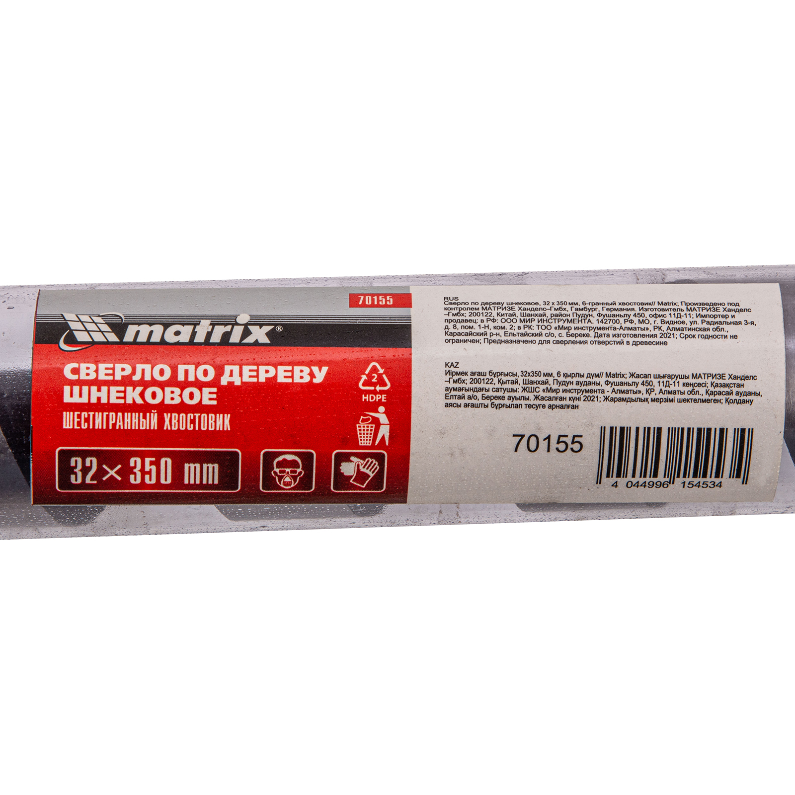 Шнековое сверло по дереву Matrix 70155 размером 32 х 350 мм, с 6-гранным хвостовиком, предназначено для получения глубоких отверстий. Подходит для работы как с мягкими, так и с твердыми породами древесины. Конструкция сверла рассчитана на интенсивное использование с высокими нагрузками в ходе строительных, ремонтных и отделочных работ.