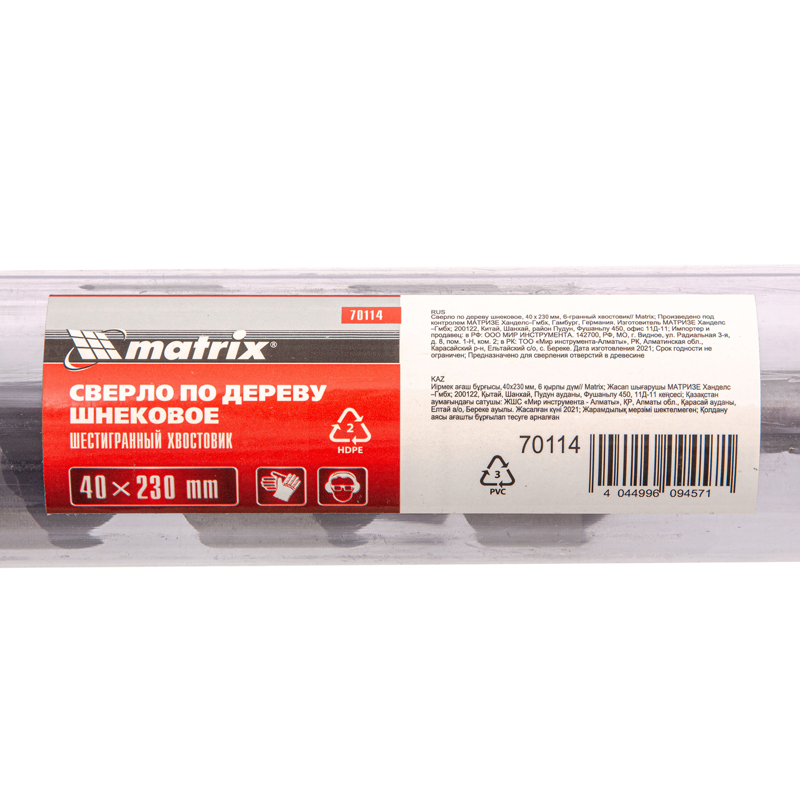 Шнековое сверло по дереву Matrix 70114 размером 40 х 230 мм, с 6-гранным хвостовиком, предназначено для получения глубоких отверстий. Подходит для работы как с мягкими, так и с твердыми породами древесины. Конструкция сверла рассчитана на интенсивное использование с высокими нагрузками в ходе строительных, ремонтных и отделочных работ.