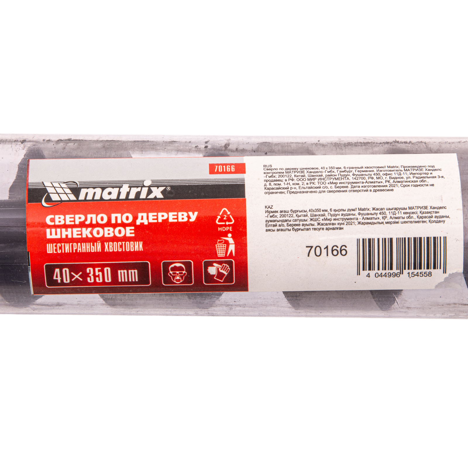 Шнековое сверло по дереву Matrix 70166 размером 40 х 350 мм, с 6-гранным хвостовиком, предназначено для получения глубоких отверстий. Подходит для работы как с мягкими, так и с твердыми породами древесины. Конструкция сверла рассчитана на интенсивное использование с высокими нагрузками в ходе строительных, ремонтных и отделочных работ.