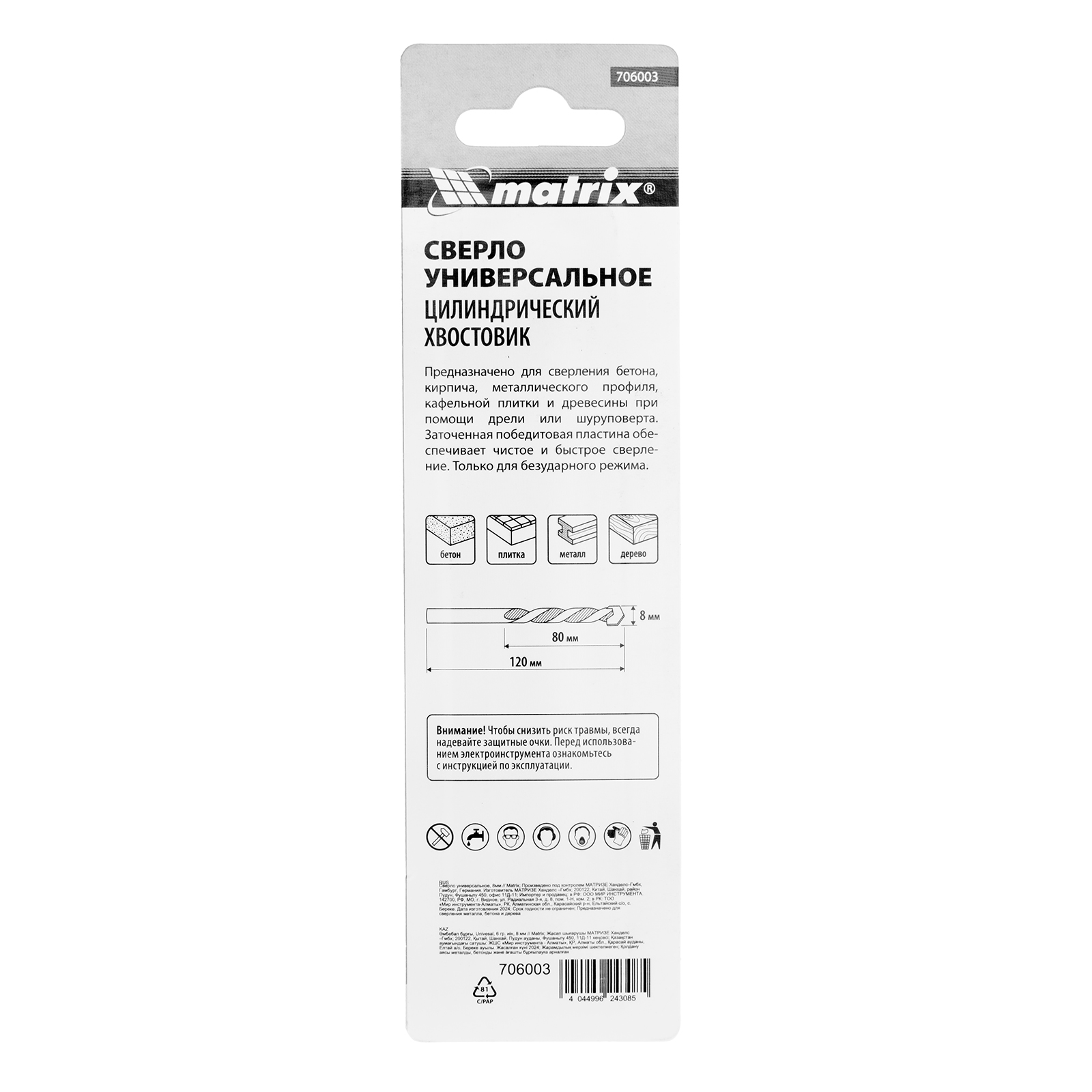 Универсальное сверло Matrix 706003 длиной 120 мм позволяет получать отверстия диаметром 8 мм в древесине, керамической плитке, а также в стали и бетоне с помощью дрели или шуруповерта. Твердосплавная режущая пластина обеспечивает эффективную работу с любыми материалами. Сверло пригодится в мастерской, гараже, а также дома и на даче.