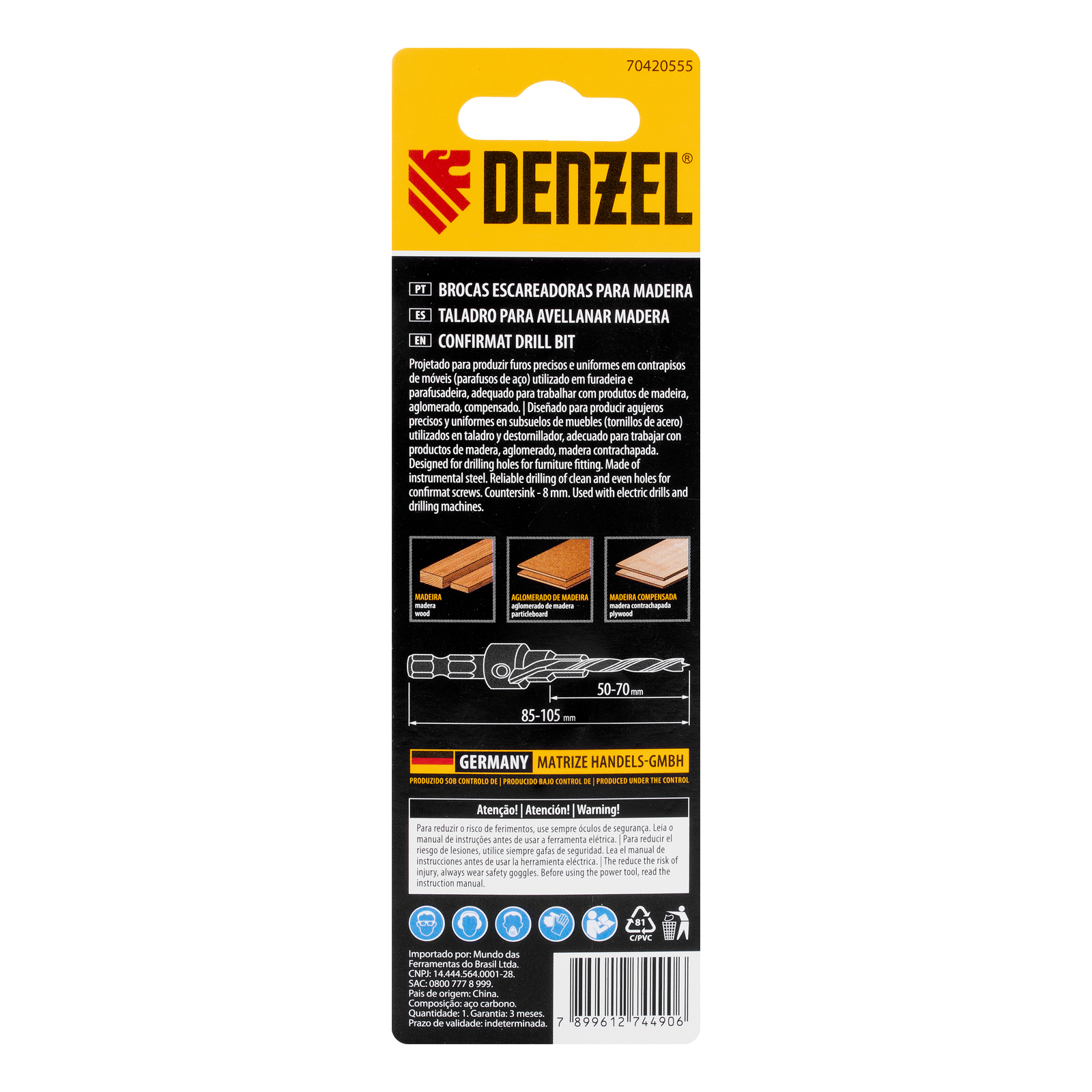 Сверло-зенкер Denzel 704205 диаметром 5 мм предназначено для получения точных и ровных отверстий под мебельную стяжку (евровинты, конфирмат) без дополнительного зенкования. Устанавливается в патрон дрели или сверлильного станка, подходит для работы с изделиями из древесины, ДСП, ЛДСП, фанеры. Оснастка пригодится во время сборки мебели и проведения ремонтных работ.