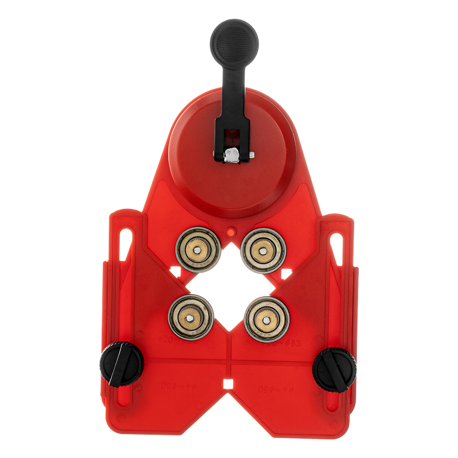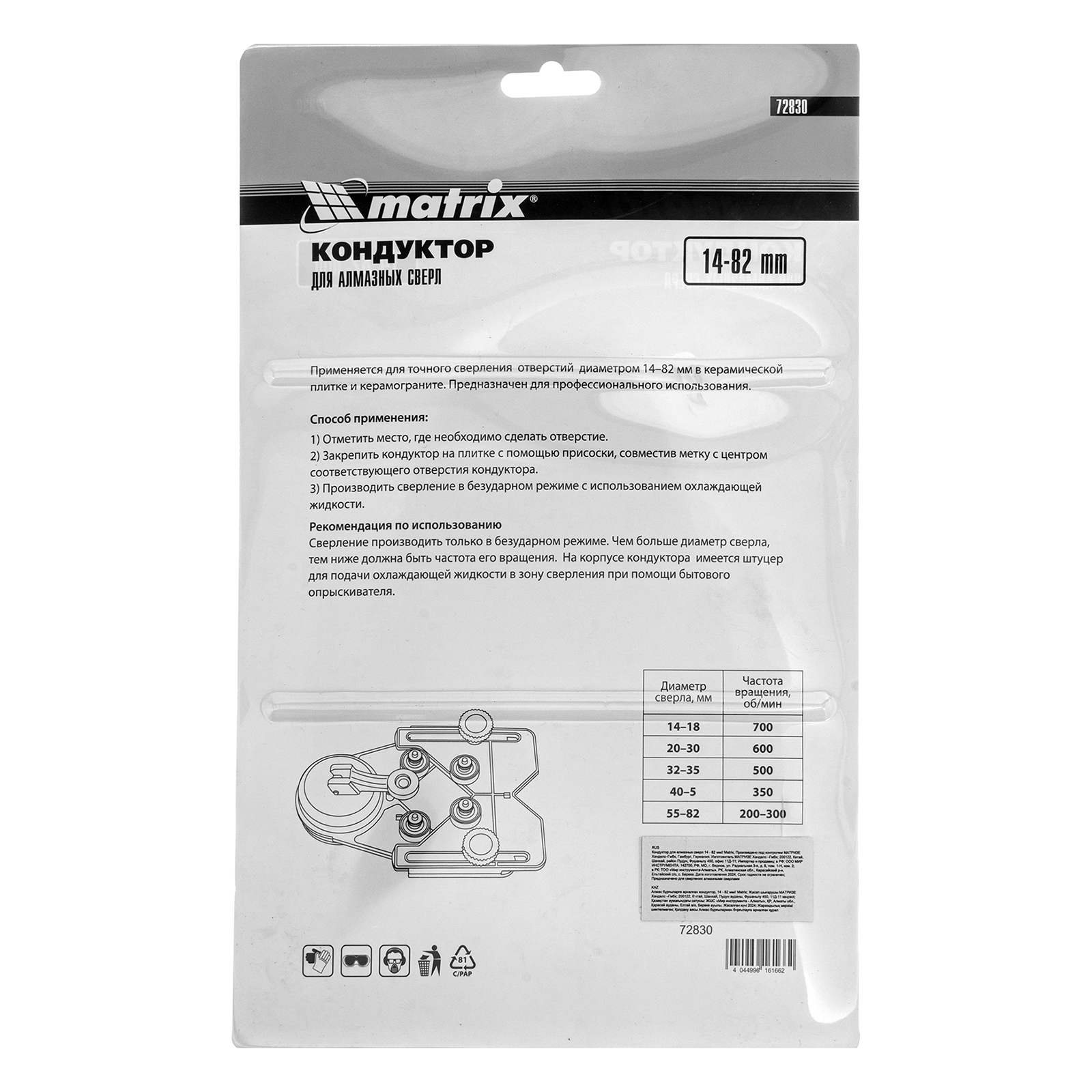 Кондуктор Matrix 72830 имеет 4 подшипника, позволяющих максимально точно позиционировать алмазные сверла и коронки размером 14-82 мм. Препятствует сдвигу оснастки и облегчает засверливание. Простой механизм фиксации позволяет за несколько секунд установить оснастку в нужное положение, экономя время мастера. Изделие используется для работ по керамической плитке, граниту, керамограниту, стеклу и мрамору.