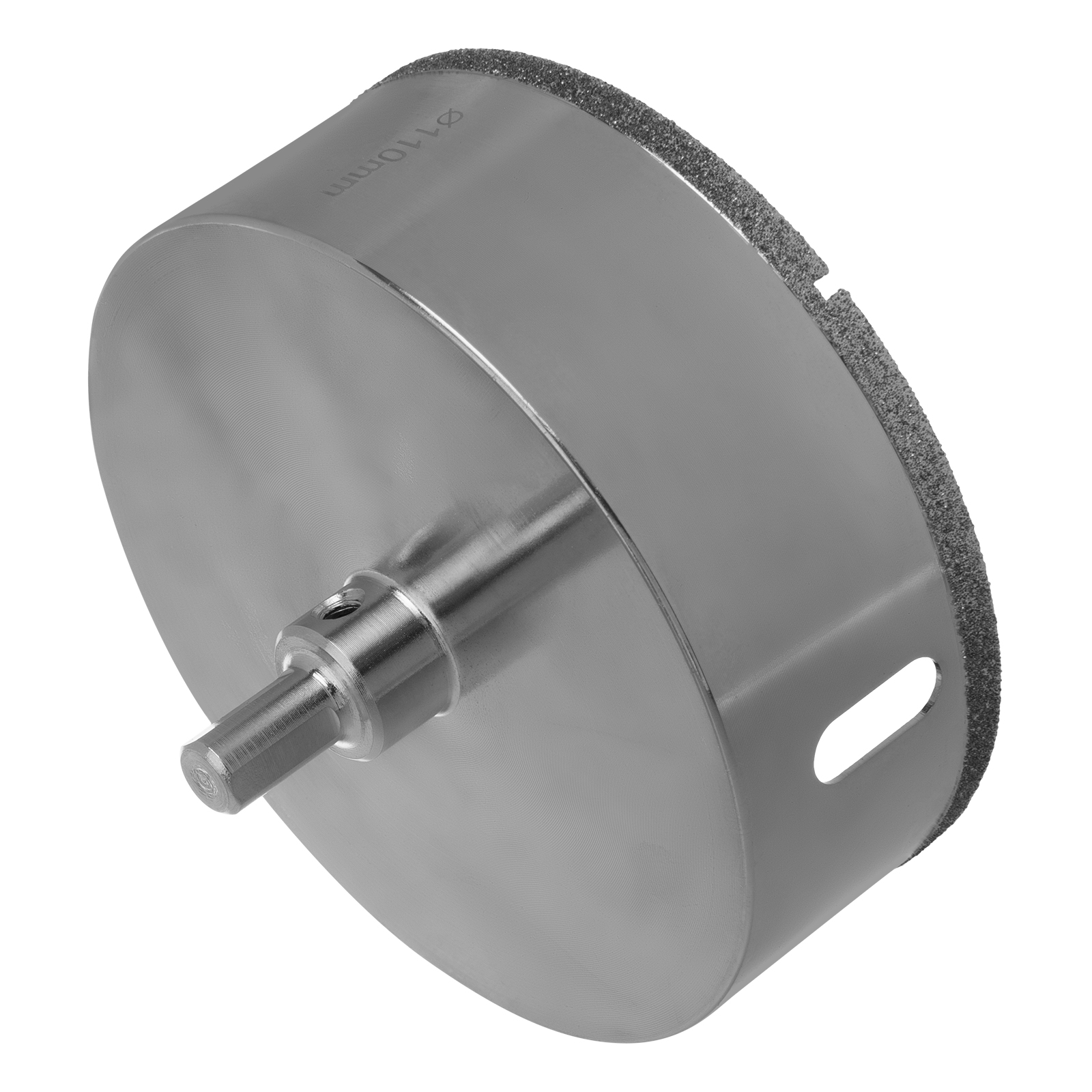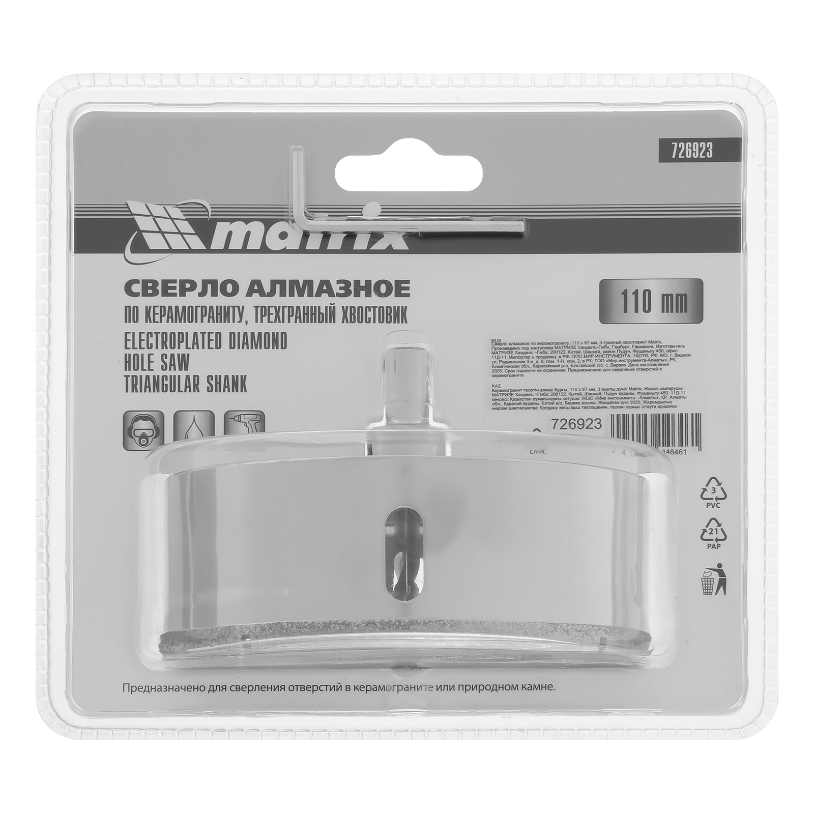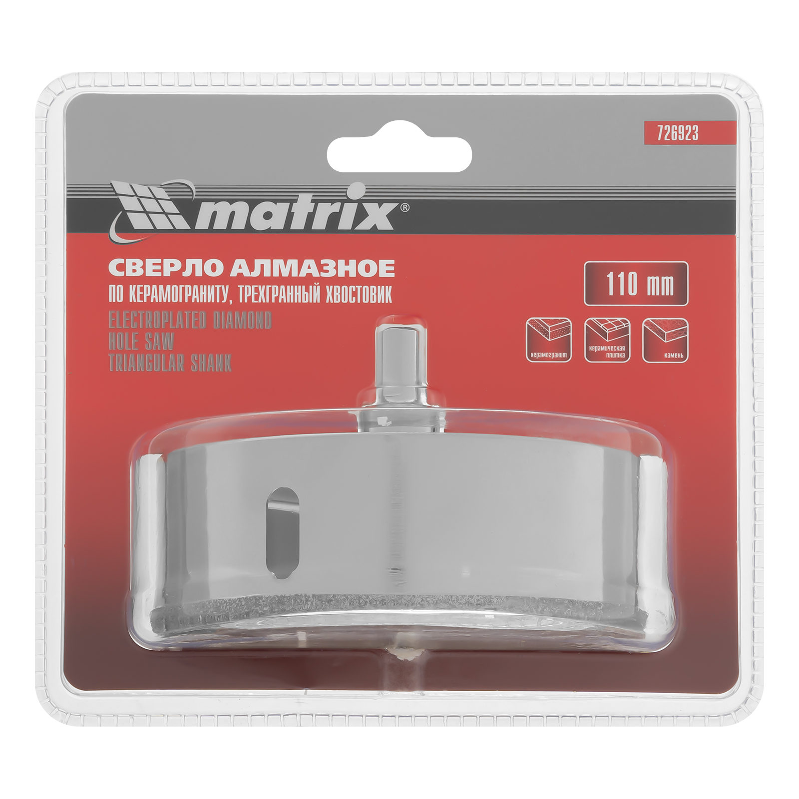 Универсальное алмазное сверло по керамограниту Matrix 726923 размером 110 х 67 мм, с 3-гранным хвостовиком, применяется для получения отверстий в стекле, плитке, кафеле. За счет высокой концентрации алмазов в режущем слое оно легко справляется со сверлением керамогранита. Сверло рассчитано на профессиональное использование с дрелями и шуруповертами. Водяное охлаждение в процессе работы значительно повышает срок службы оснастки.