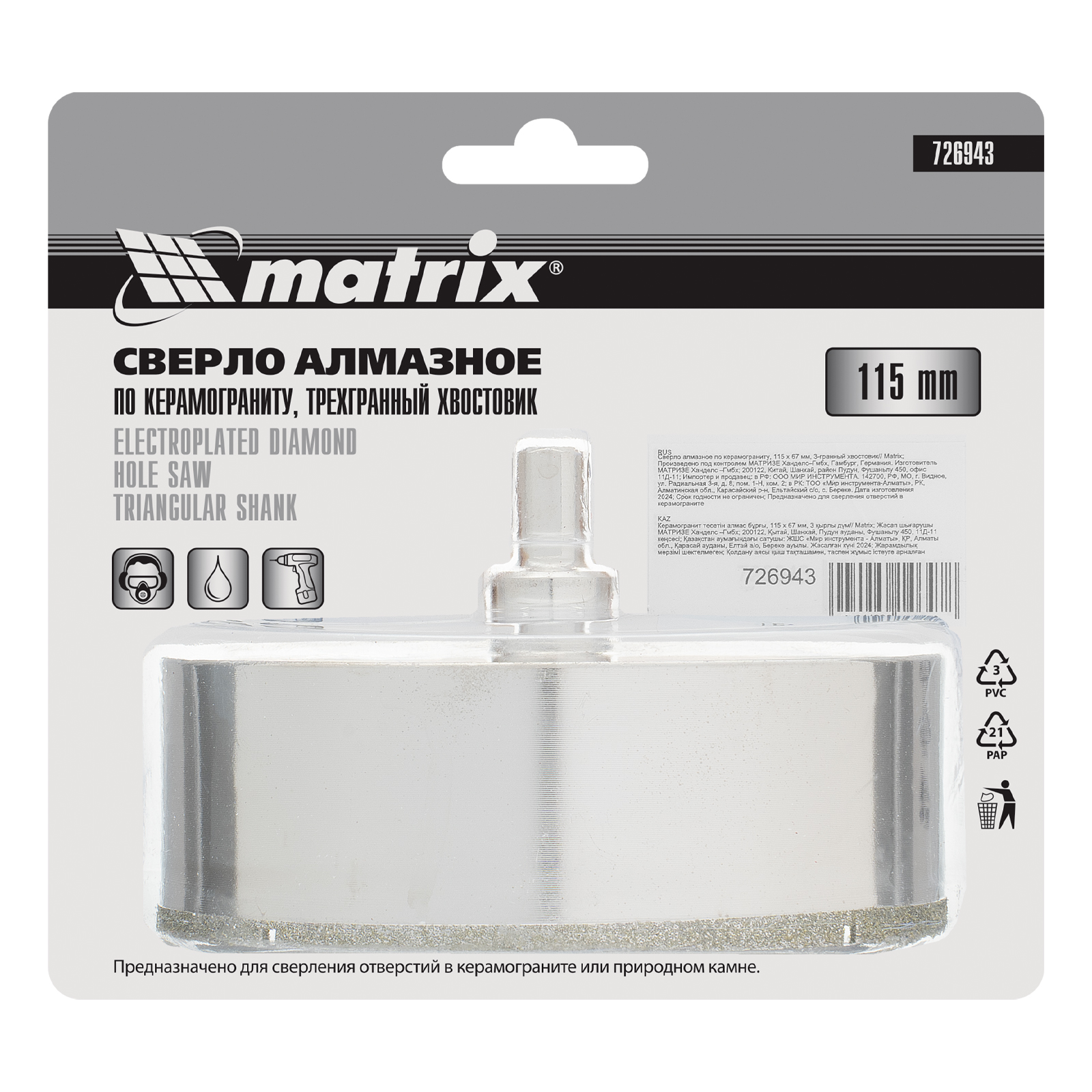 Универсальное алмазное сверло по керамограниту Matrix 726943 размером 115 х 67 мм, с 3-гранным хвостовиком, применяется для получения отверстий в стекле, плитке, кафеле. За счет высокой концентрации алмазов в режущем слое оно легко справляется со сверлением керамогранита. Сверло рассчитано на профессиональное использование с дрелями и шуруповертами. Водяное охлаждение в процессе работы значительно повышает срок службы оснастки.