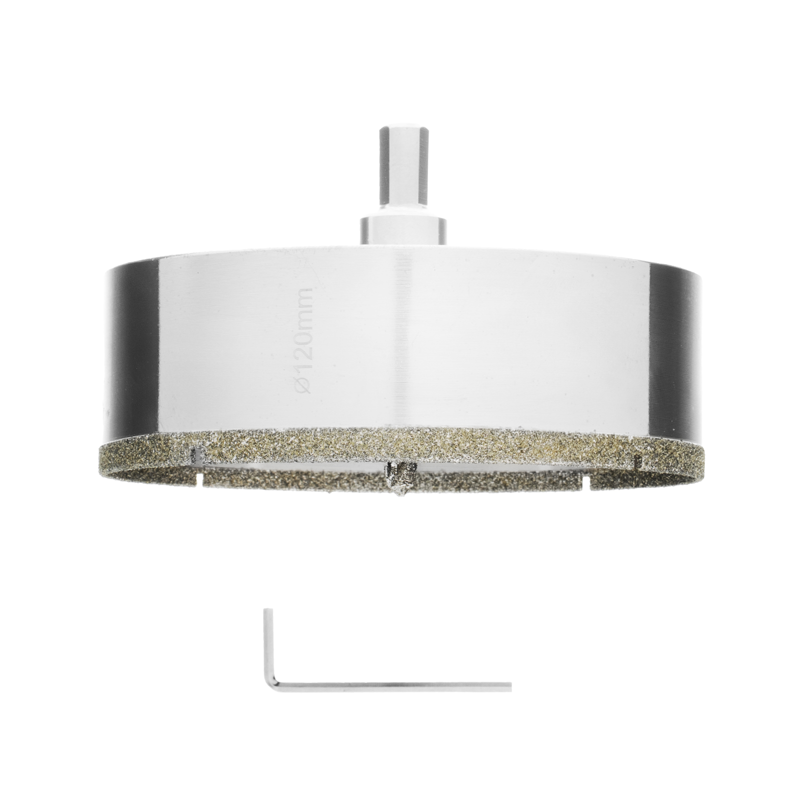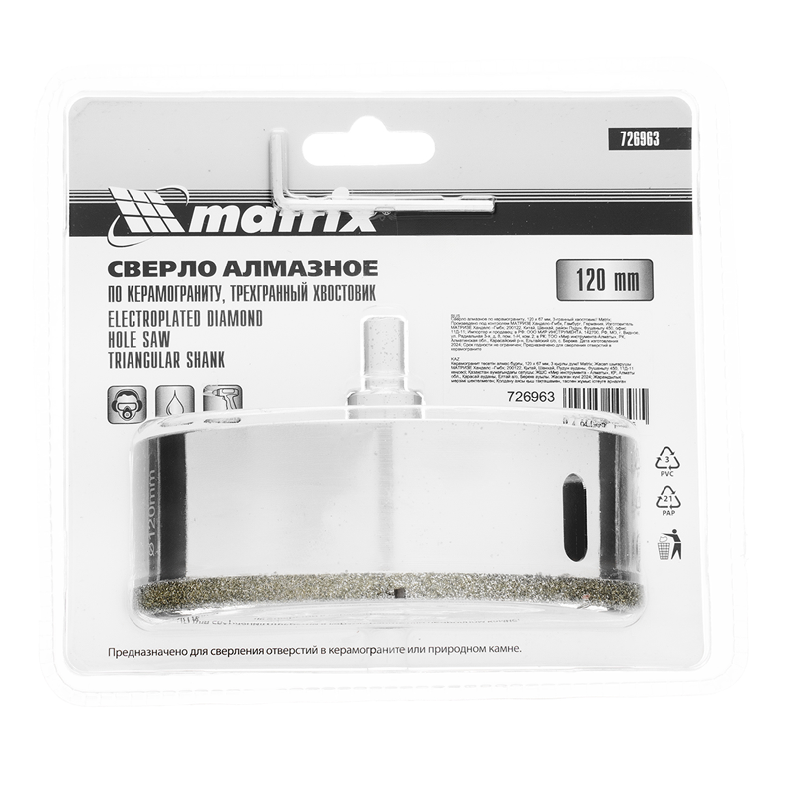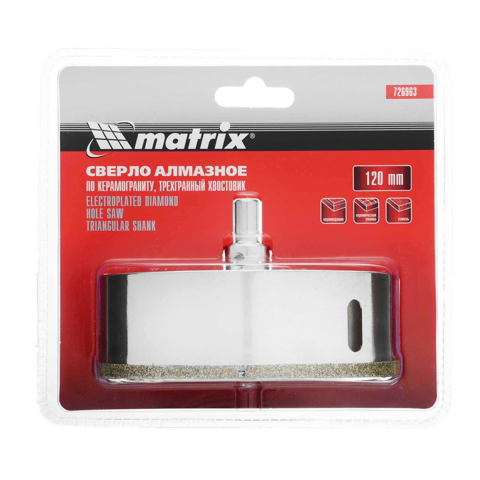 Универсальное алмазное сверло по керамограниту Matrix 726963 размером 120 х 67 мм, с 3-гранным хвостовиком, применяется для получения отверстий в стекле, плитке, кафеле. За счет высокой концентрации алмазов в режущем слое оно легко справляется со сверлением керамогранита. Сверло рассчитано на профессиональное использование с дрелями и шуруповертами. Водяное охлаждение в процессе работы значительно повышает срок службы оснастки.