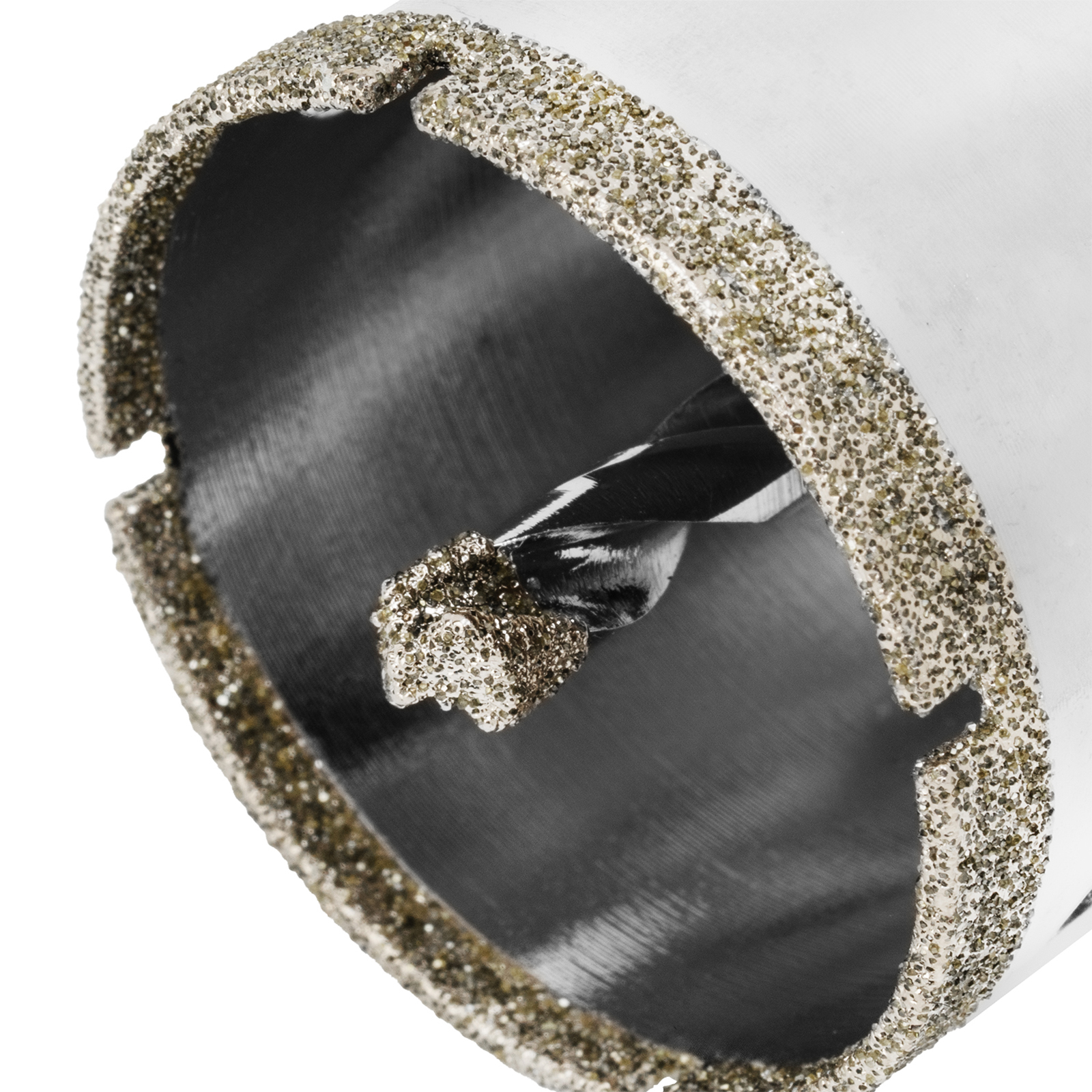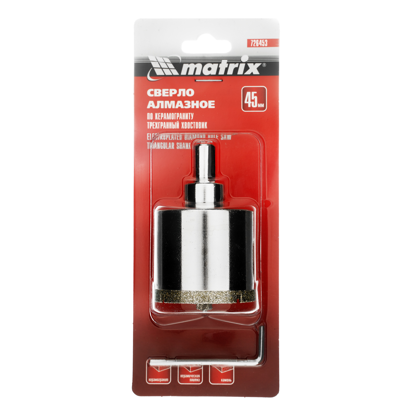 Универсальное алмазное сверло по керамограниту Matrix 726453 размером 45 х 67 мм, с 3-гранным хвостовиком, применяется для получения отверстий в стекле, плитке, кафеле. За счет высокой концентрации алмазов в режущем слое оно легко справляется со сверлением керамогранита. Сверло рассчитано на профессиональное использование с дрелями и шуруповертами. Водяное охлаждение в процессе работы значительно повышает срок службы оснастки.