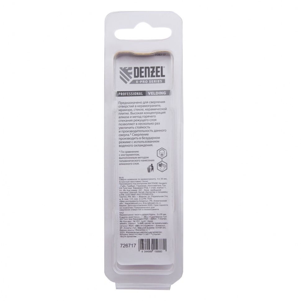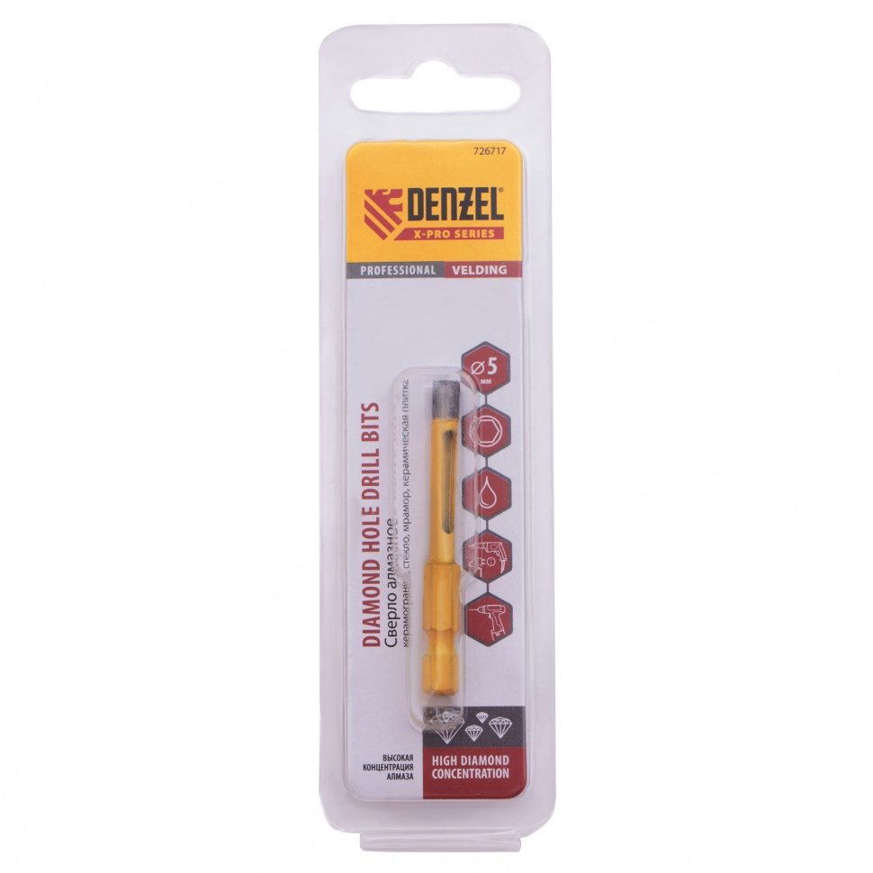 Алмазное сверло Denzel 726717 размером 5 х 35 мм, с шестигранным хвостовиком, — режущий инструмент для получения точных отверстий диаметром 5 мм. Подходит для работ по стеклу, керамике, а также керамограниту и мрамору. Используется в качестве оснастки для дрелей и шуруповертов. Сверление с применением водяного охлаждения позволит избежать перегрева сверла и продлить срок его службы. Использование кондуктора 72833 препятствует смещению коронки и облегчает засверливание. Оснастка предназначена для профессионального использования.