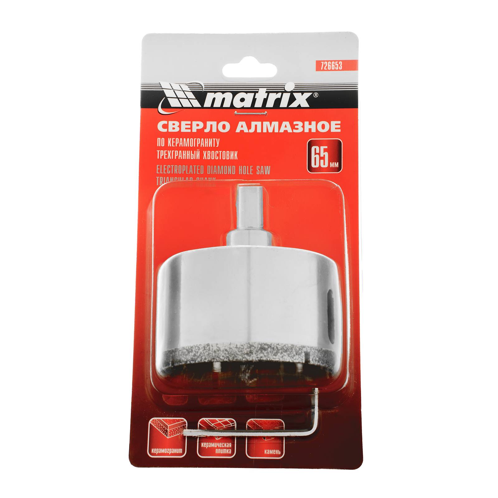 Универсальное алмазное сверло по керамограниту Matrix 726653 размером 65 х 67 мм, с 3-гранным хвостовиком, применяется для получения отверстий в стекле, плитке, кафеле. За счет высокой концентрации алмазов в режущем слое оно легко справляется со сверлением керамогранита. Сверло рассчитано на профессиональное использование с дрелями и шуруповертами. Водяное охлаждение в процессе работы значительно повышает срок службы оснастки.