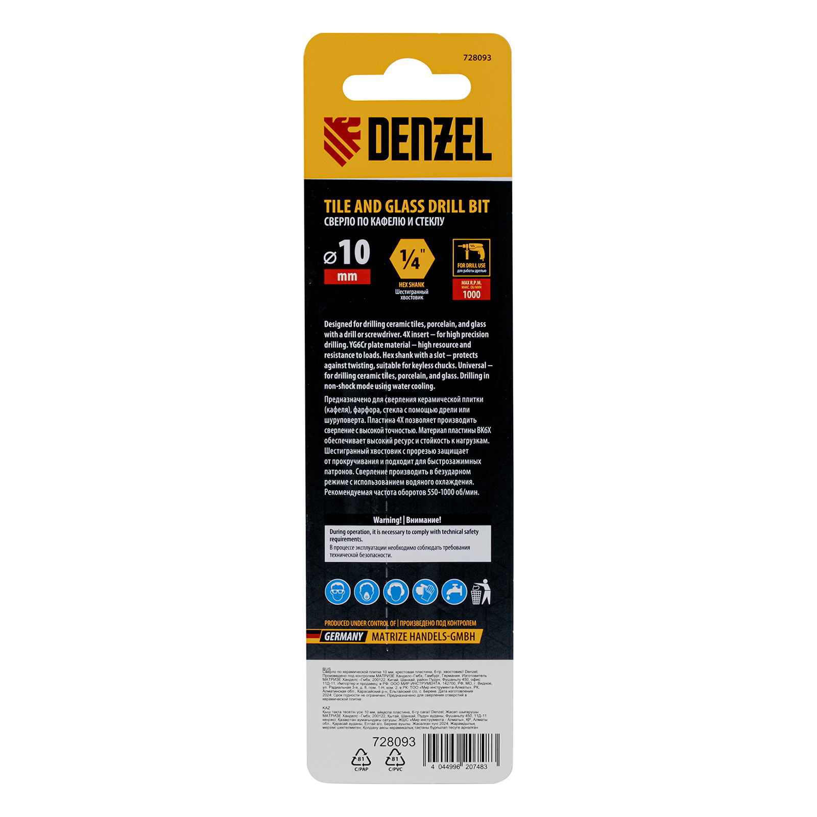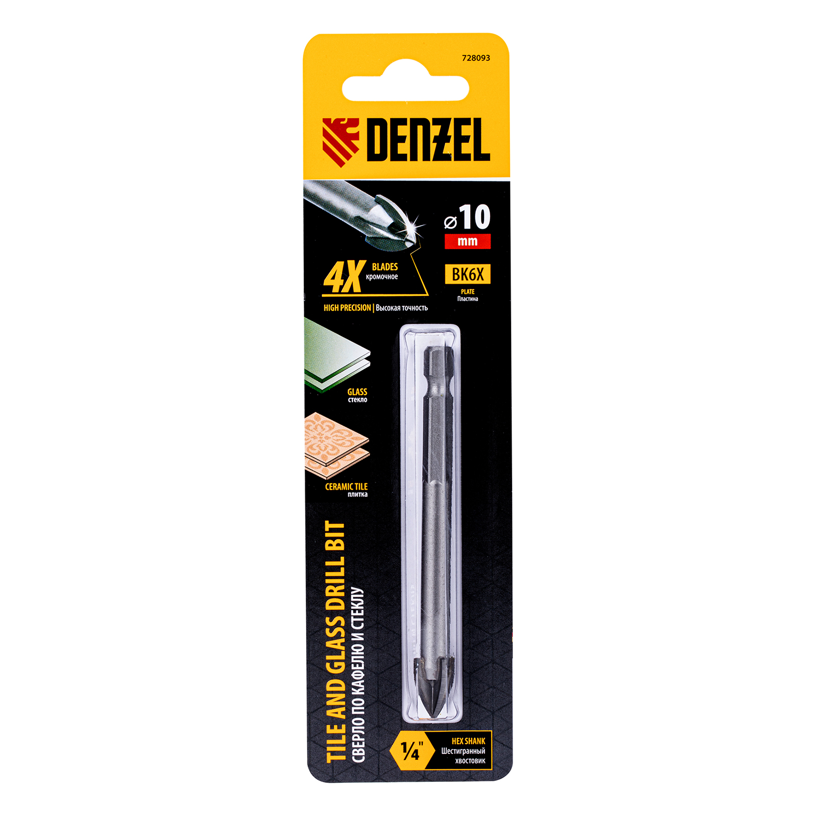 Сверло Denzel 728093 диаметром 10 мм, с крестовой пластиной и шестигранным хвостовиком, используется для сверления керамической плитки, стекла и других материалов с помощью дрели или шуруповерта. Четырехкромочная режущая пластина обеспечивает высокую скорость засверливания. Оснастка выдерживает высокие нагрузки и подходит для интенсивного профессионального использования.