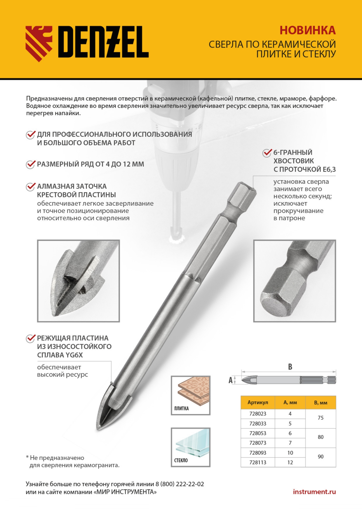 - Универсальность — одно сверло позволяет получать отверстия в керамической (кафельной) плитке, стекле, мраморе и фарфоре.